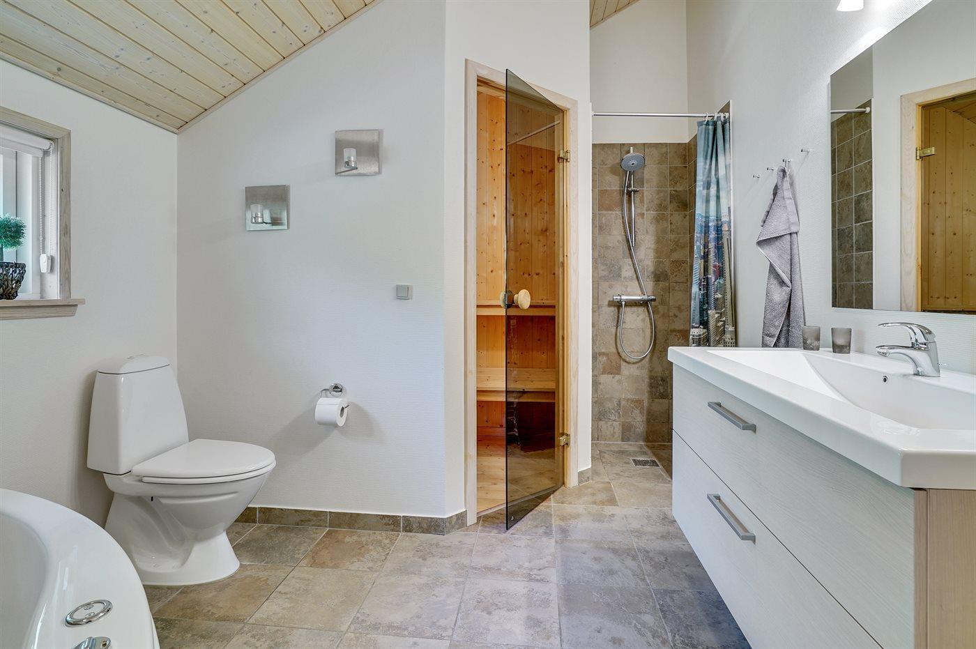 Er is 2 badkamers met douchehok en 2 toiletten. Er is vloerverwarming in 2 van de badkamers. De sauna biedt de gelegenheid tot ontspanning.