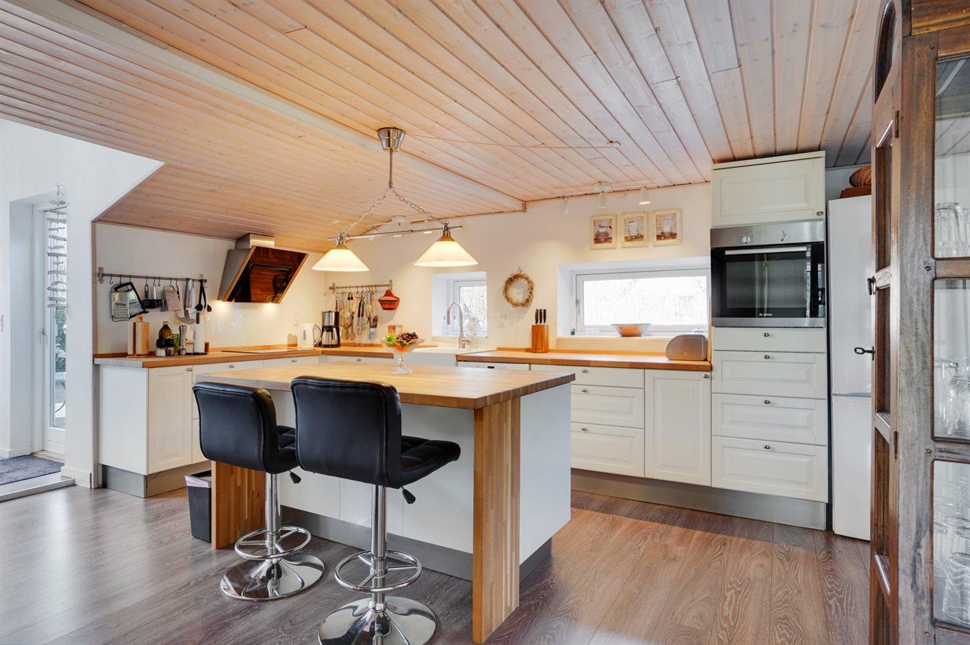 De keuken is uitgerust met koelkast. Extra koelkast aanwezig. Er zijn 4 keramische kookplaten, heteluchtoven, magnetron en vaatwasser.