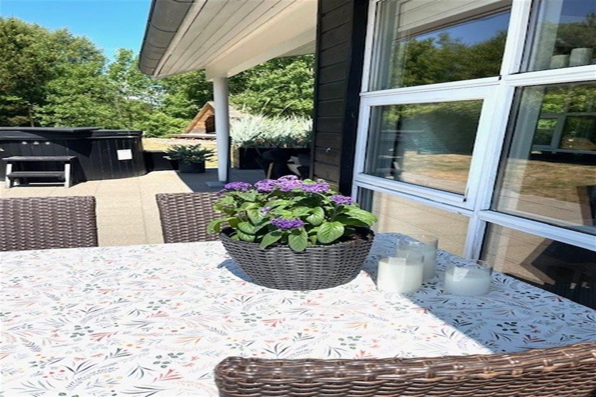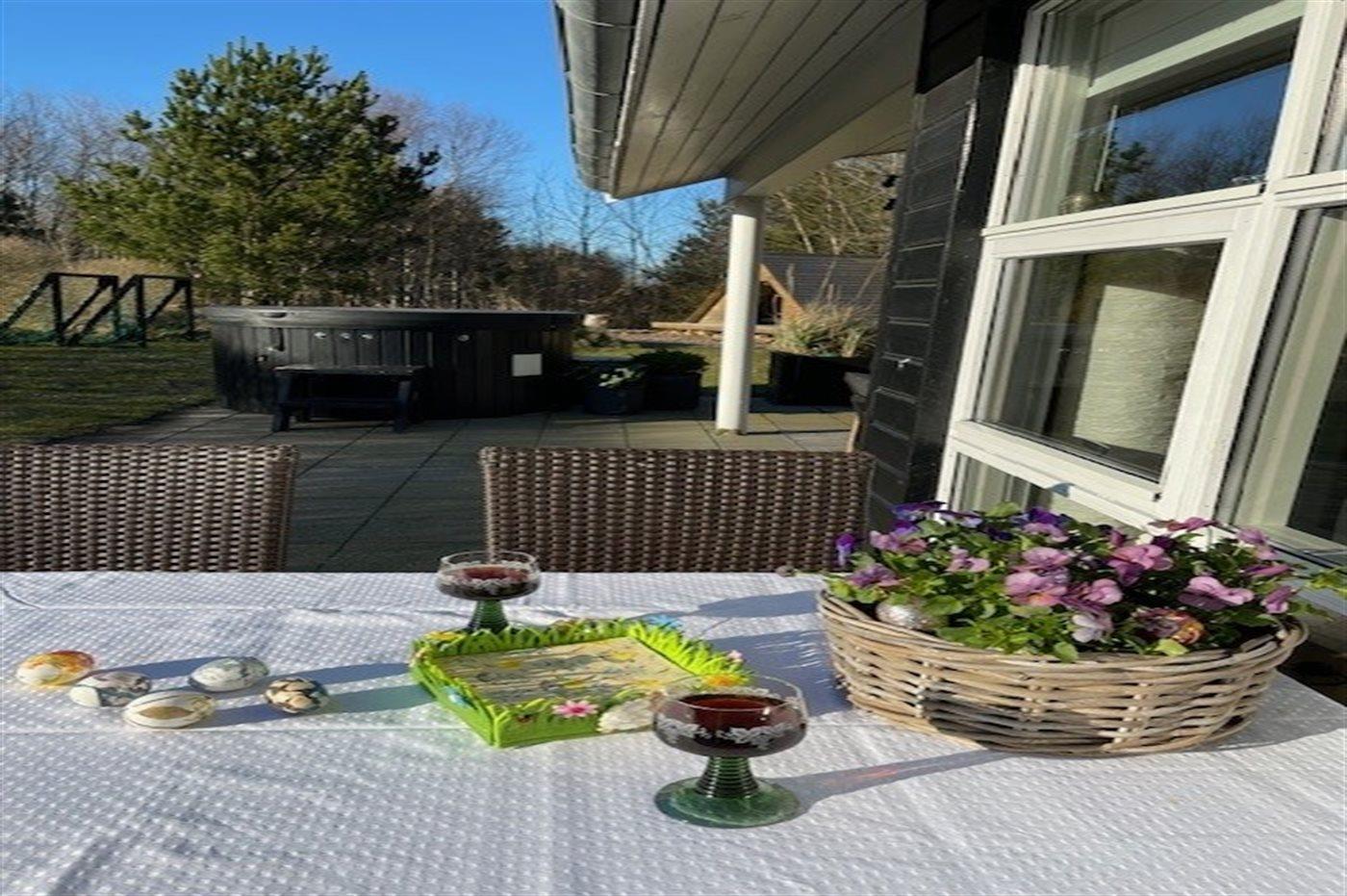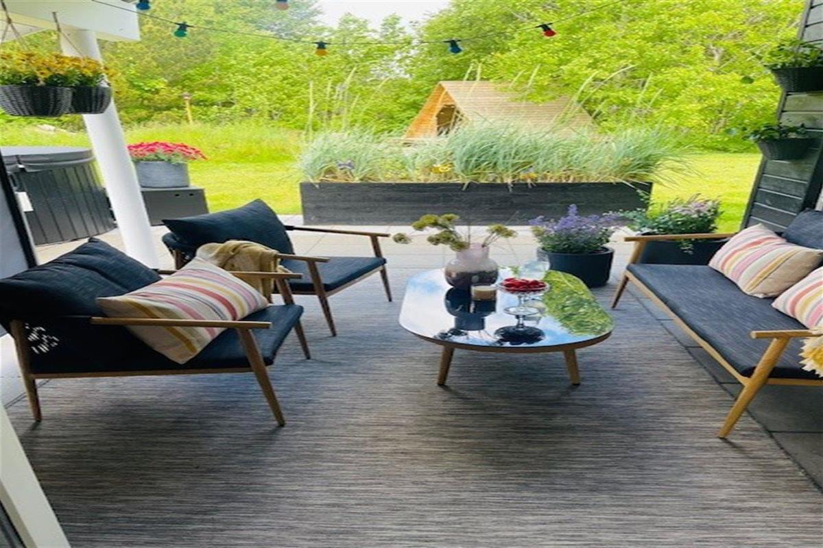 De vakantiewoning is gelegen op een 1050 m² groot aangelegde tuin. Afstand tot de zee 1900 m. Dichtstbijzijnde winkel 1600 m. Bij de vakantiewoning hoort terras. Daarnaast is er een overdekt terras. Zandbak. Voetbaldoel.Vuurplaats. Shelter. Barbecue. Parkeerplaats bij het huis.