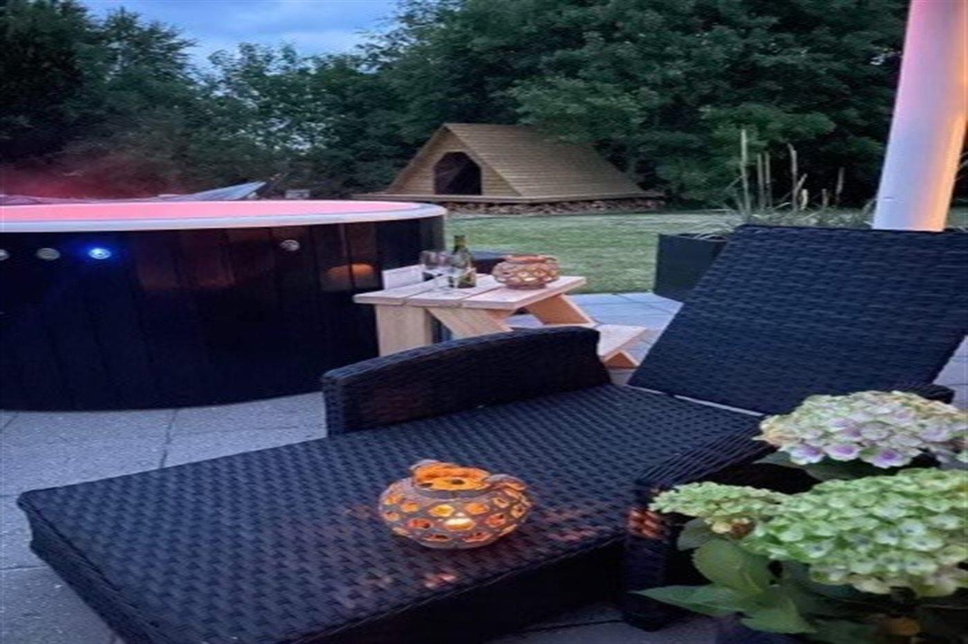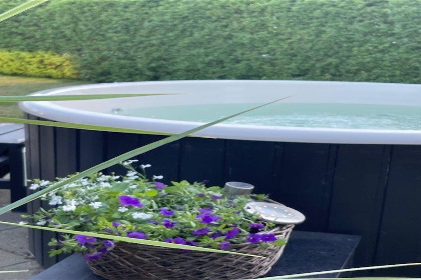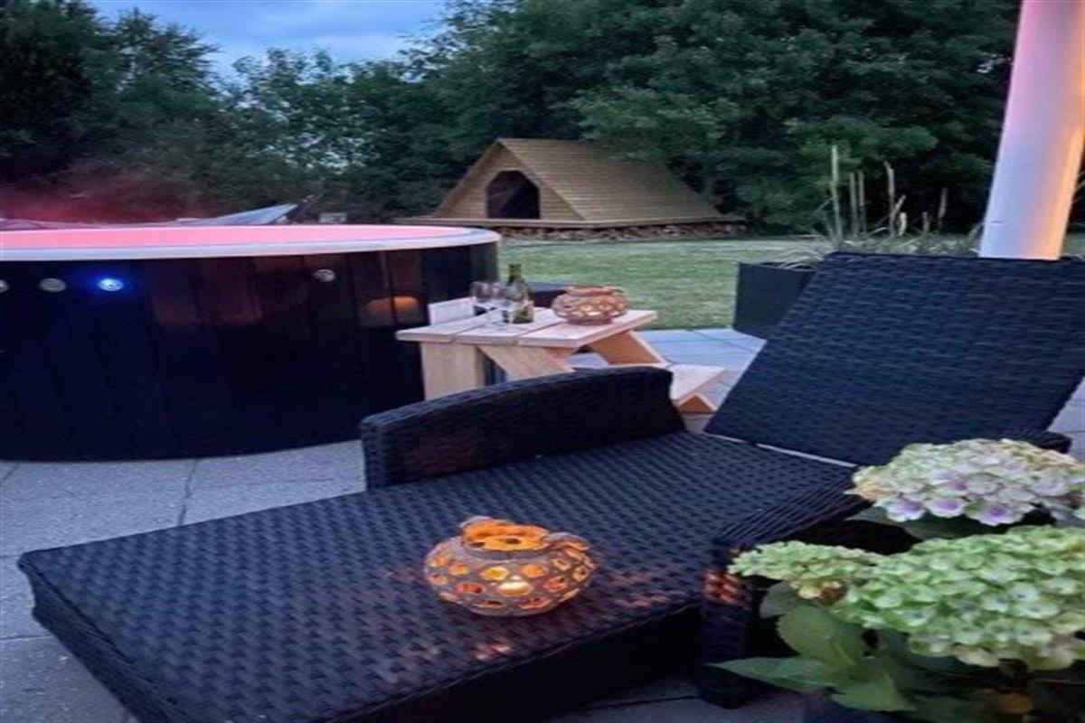 Het binnenbubbelbad (vulwater) biedt ontspanning aan 2 personen. Het buitenbubbelbad (standwater) biedt ontspanning aan 5 personen.