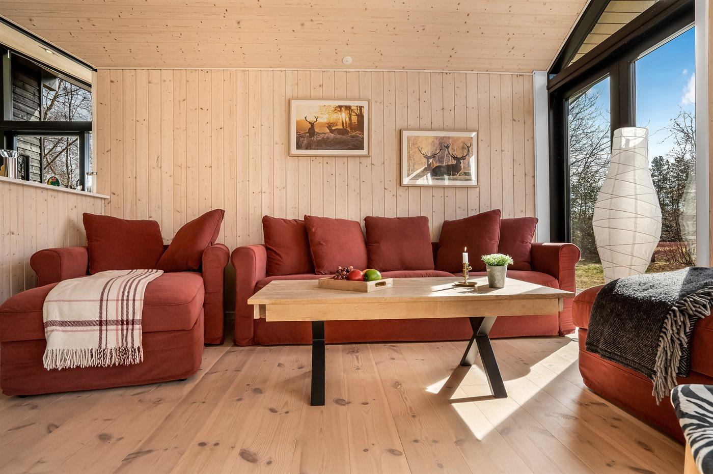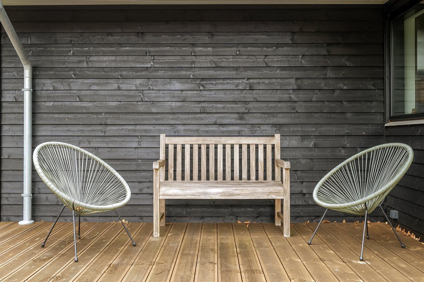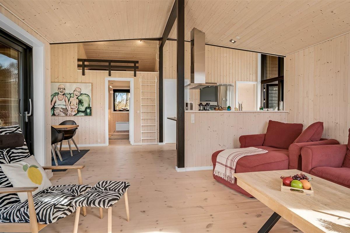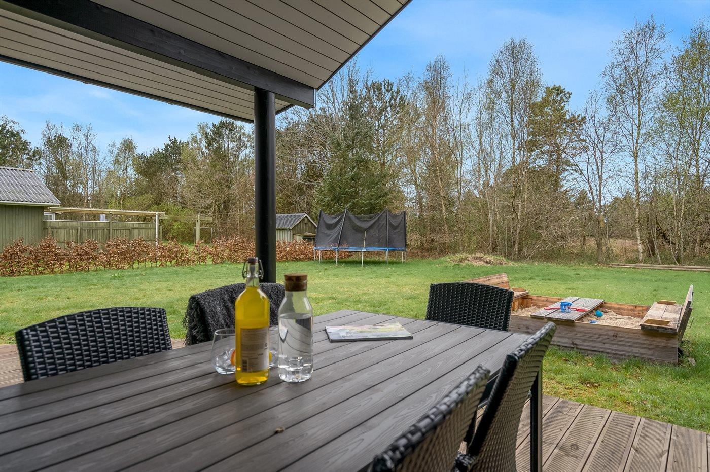 De vakantiewoning is gelegen op een 1300 m² groot aangelegde tuin. Afstand tot de zee 1500 m. Afstand tot de fjord 7500 m. Dichtstbijzijnde winkel 890 m. Er is een golfbaan op een afstand van 6400 m. Bij de vakantiewoning hoort terras. Daarnaast is er een overdekt terras. Zandbak. Trampoline.Vuurplaats. Barbecue. Het huis heeft een stopcontact voor het opladen van een elektrische auto. Parkeerplaats bij het huis.