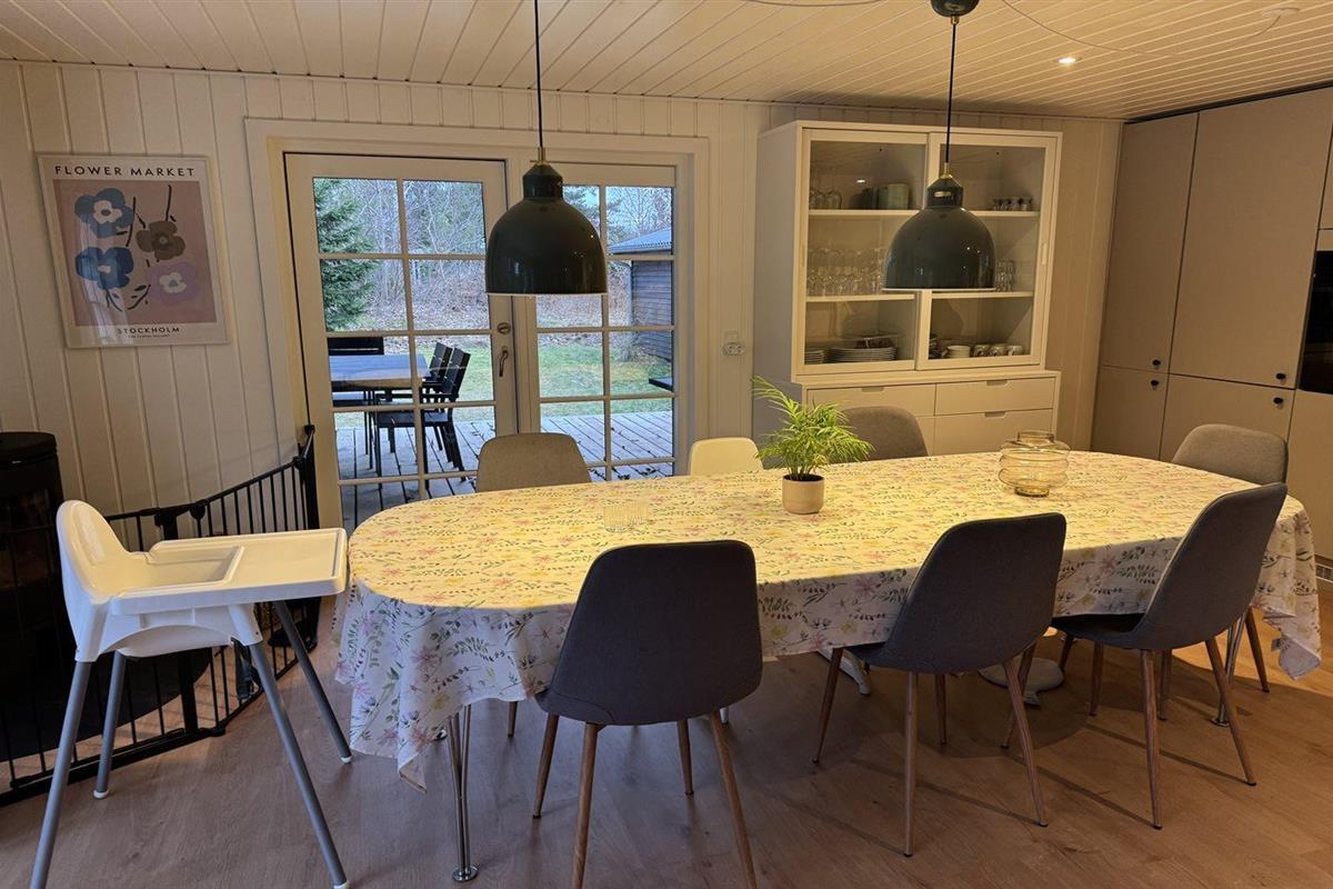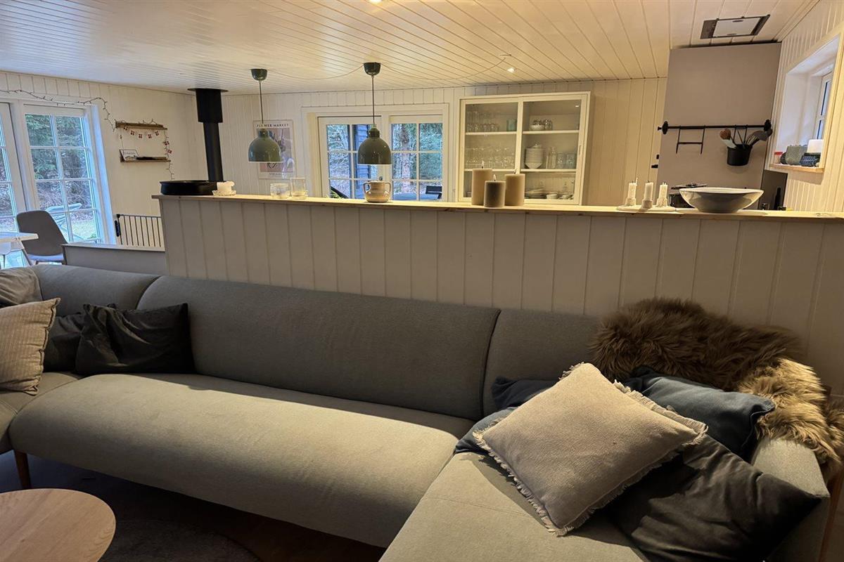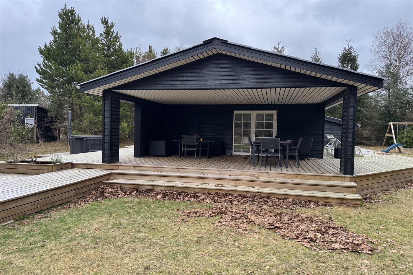 De vakantiewoning is gelegen op een 1503 m² groot aangelegde tuin. Afstand tot de zee 1200 m. Afstand tot de fjord 7580 m. Dichtstbijzijnde winkel 540 m. Er is een golfbaan op een afstand van 4050 m. Bij de vakantiewoning hoort terras. Daarnaast is er een overdekt terras. Schommel. Zandbak. Glijbaan.Vuurplaats. Buitendouche. Barbecue. Parkeerplaats bij het huis.