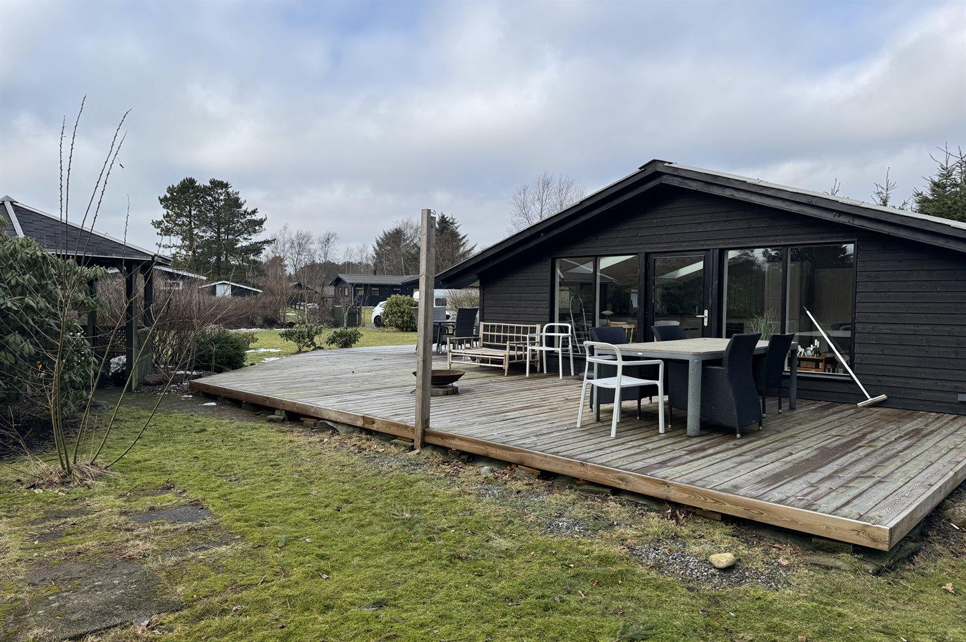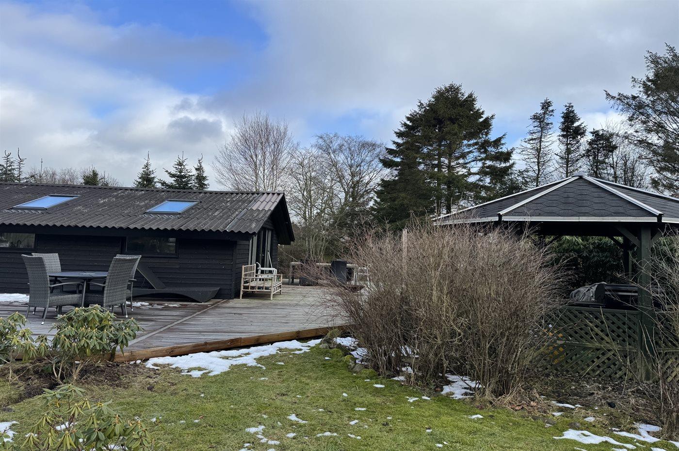 De vakantiewoning is gelegen op een 1251 m² groot aangelegde tuin. De grond is omheind. Afstand tot de zee 1320 m. Afstand tot de fjord 5960 m. Dichtstbijzijnde winkel 1650 m. Er is een golfbaan op een afstand van 5350 m. Bij de vakantiewoning hoort terras.Vuurplaats. Barbecue. Parkeerplaats bij het huis.