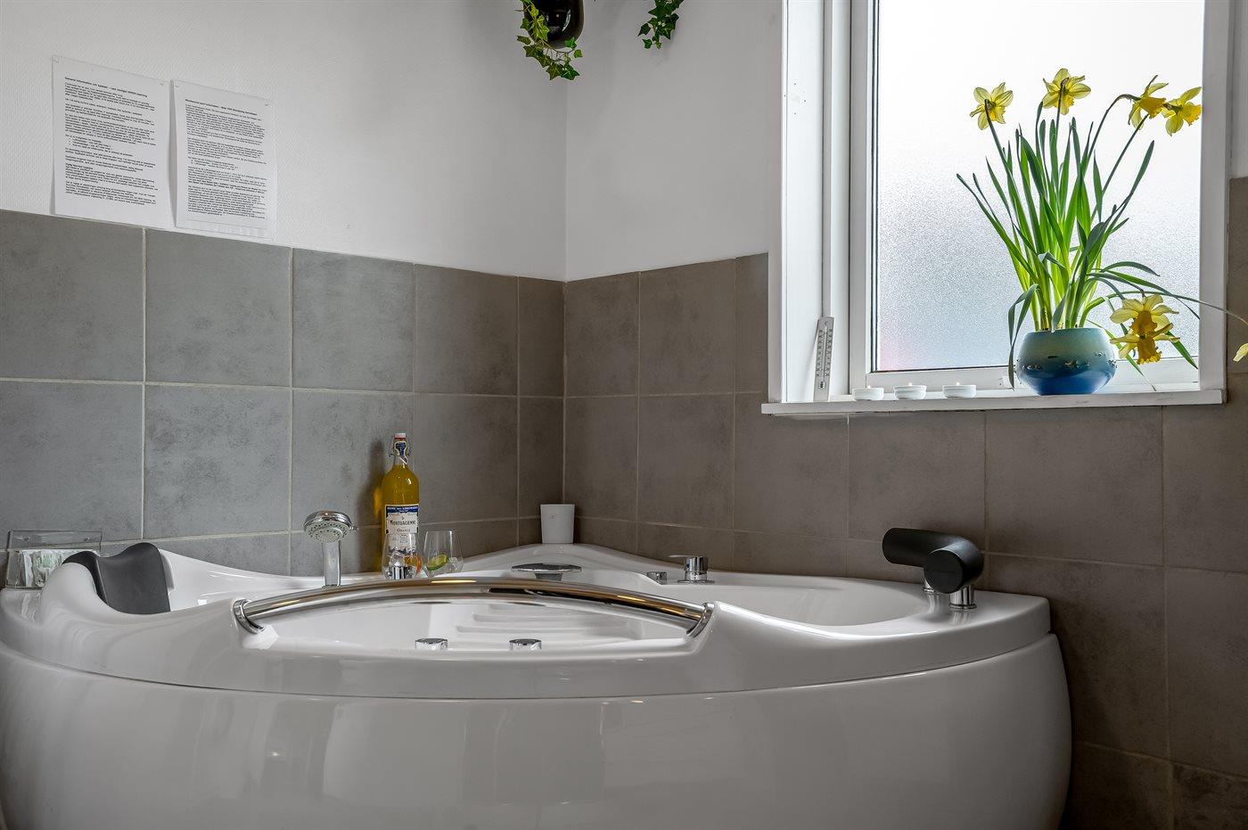 Het binnenbubbelbad (vulwater) biedt ontspanning aan 2 personen.