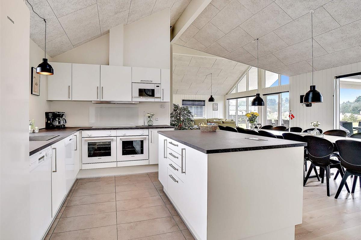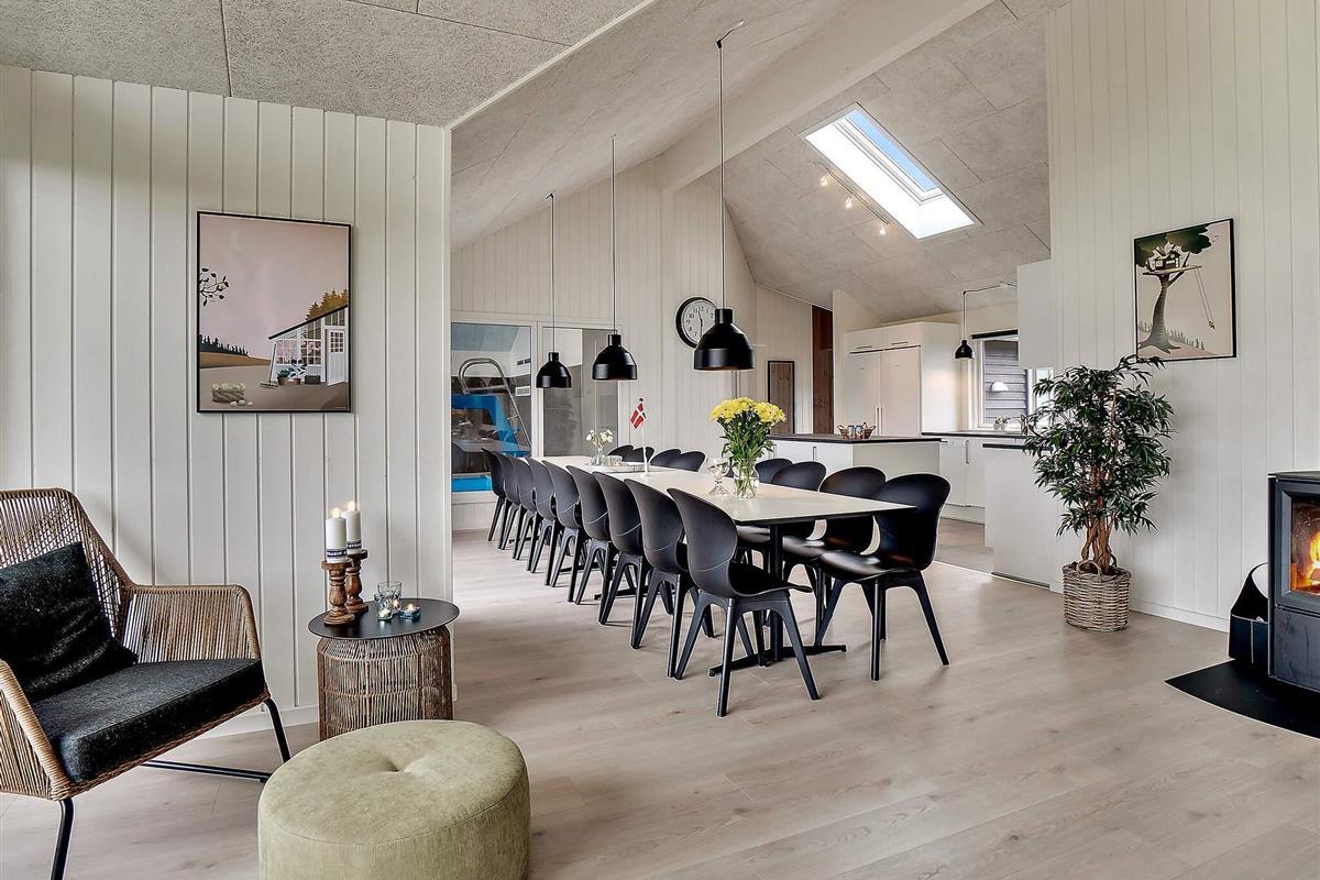 Der Ess- und Wohnbereich ist geschmackvoll eingerichtet sowie mit Stereoanlage mit CD-Spieler, TV, Hochstuhl, Sofaecke und Holzofen ausgestattet. Das knisternde Feuer des Holzofens lädt am Ende des Tages zum gemütlichen Beisammensein ein. In der gut ausgestatteten Küche befinden sich u.a. ein großer Kühlschrank, ein 240 l Gefrierschrank, zwei Backöfen sowie zwei Geschirrspüler, sodass das Kochen für bis zu 18 Personen und der anschließende Abwasch zügiger von der Hand gehen können. Das Haus wird mittels Elektro-Heizung und energieeffizienter Wärmepumpe beheizt.