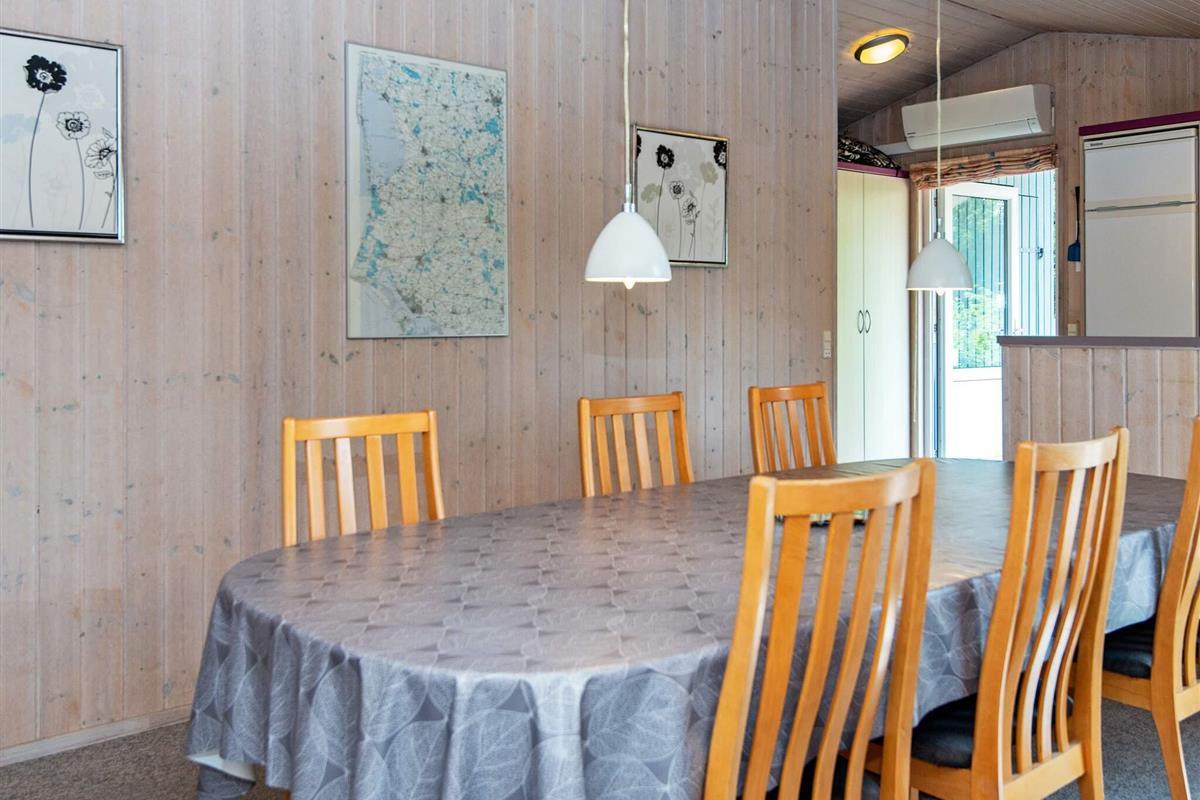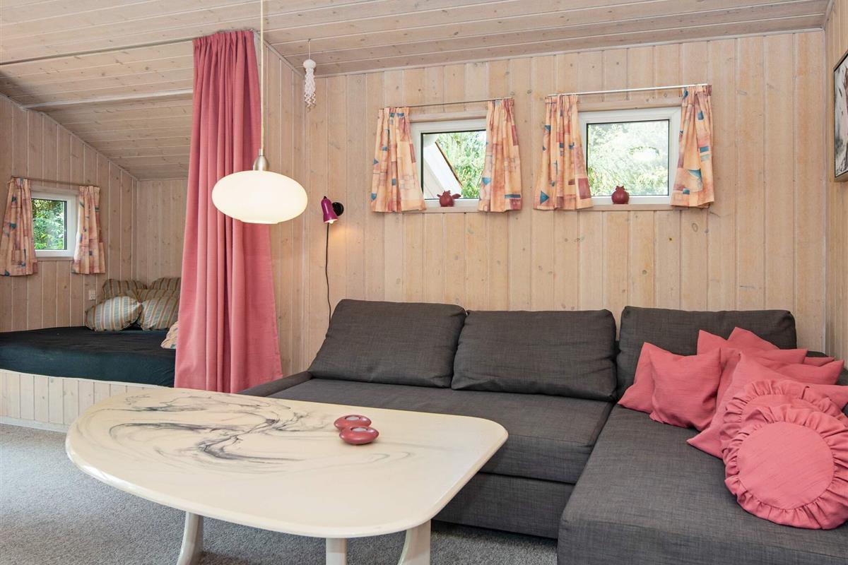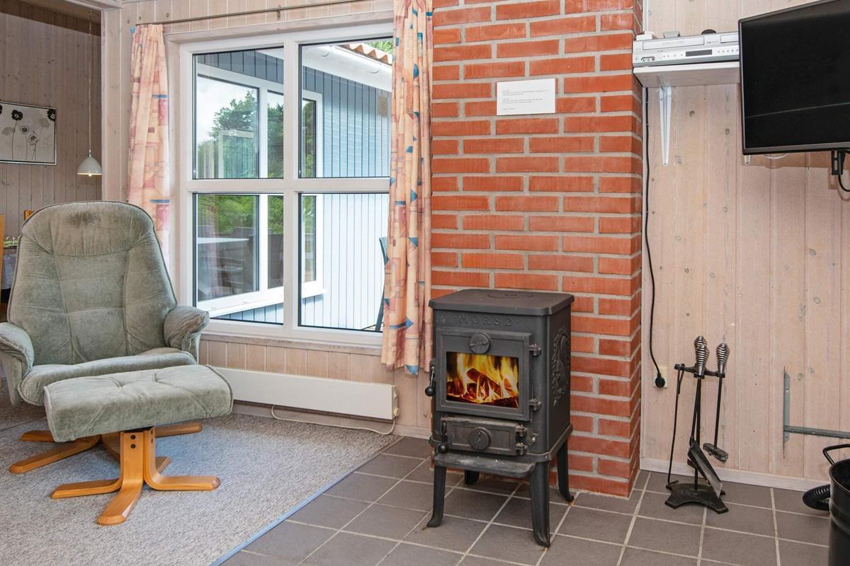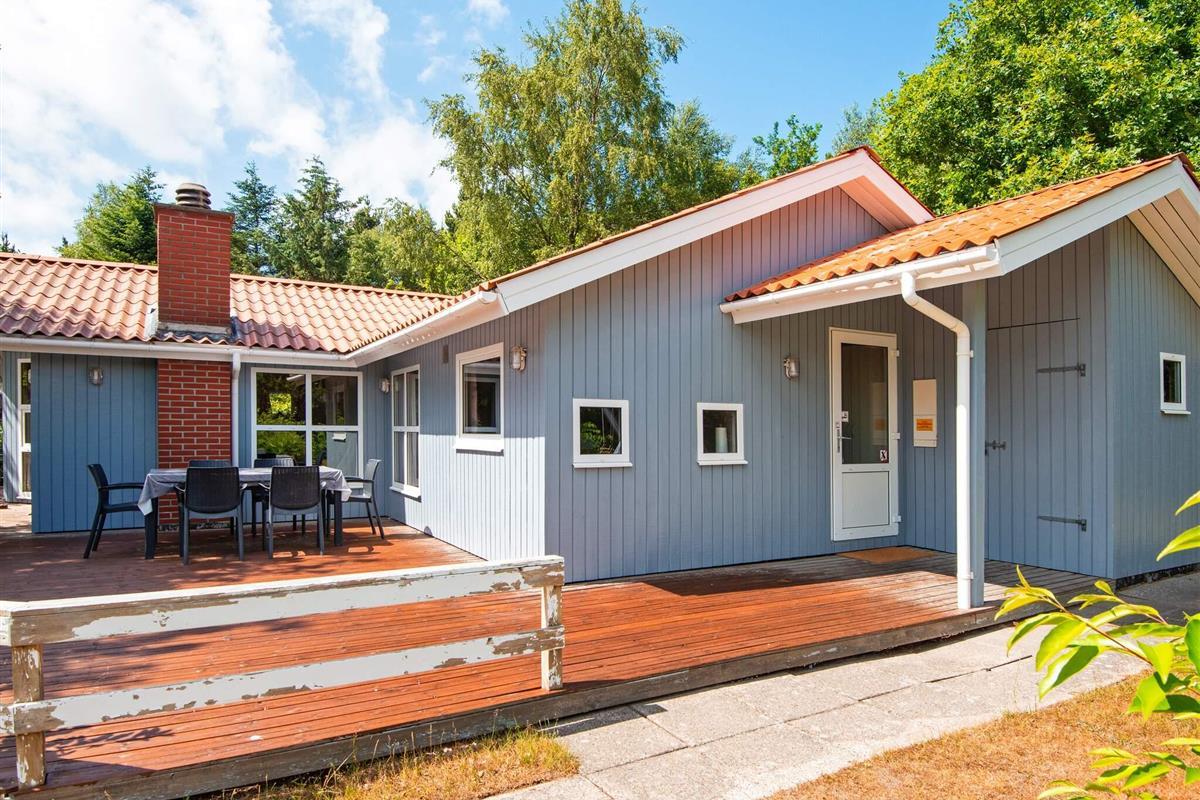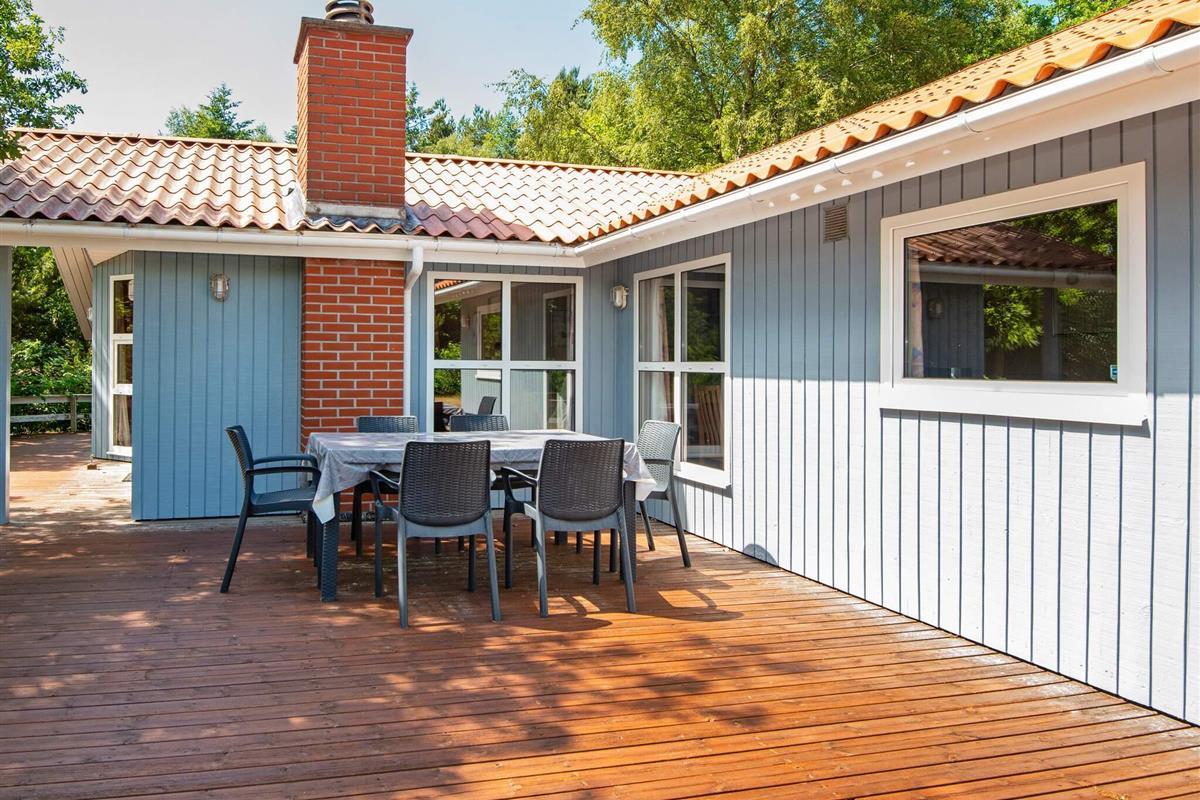 Auf einem teilweise eingezäunten und gut abgeschirmten Naturgrundstück mit Bäumen findet man mitten im kleinen Ferienort Houstrup dieses ältere Ferienhaus. Es ist von einer großen Holzterrasse umgeben, auf der man wahlweise eine sonnige oder schattige Sitzecke finden kann.