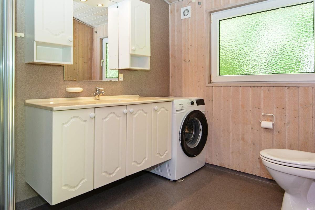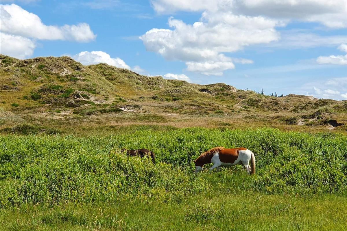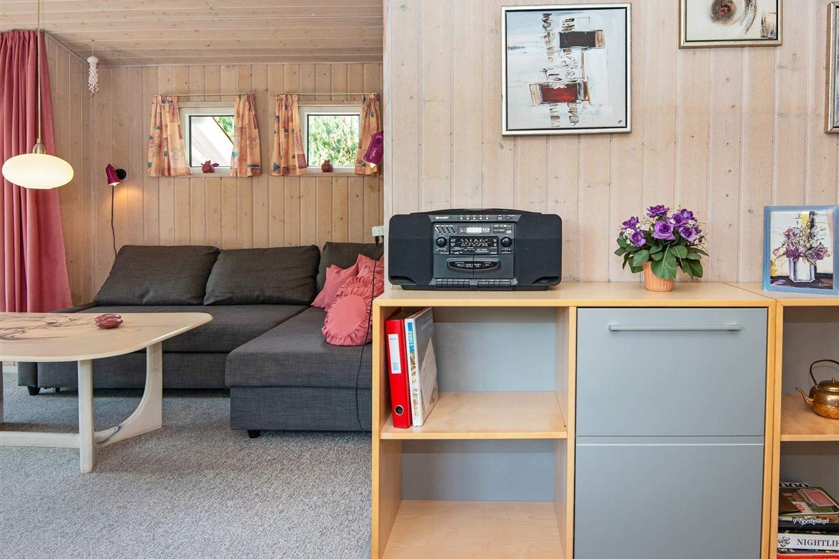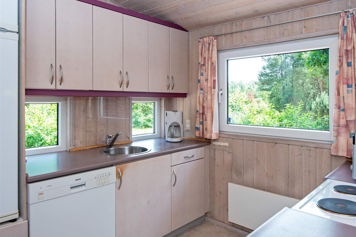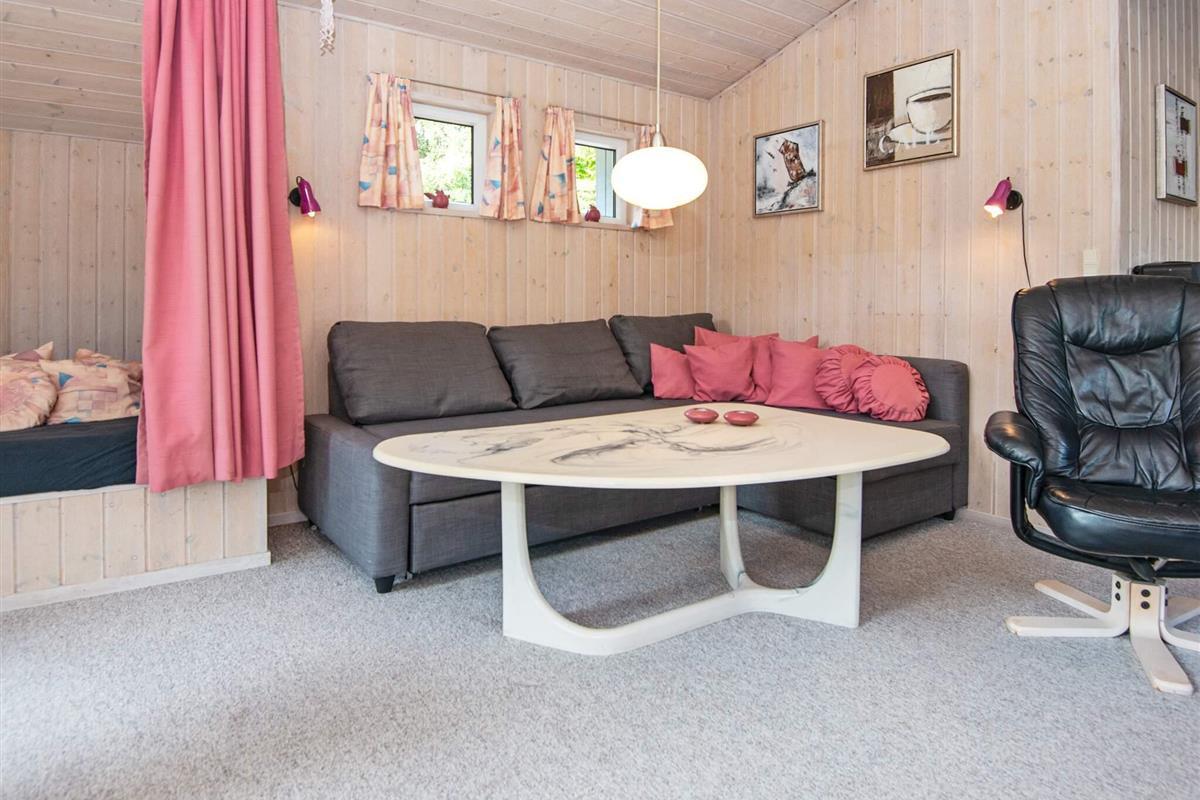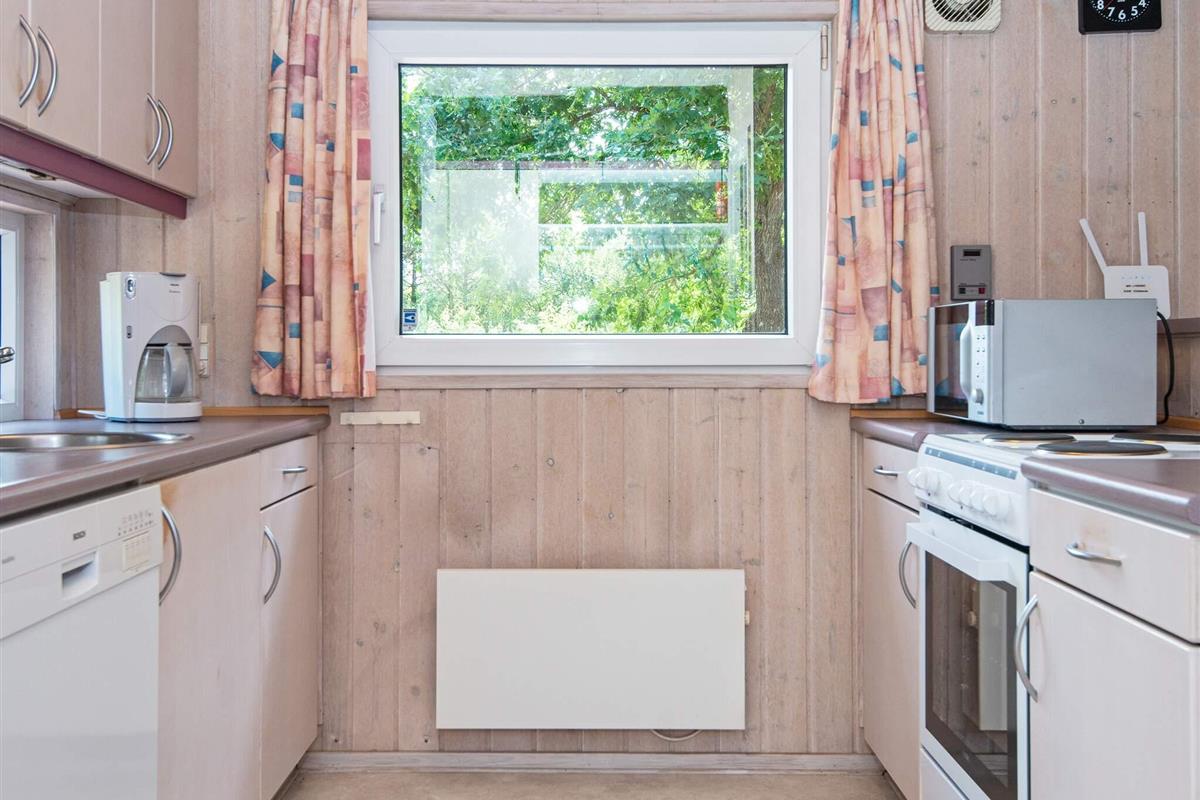 Auf einem teilweise eingezäunten und gut abgeschirmten Naturgrundstück mit Bäumen findet man mitten im kleinen Ferienort Houstrup dieses ältere Ferienhaus. Es ist von einer großen Holzterrasse umgeben, auf der man wahlweise eine sonnige oder schattige Sitzecke finden kann.