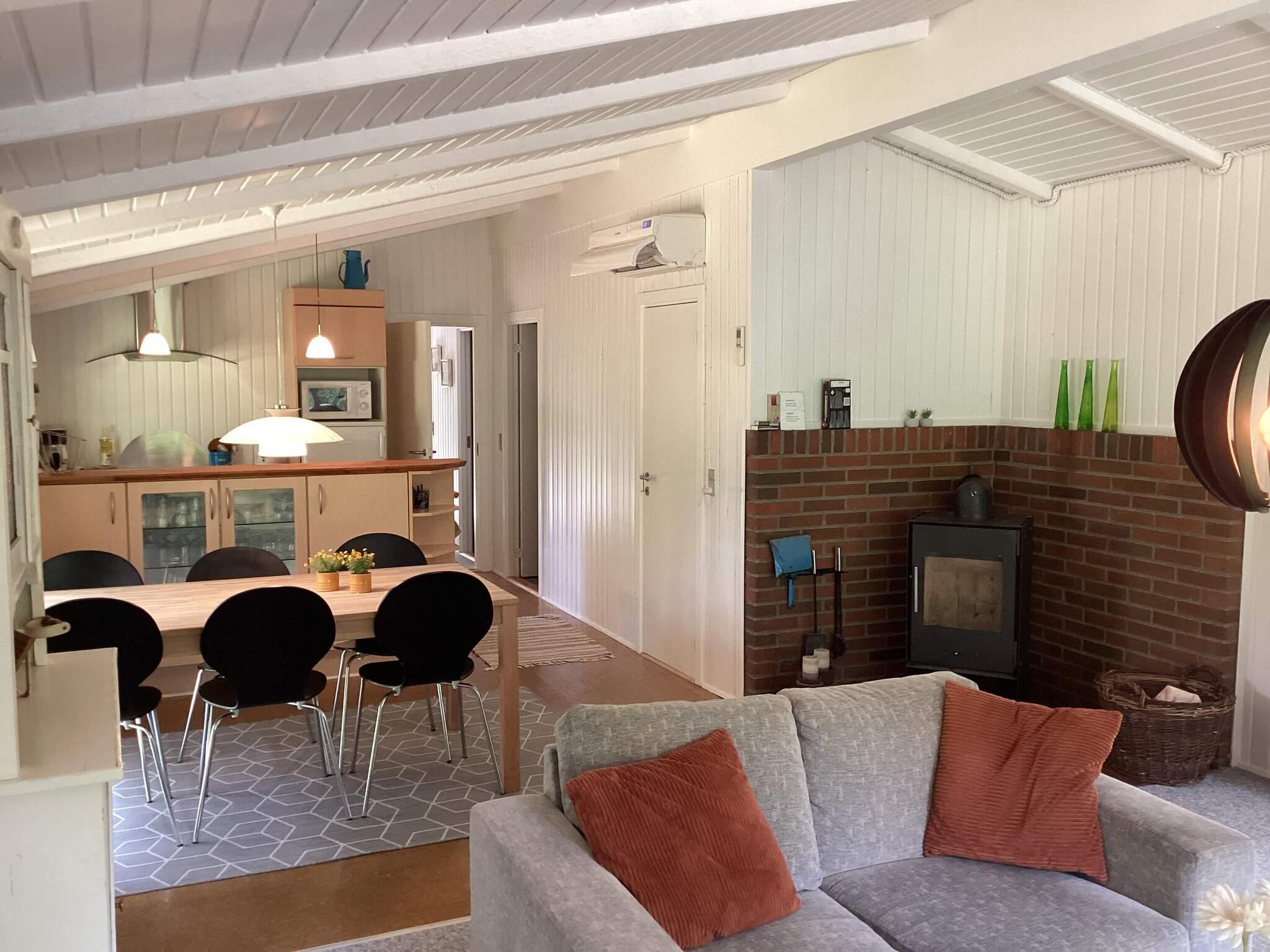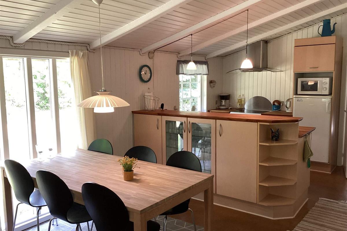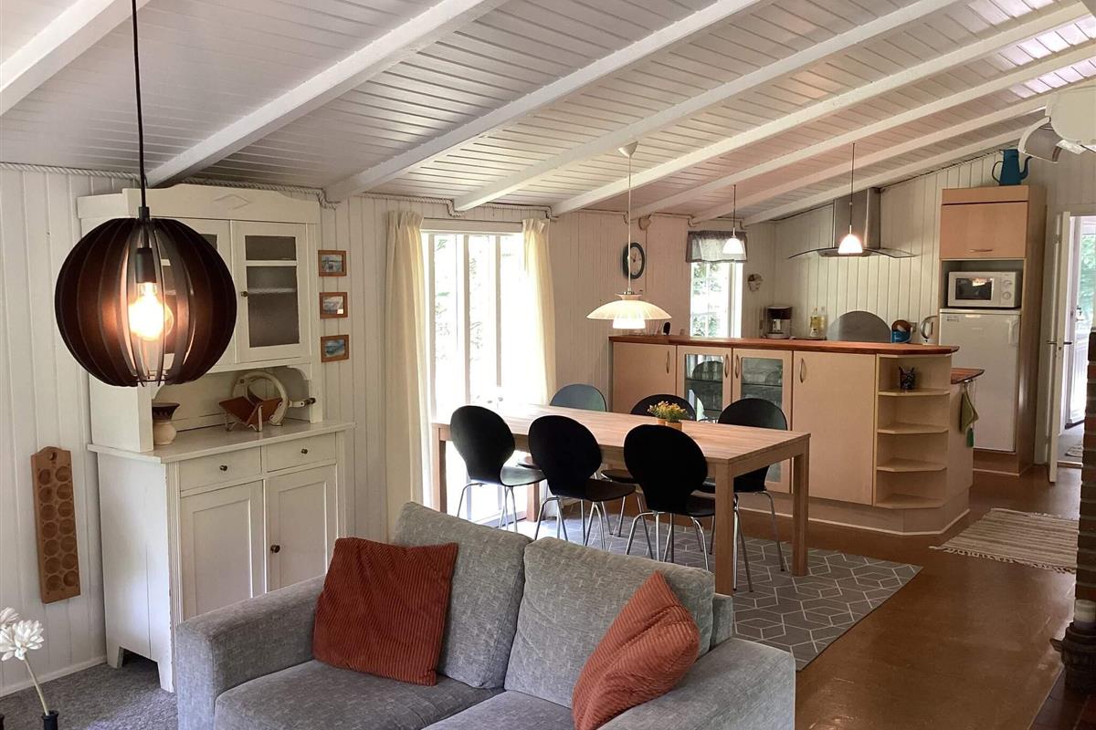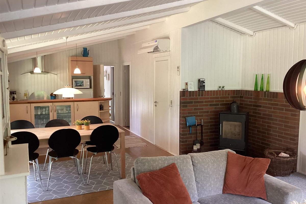 Das Ferienhaus hat einen offenen Küchen-/Wohnbereich mit Essecke. Die Küche ist durch eine Theke leicht vom Ess- und Wohnbereich abgetrennt. Von Esstisch und der Sitzecke hat man Ausblick in die grüne Umgebung. Im Anschluss an die gemütliche Sitzecke steht auch ein Kaminofen, der an kühleren Tagen für wohlige Wärme sorgt. Die Küchenausstattung ist zeitgemäß. Zur technischen Ausstattung des Hauses gehören SAT-Empfänger mit deutschen Sendern, DVD-Spieler und WLAN. Die größere Fensterfront im Wohnzimmer lässt viel Tageslicht herein.