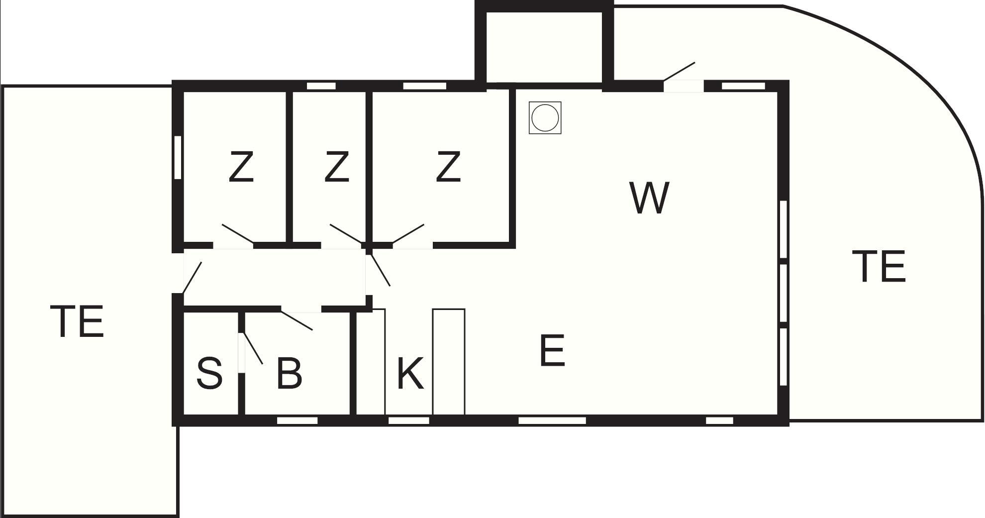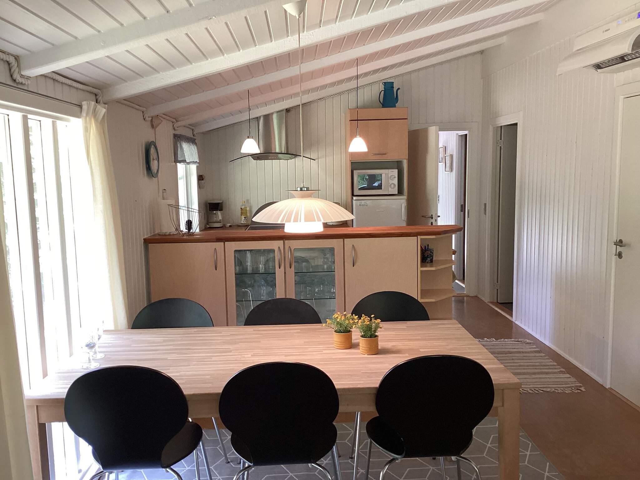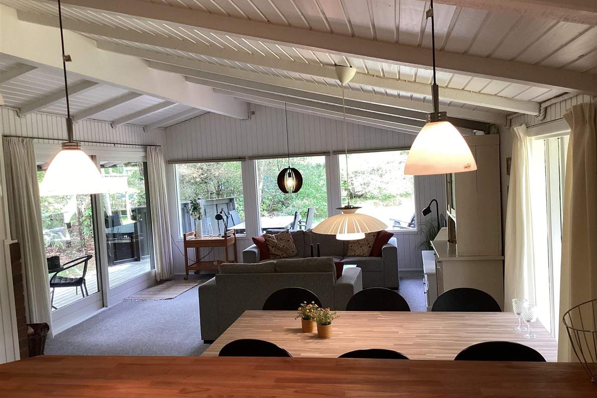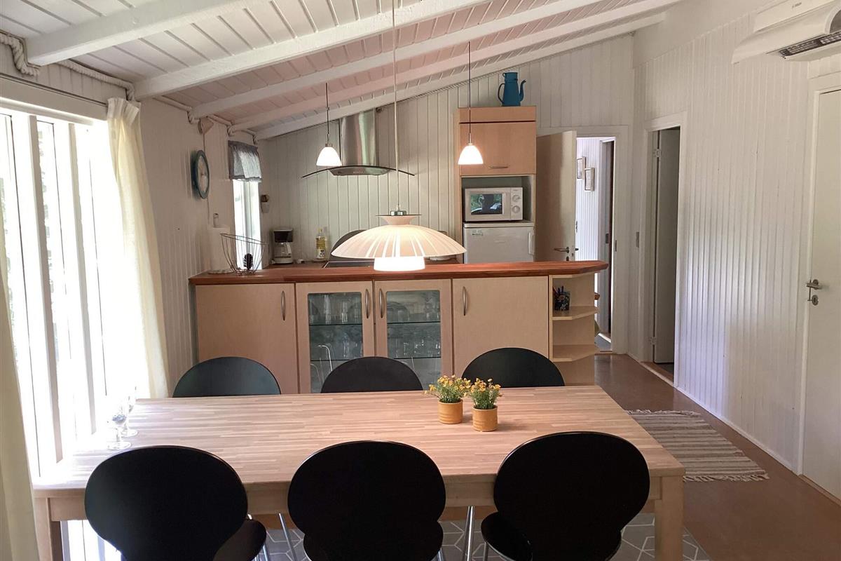 Das Ferienhaus hat einen offenen Küchen-/Wohnbereich mit Essecke. Die Küche ist durch eine Theke leicht vom Ess- und Wohnbereich abgetrennt. Von Esstisch und der Sitzecke hat man Ausblick in die grüne Umgebung. Im Anschluss an die gemütliche Sitzecke steht auch ein Kaminofen, der an kühleren Tagen für wohlige Wärme sorgt. Die Küchenausstattung ist zeitgemäß. Zur technischen Ausstattung des Hauses gehören SAT-Empfänger mit deutschen Sendern, DVD-Spieler und WLAN. Die größere Fensterfront im Wohnzimmer lässt viel Tageslicht herein.