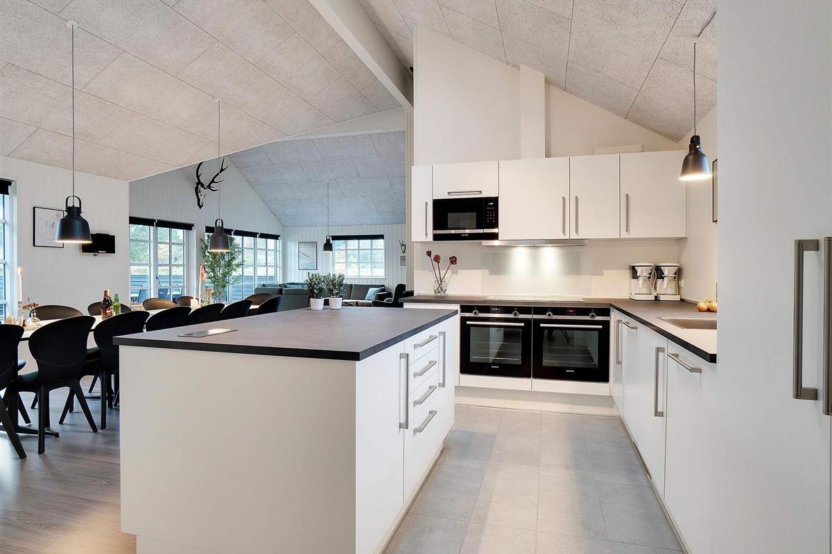 Der geräumige Wohnbereich ist mit einer gemütlichen Sitzecke vor dem Fernseher sowie einer langen Tafel für die gemeinsamen Mahlzeiten eingerichtet. Für kühlere Jahreszeitenn steht zusätzlich zur energieeffizienten Wärmepumpe auch ein Holzofen bereit. Die Küche ist stilvoll eingerichtet und zugleich umfassend ausgestattet, sodass die Mahlzeiten auch für eine größere Personenanzahl im Nu zubereitet werden können.