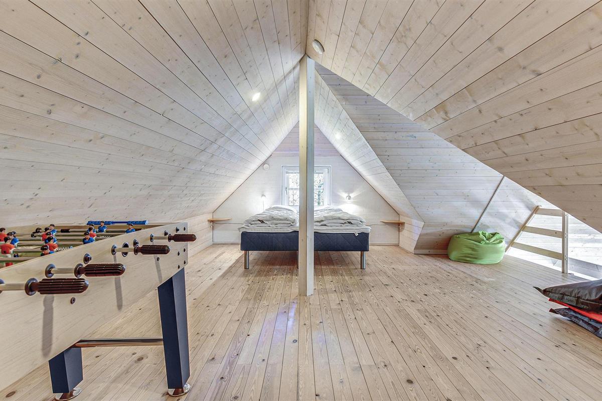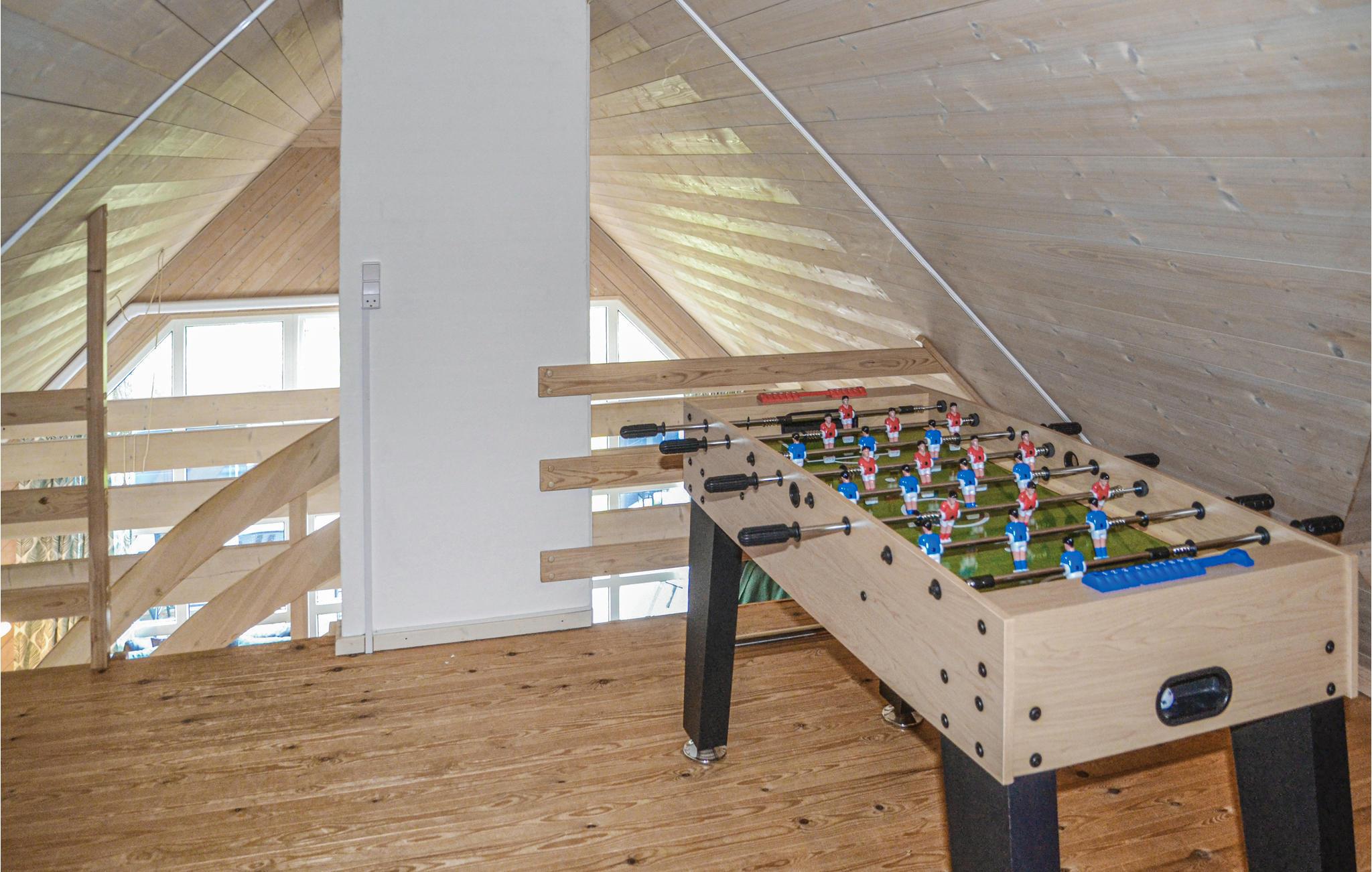 Boven, waar zich de ene slaapkamer bevindt, staat een tafelvoetbaltafel.