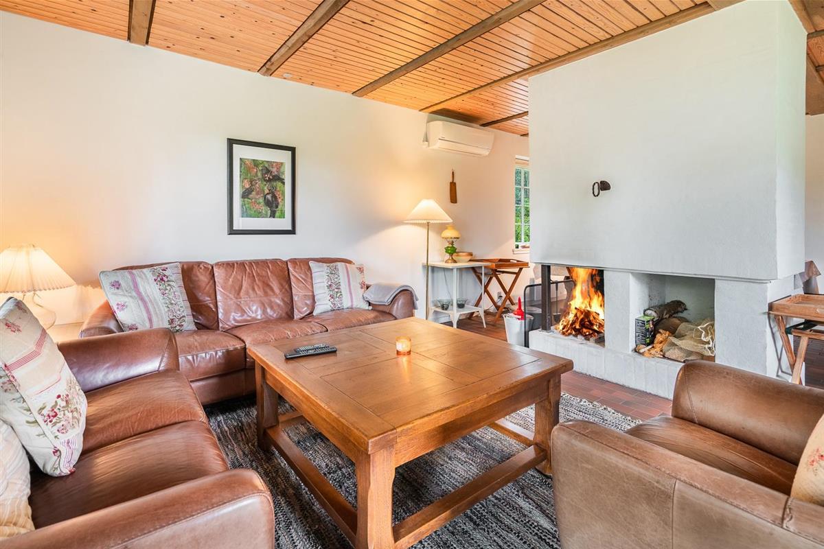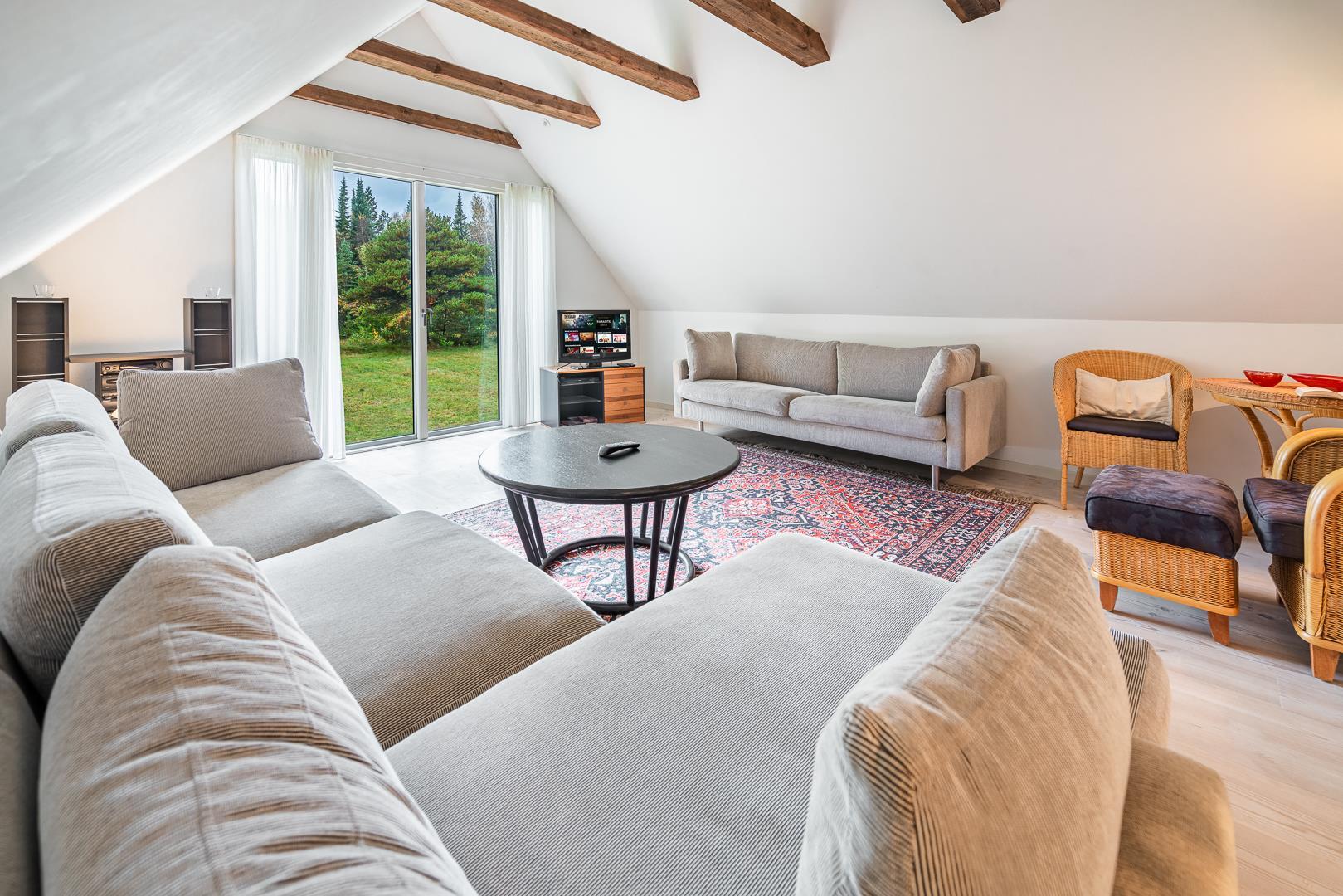 Der offene Wohnbereich ist das Herzstück des Ferienhauses – hier kannst du es dir auf dem Sofa gemütlich machen, während das Feuer im Kamin leise knistert und wohlige Wärme spendet. Unterstützt wird das behagliche Raumklima durch die moderne Wärmepumpe und die angenehme Fußbodenheizung, die dir auch an kühlen Tagen ein warmes Zuhause-Gefühl schenkt.