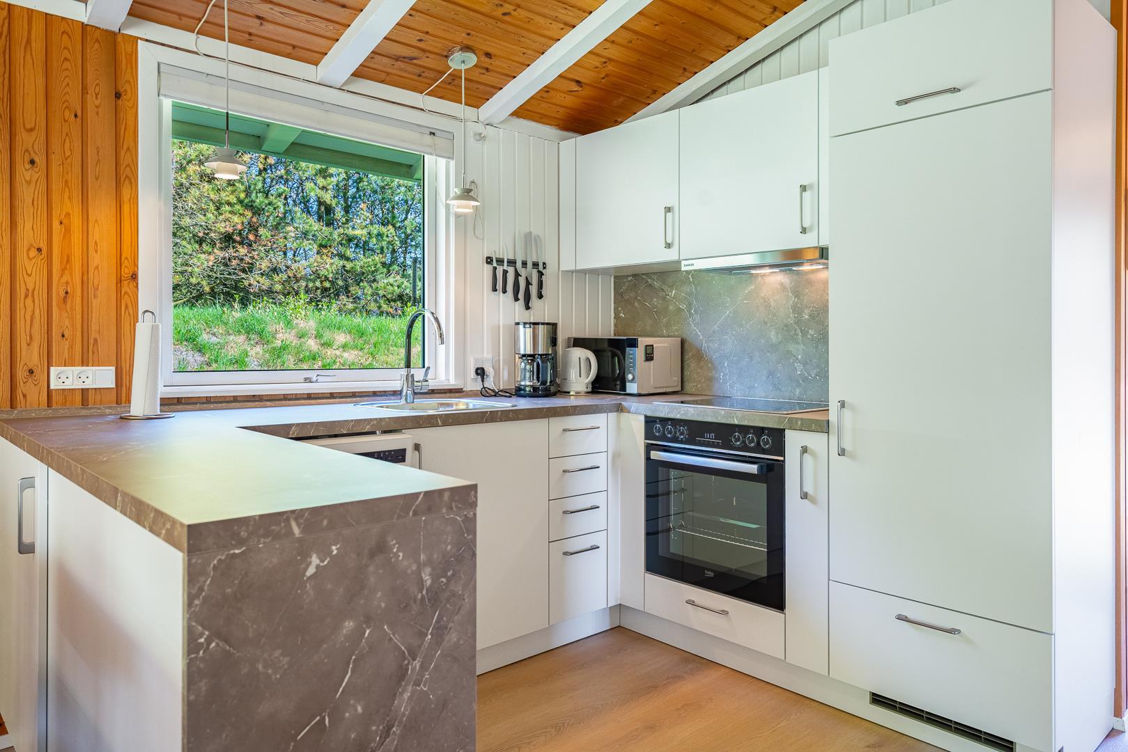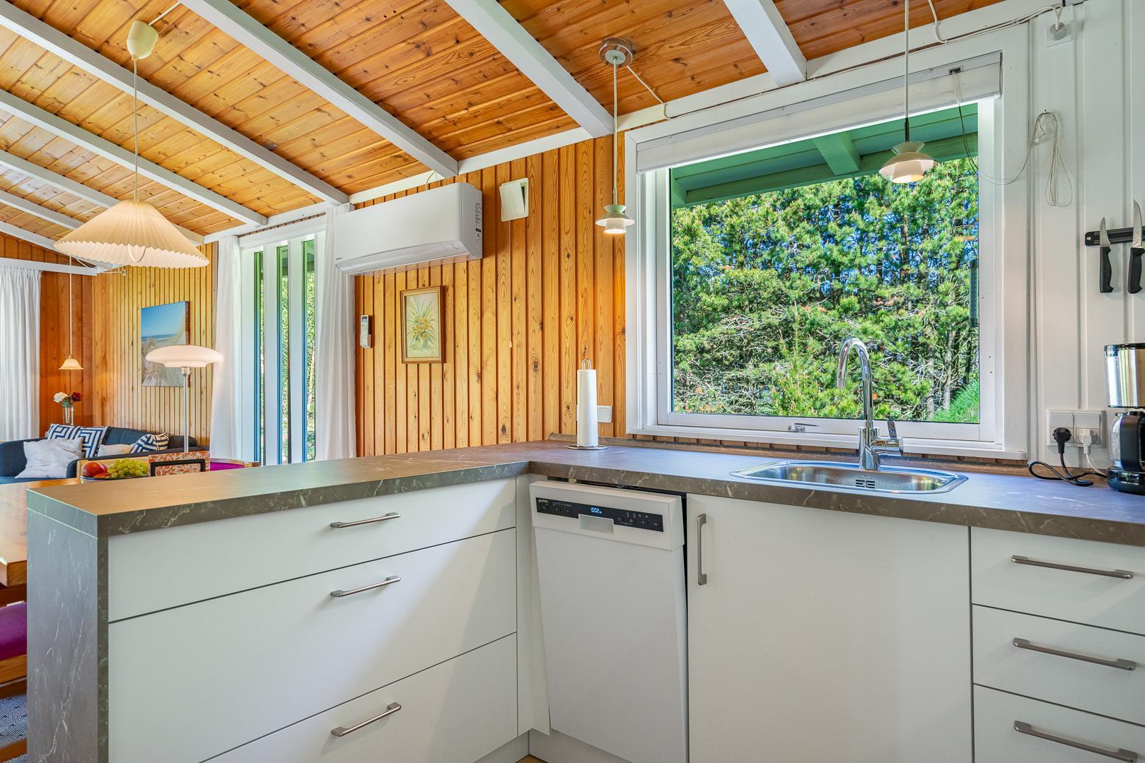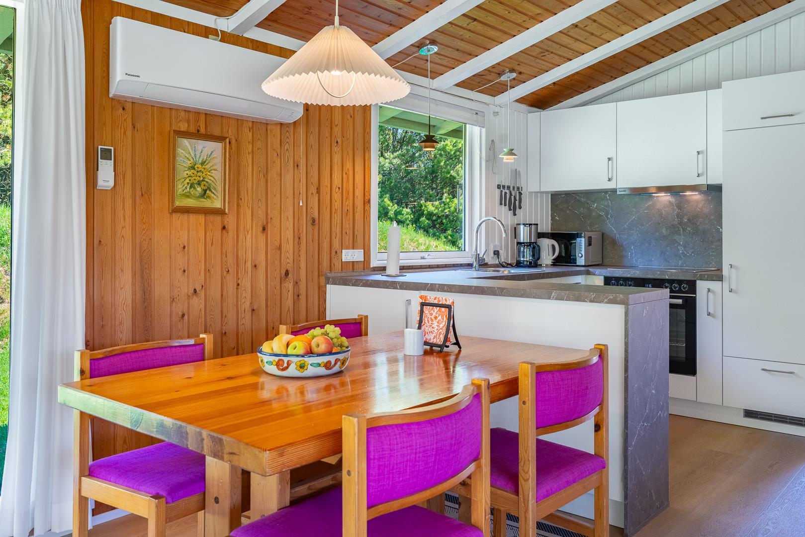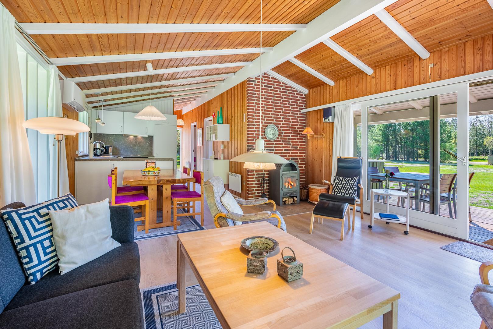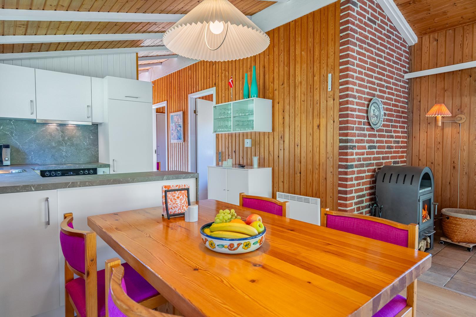 Die neue Küche aus dem Jahr 2025 ist modern und gut ausgestattet, inklusive Geschirrspüler, und offen mit dem Wohnbereich verbunden, wo ein Kaminofen an kühlen Abenden für Wärme und Atmosphäre sorgt.