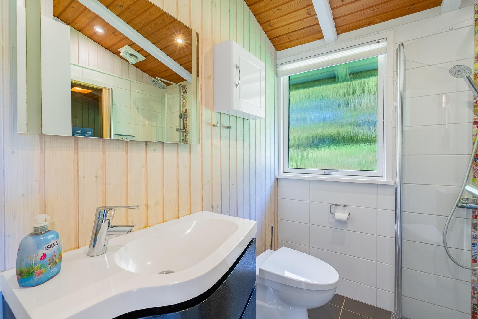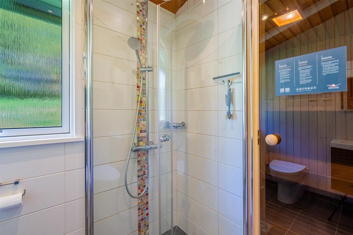 Das moderne Badezimmer ist schön und funktional, mit Fußbodenheizung und Zugang zur eigenen Sauna – perfekt nach einem Tag in der Natur.