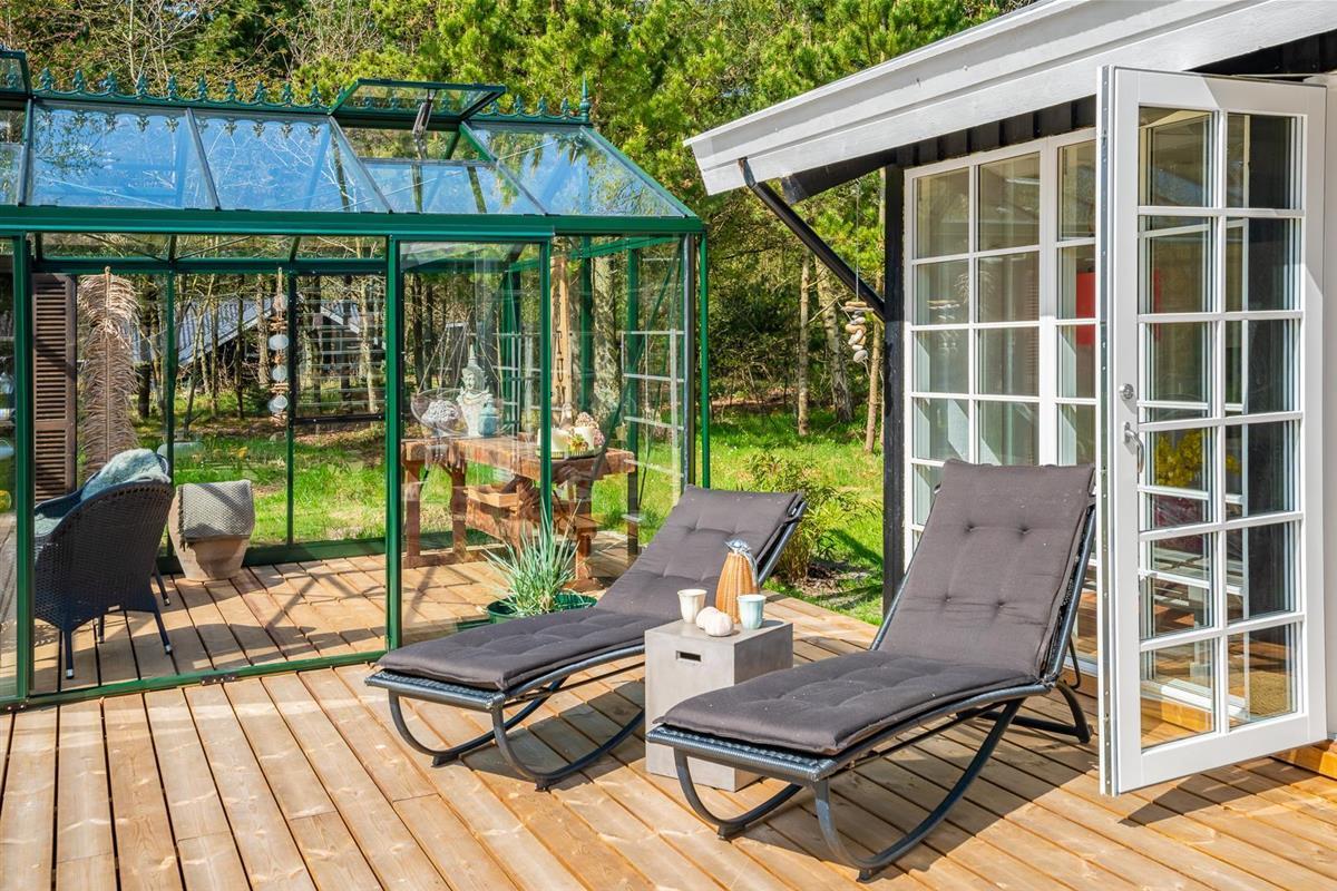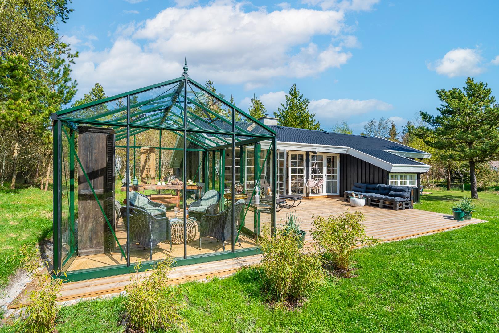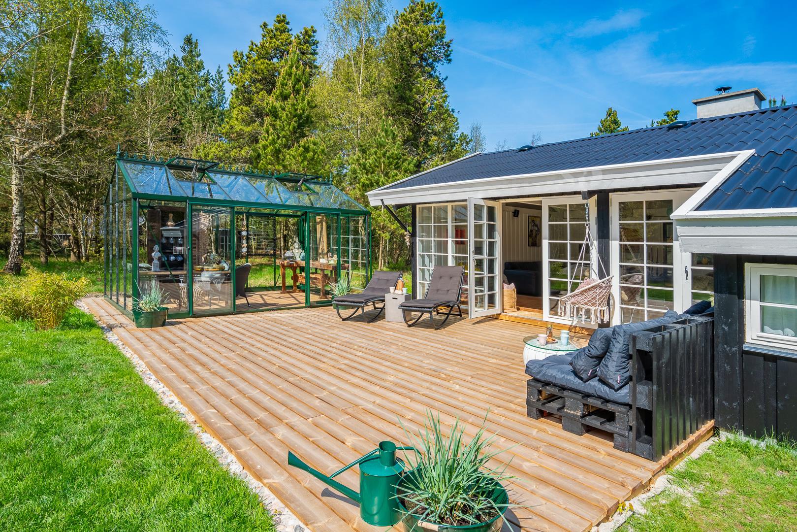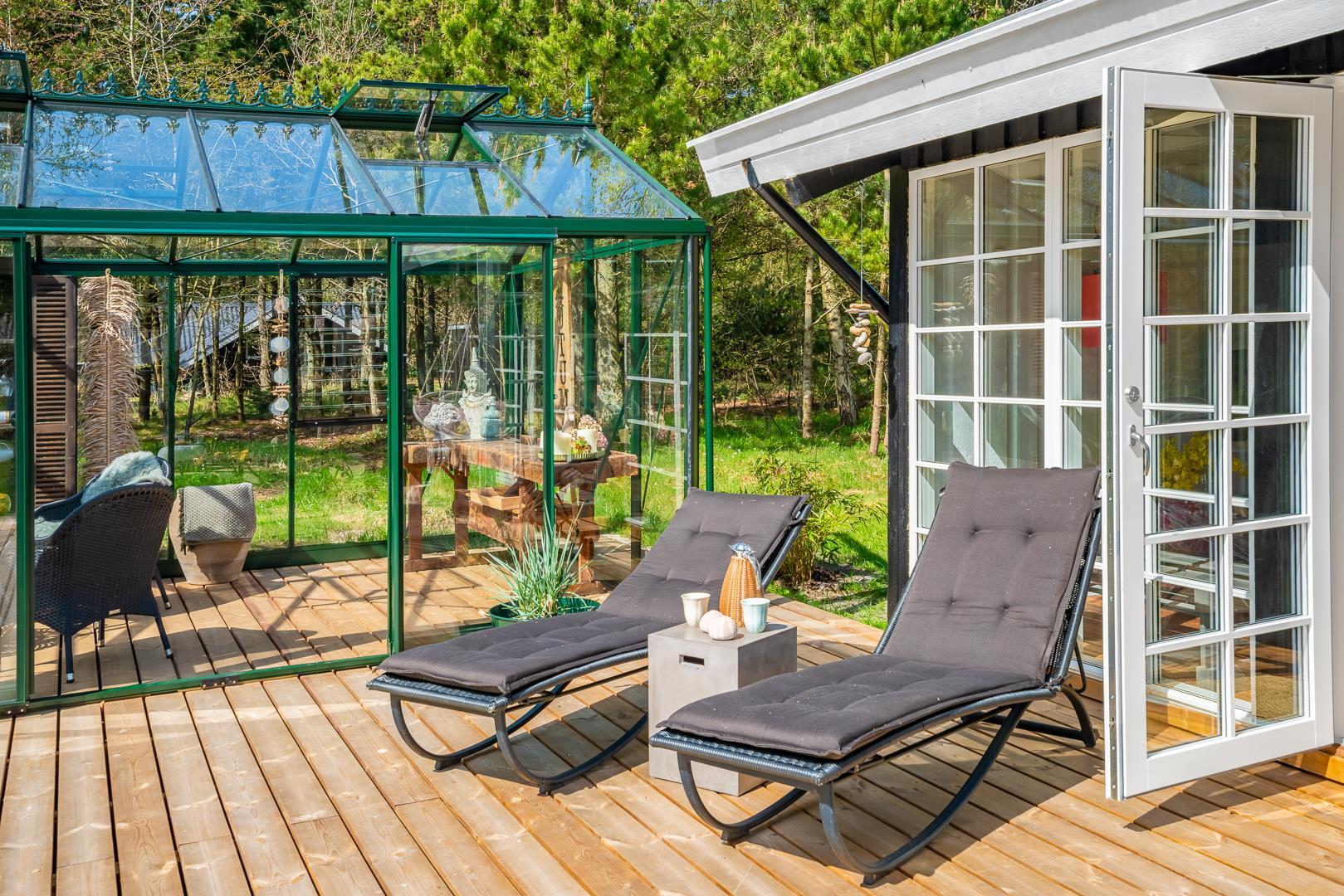 Auch draußen gibt es viel zu entdecken! Die große Terrasse mit einem Orangerie-Anbau verlängert die lauen Sommerabende und bietet Ihnen die Möglichkeit, die Umgebung bei jedem Wetter zu genießen. Machen Sie es sich mit einem Glas Wein bequem und lassen Sie die Seele baumeln, während die Natur um Sie herum für Ruhe und Erholung sorgt.