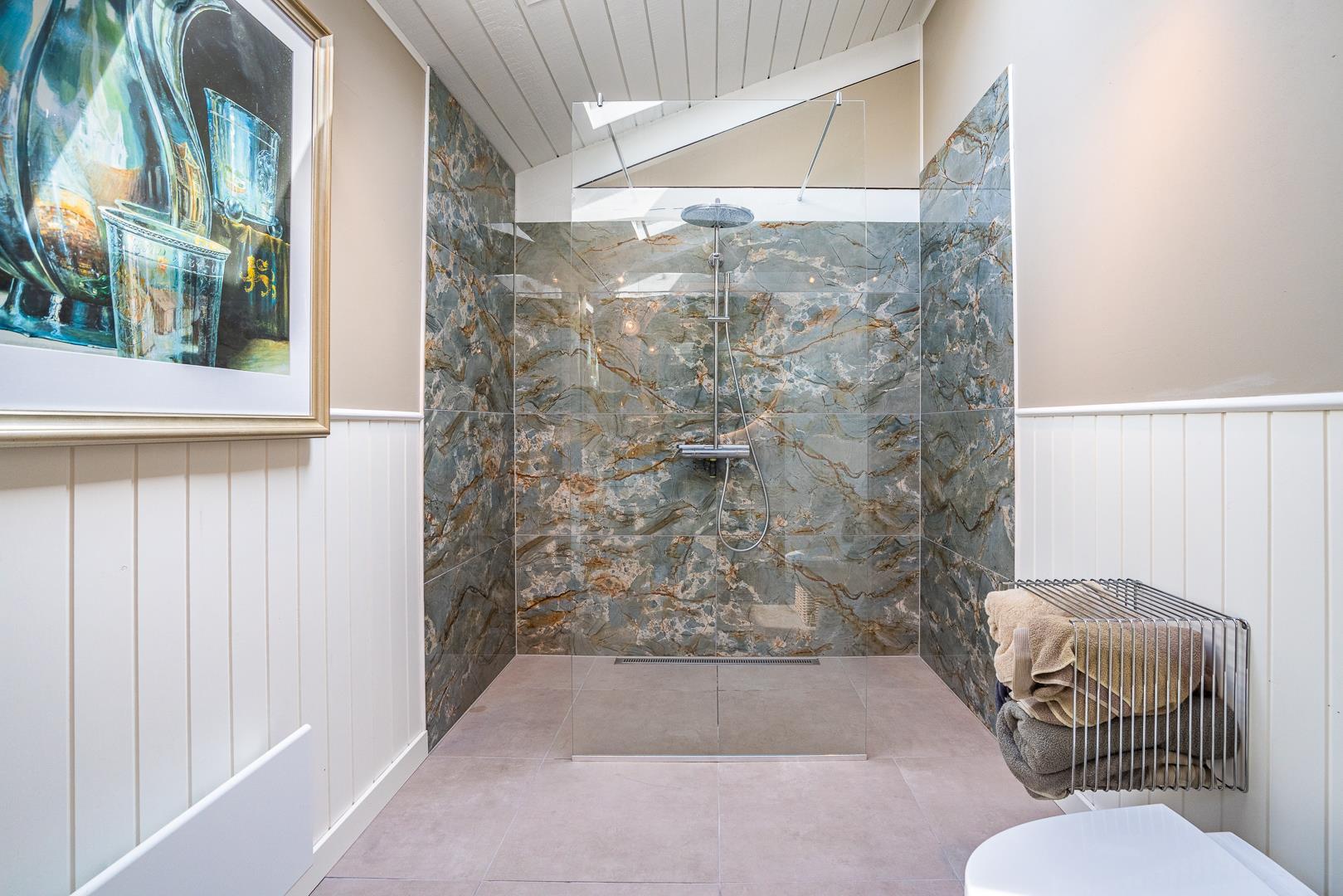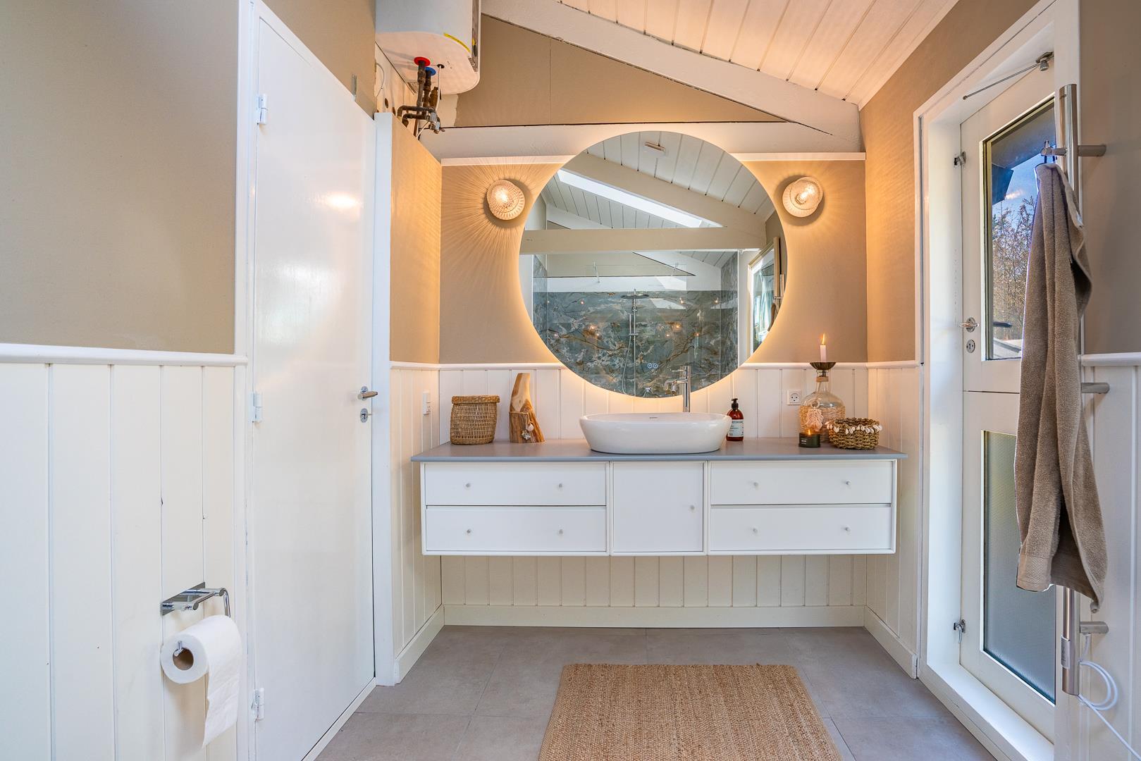 Das moderne Badezimmer ist stilvoll eingerichtet.