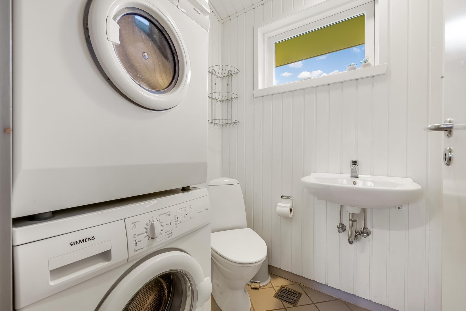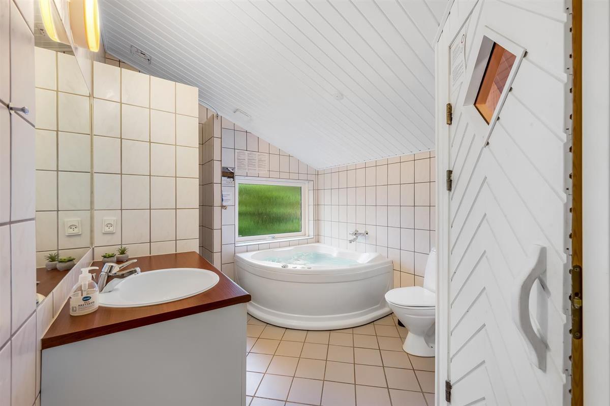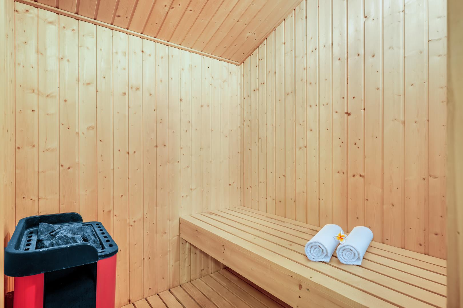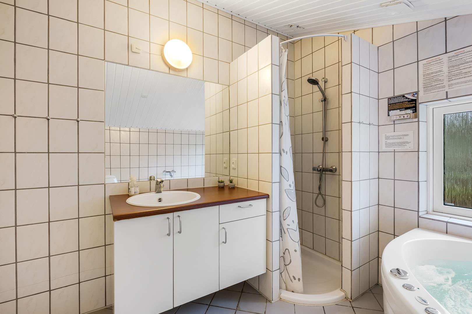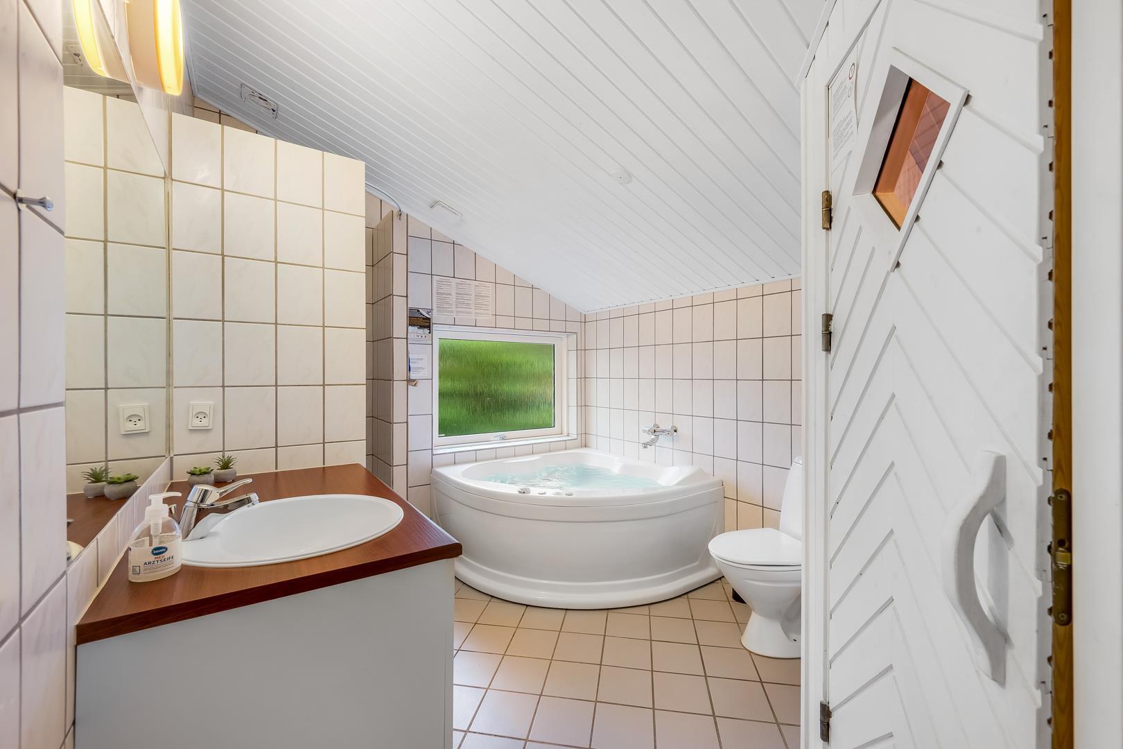 Das geräumige Badezimmer bietet eine Dusche, Fußbodenheizung sowie einen Whirlpool für zwei Personen – ideal zum Entspannen. Zusätzlich steht eine Sauna für wohlige Wärme nach einem langen Tag zur Verfügung. Ein separates Gäste-WC mit Waschmaschine und Trockner sorgt für zusätzlichen Komfort – besonders für Familien.