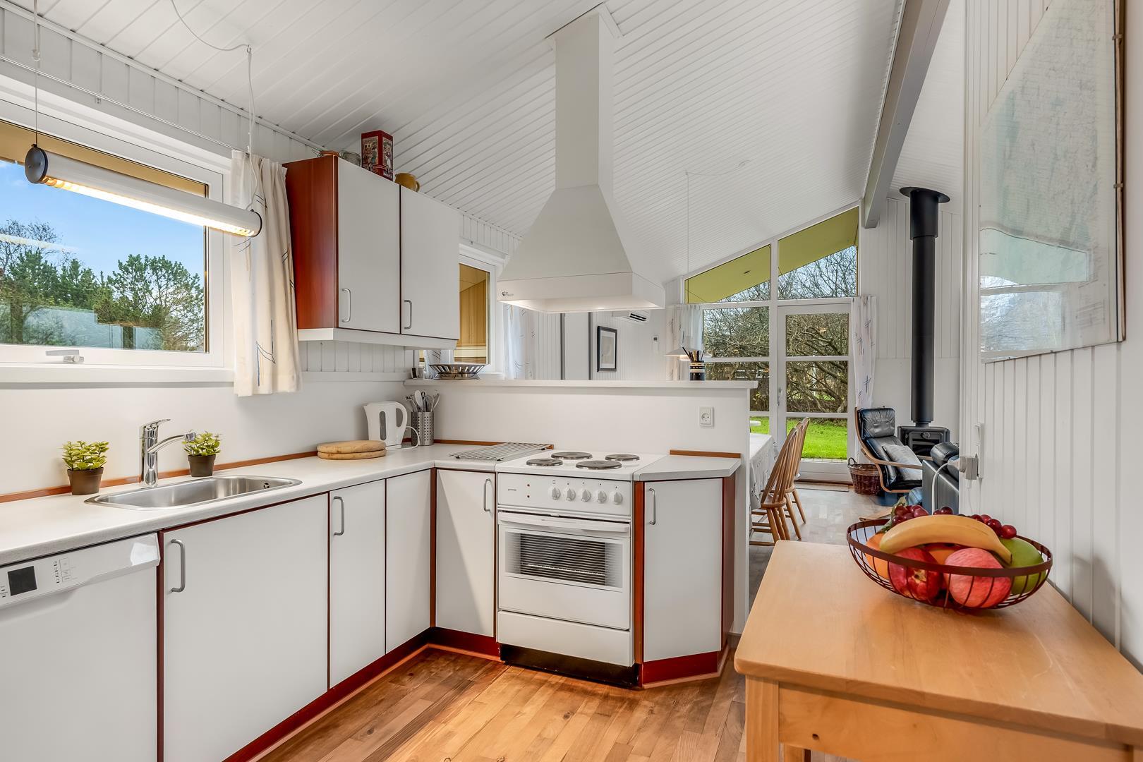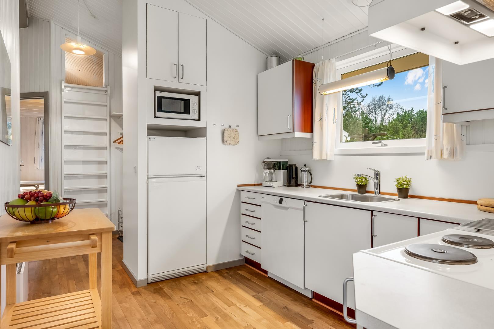 Im Inneren überzeugt das Haus mit einer offenen, gut ausgestatteten Küche inklusive Mikrowelle und Geschirrspüler. Der angrenzende Wohnbereich ist hell und freundlich gestaltet. Ein Kaminofen sorgt an kühleren Tagen für wohlige Wärme und schafft eine behagliche Stimmung – ideal für entspannte Stunden mit der Familie.