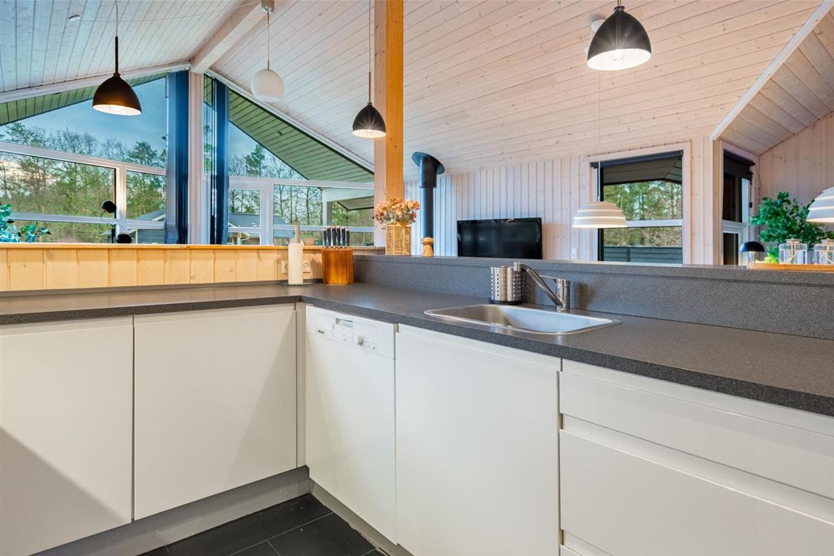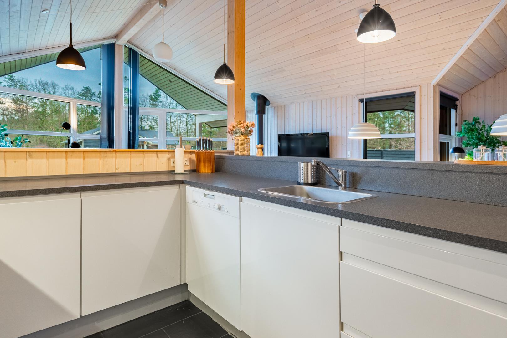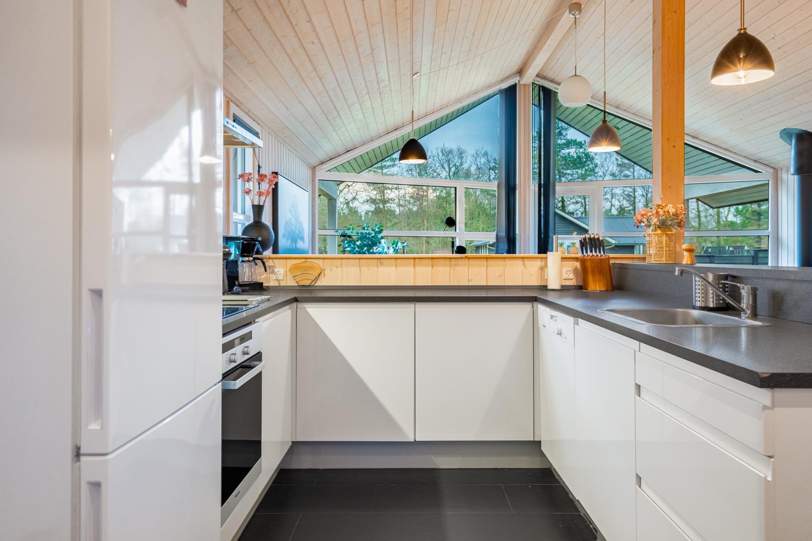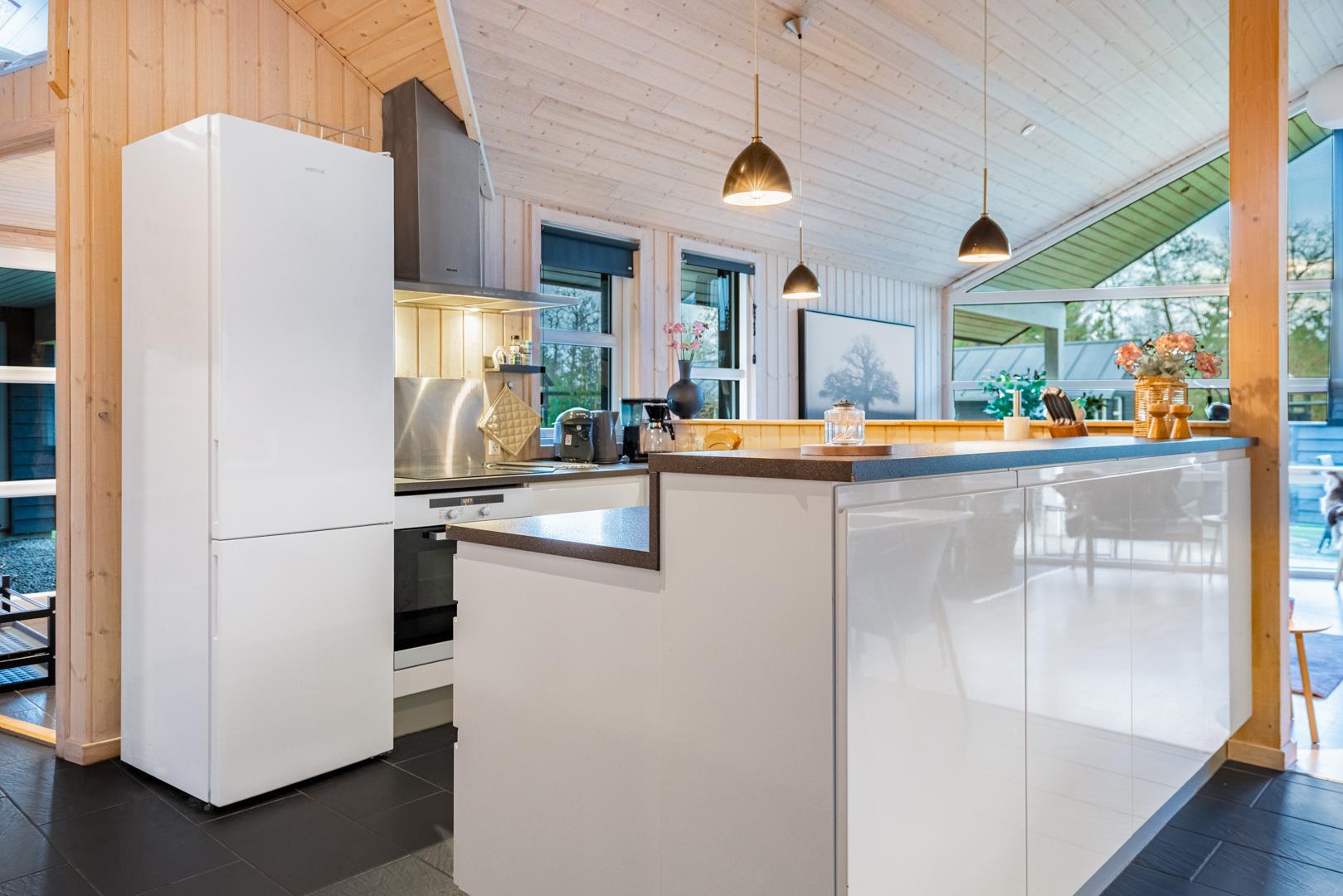 Im lichtdurchfluteten Wohnbereich sorgt der knisternde Kamin für echte Ferienhaus-Atmosphäre, während die energiesparende Wärmepumpe das ganze Jahr über für angenehme Temperaturen sorgt. Die offene Küche ist modern ausgestattet mit Spülmaschine und Fußbodenheizung, sodass gemeinsames Kochen richtig Spaß macht.