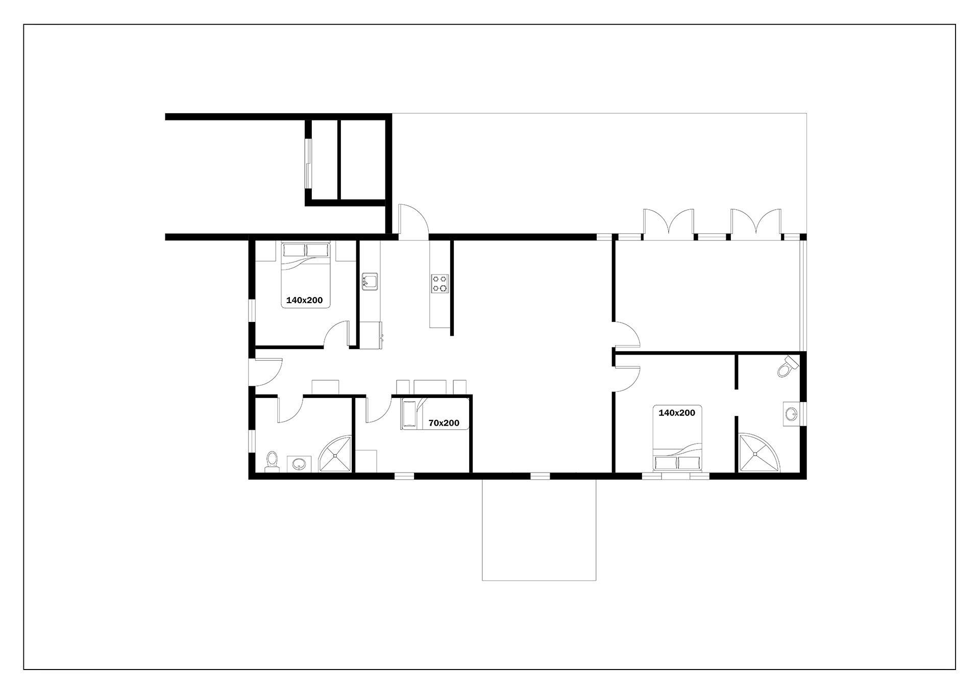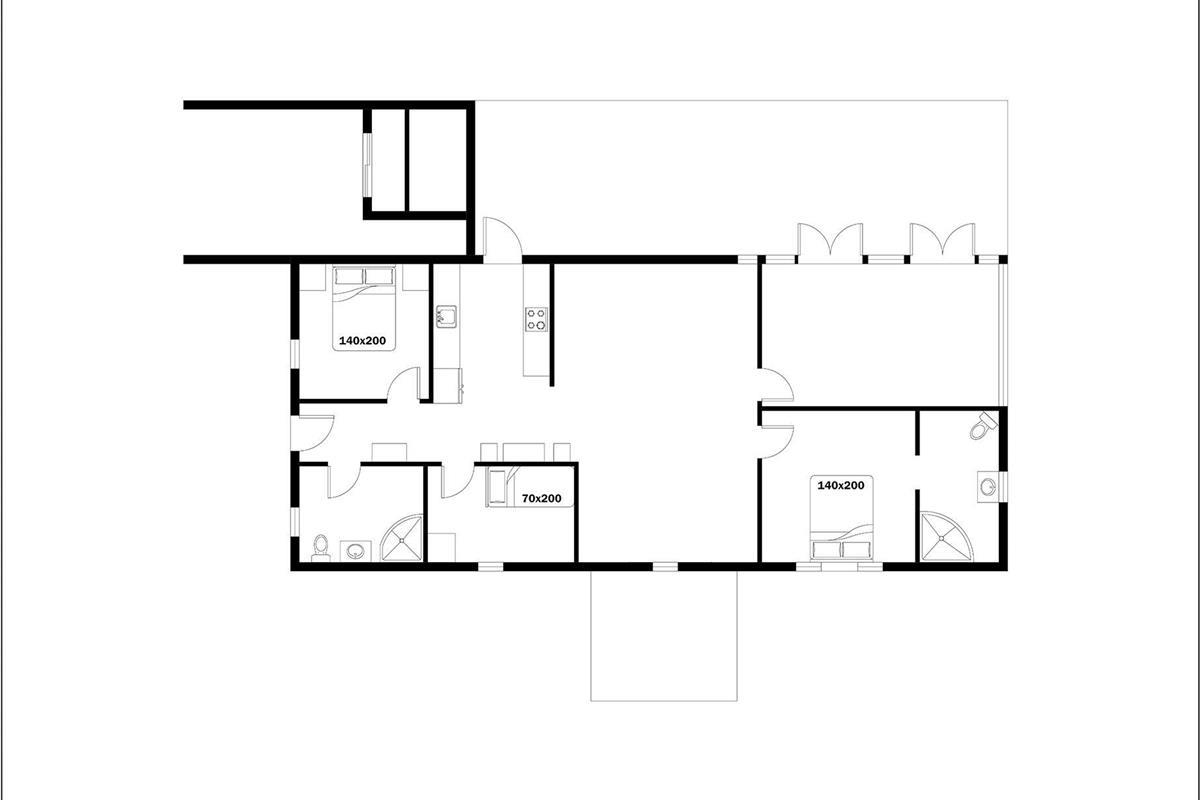 Das Haus ist in 2 Schlafbereiche mit jeweils eigenem Bad eingeteilt. Es gibt 2 Schlafzimmer mit Doppelbett und 1 Zimmer mit 2 Etagenbetten.
