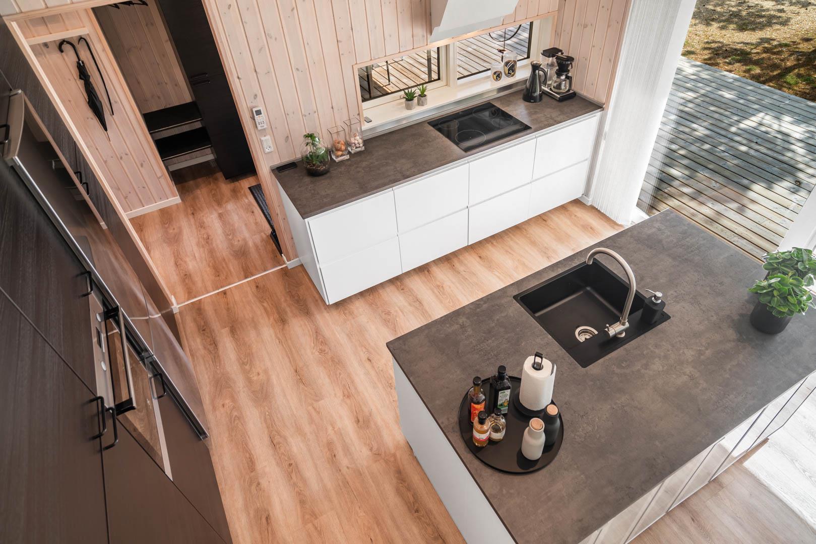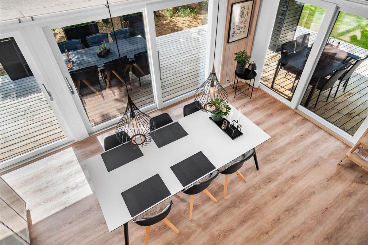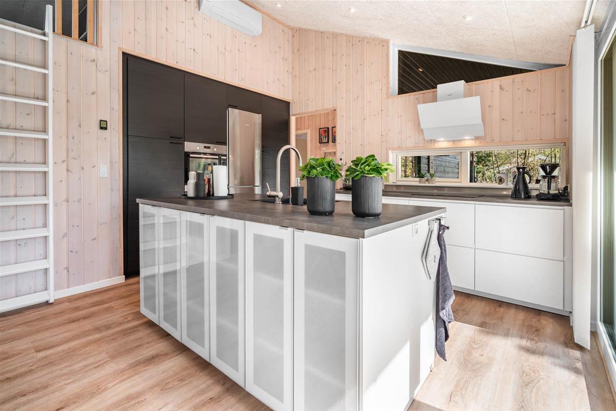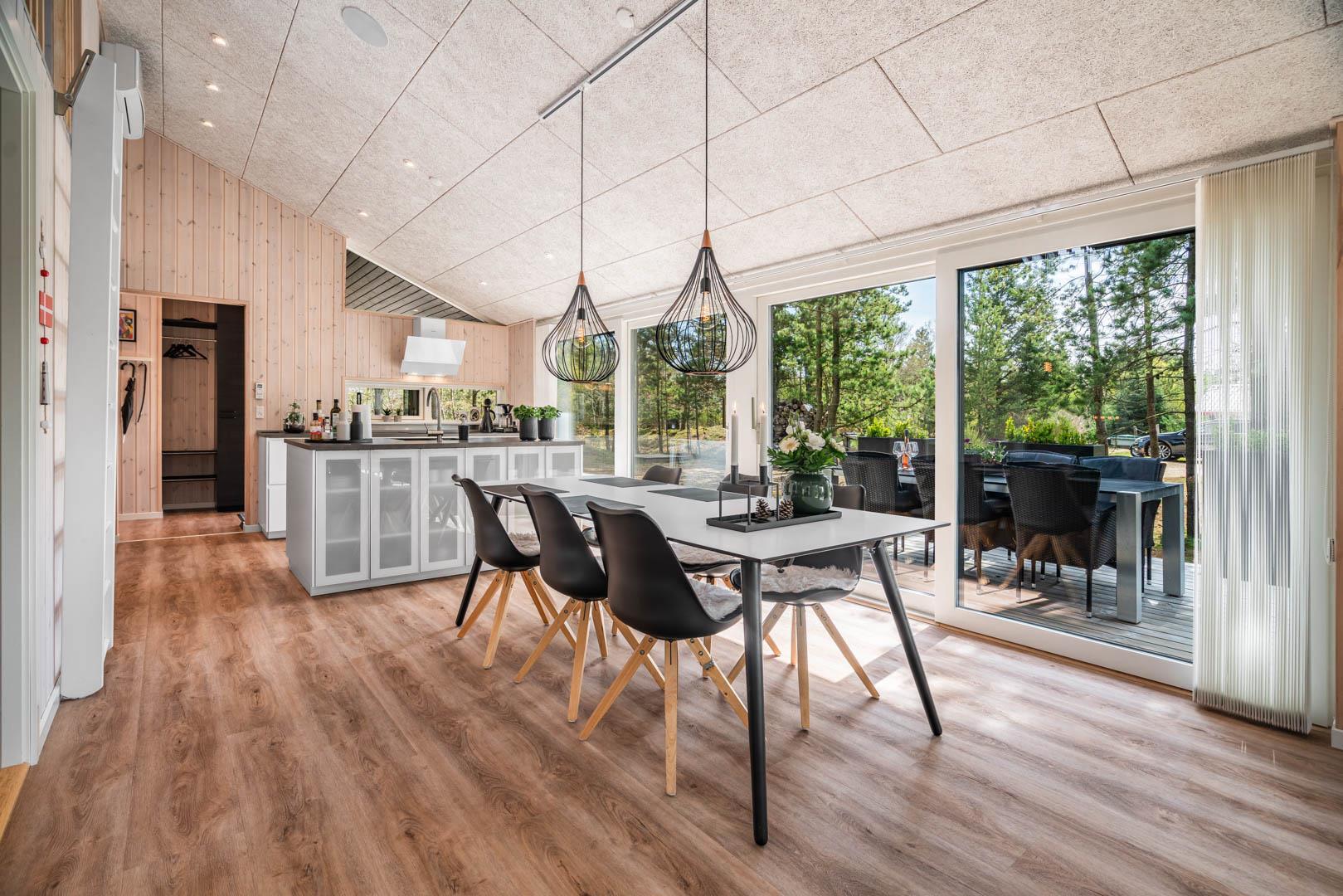Große Fensterfronten sorgen für lichtdurchflutete Räume. Die Küche ist mit einem Geschirrspüler, Mikrowelle und einem Kühlschrank mit separatem Gefrierschrank (50 l) ausgestattet. Sie ist in offener Verbindung mit dem Essbereich und dem Wohnzimmer. Der Kamin und die energiesparende Wärmepumpe sorgen für ein angenehmes Wohnklima.