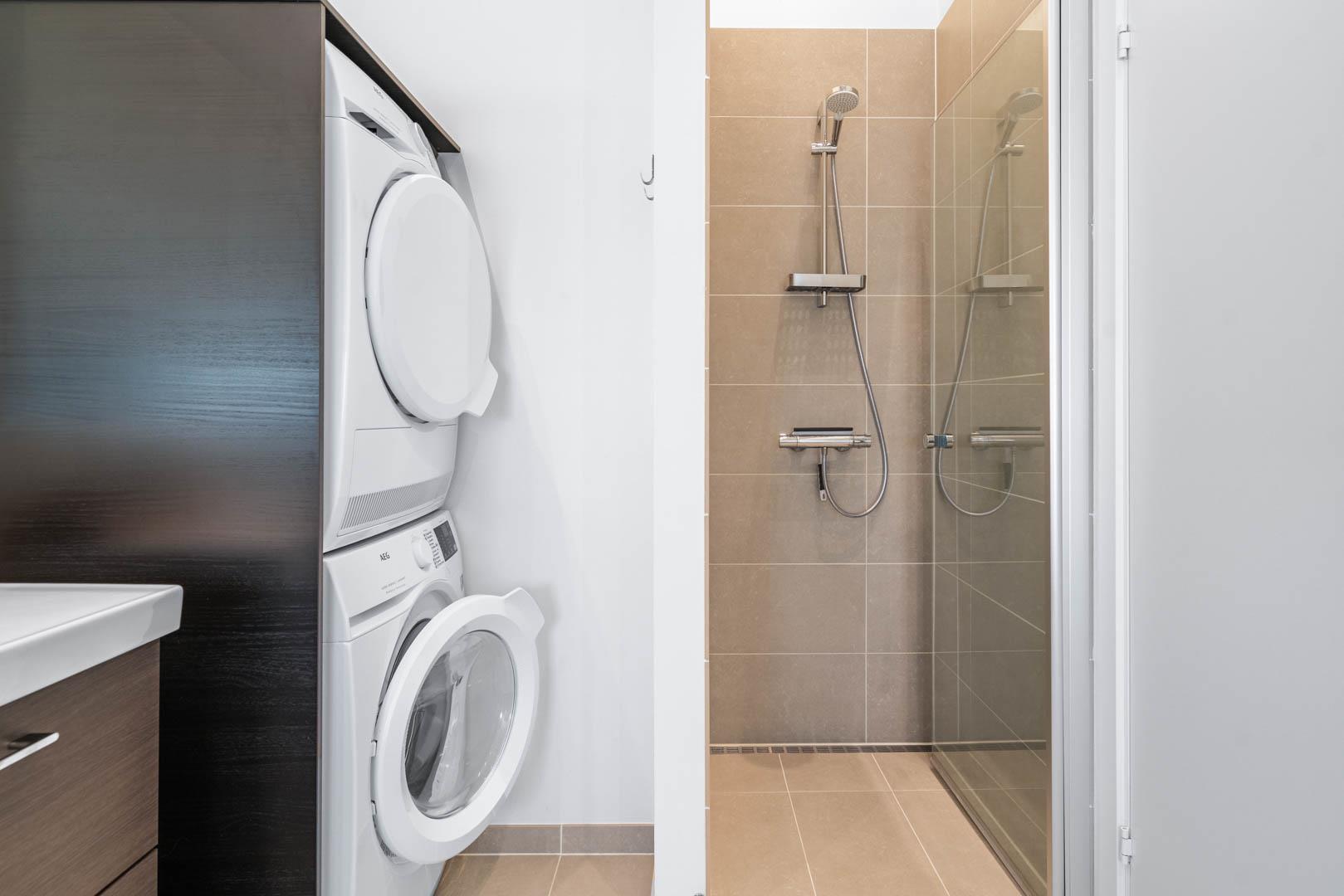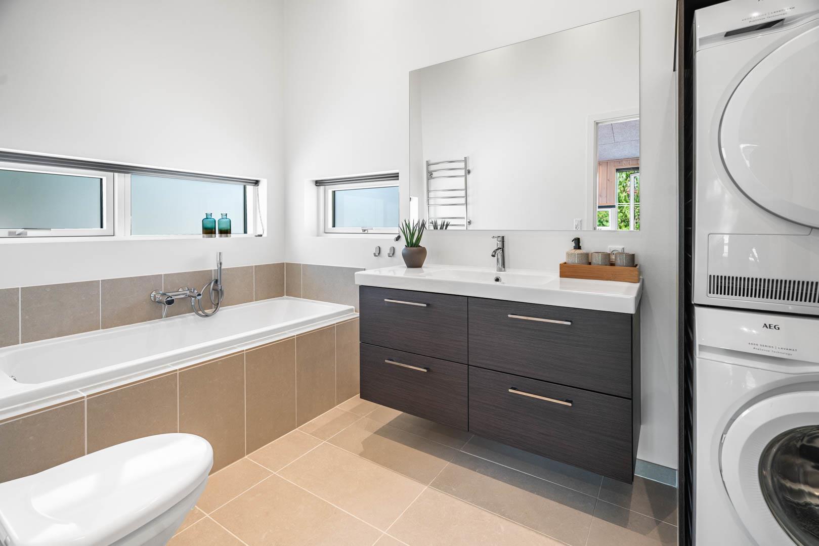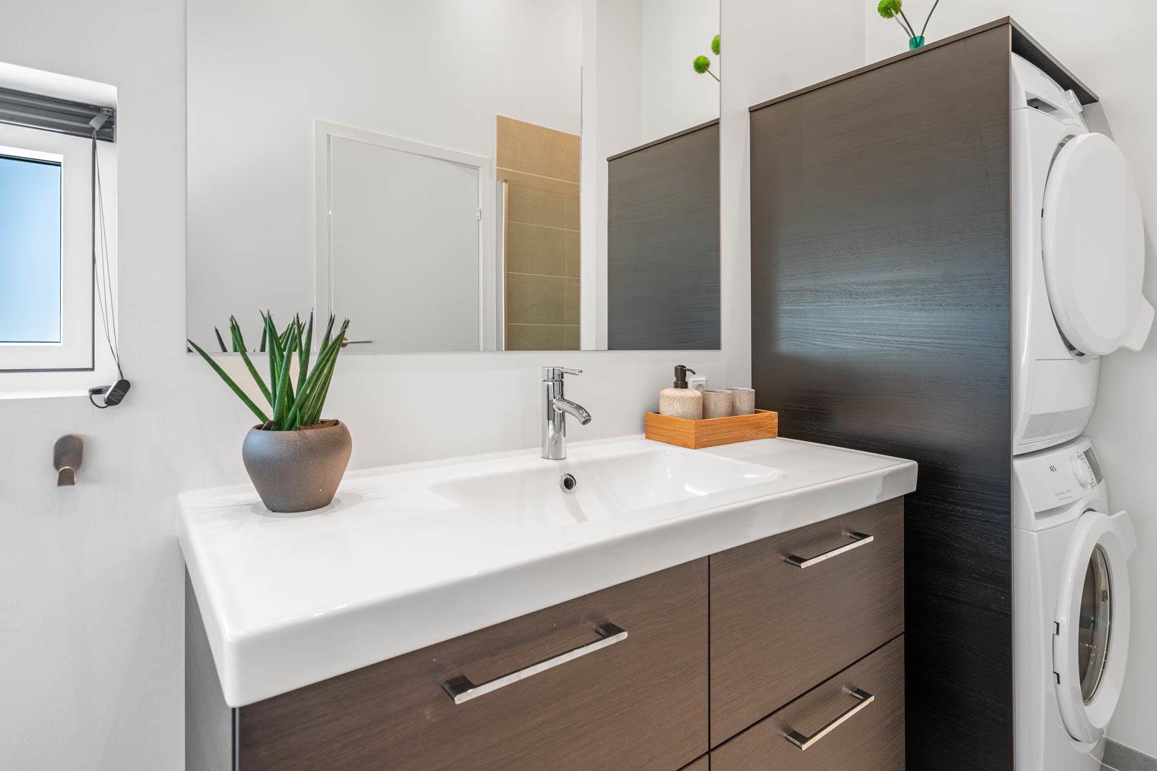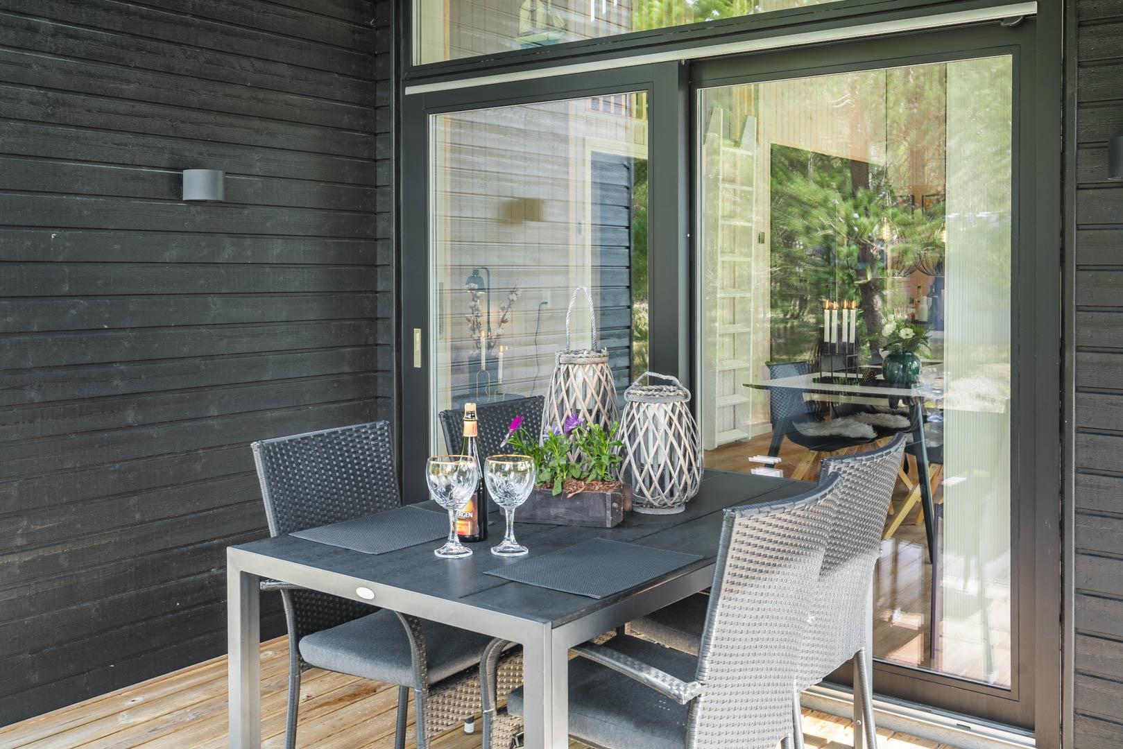 Große Fensterfronten sorgen für lichtdurchflutete Räume. Die Küche ist mit einem Geschirrspüler, Mikrowelle und einem Kühlschrank mit separatem Gefrierschrank (50 l) ausgestattet. Sie ist in offener Verbindung mit dem Essbereich und dem Wohnzimmer. Der Kamin und die energiesparende Wärmepumpe sorgen für ein angenehmes Wohnklima.
