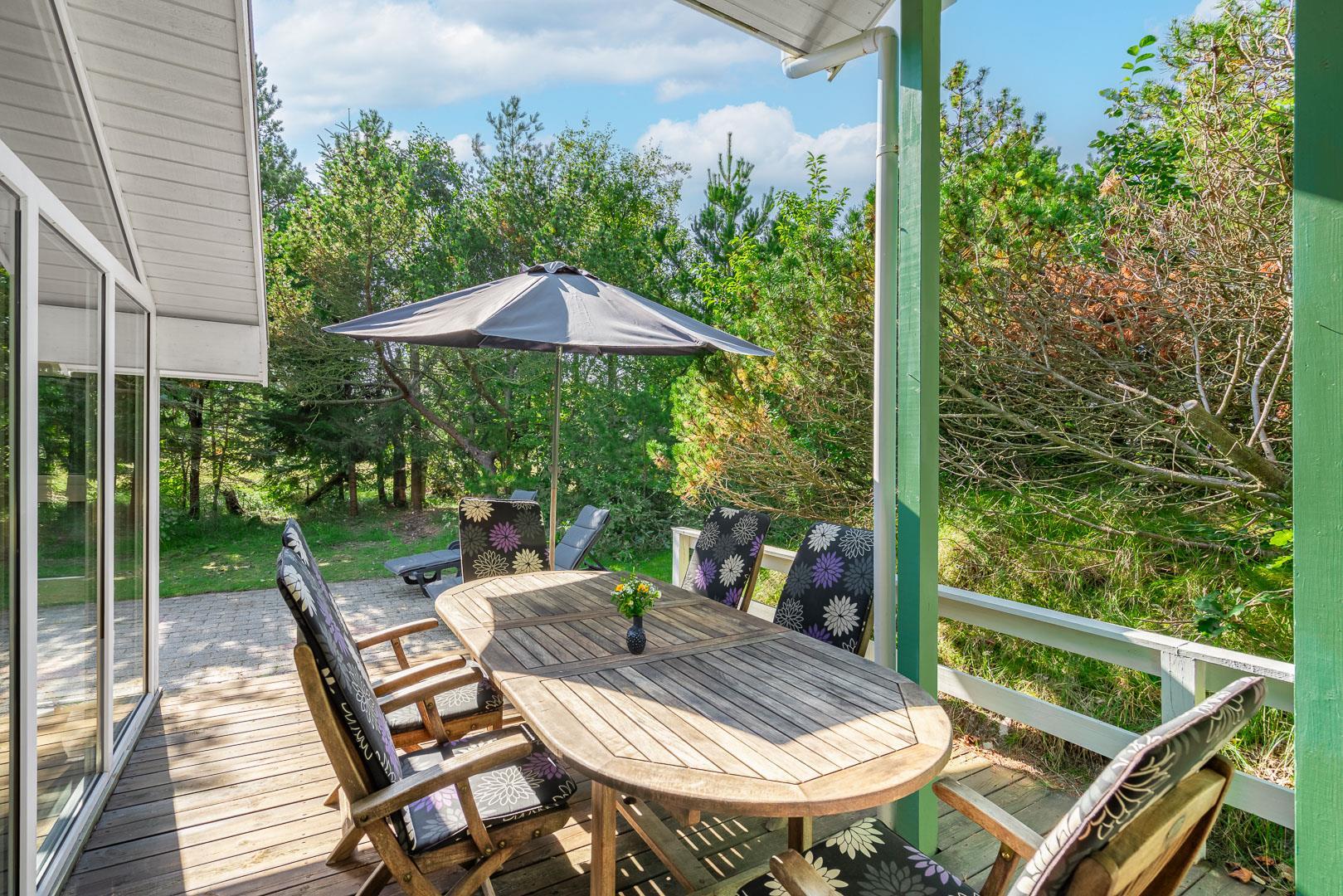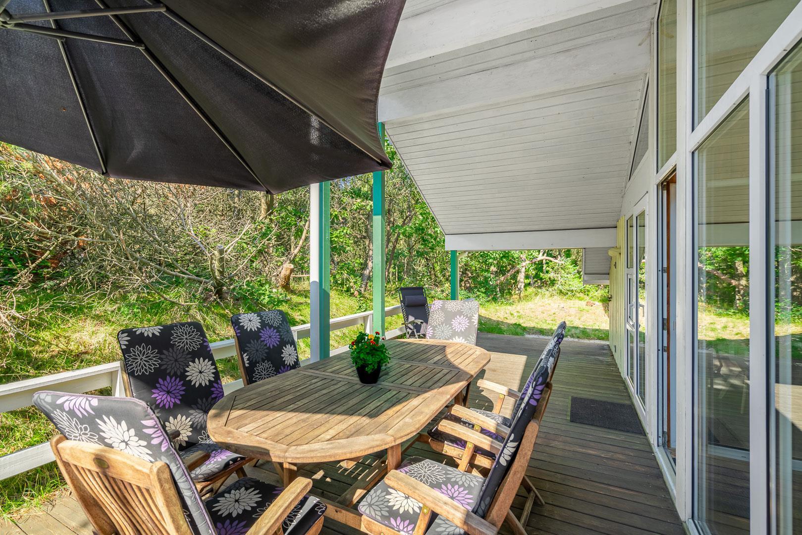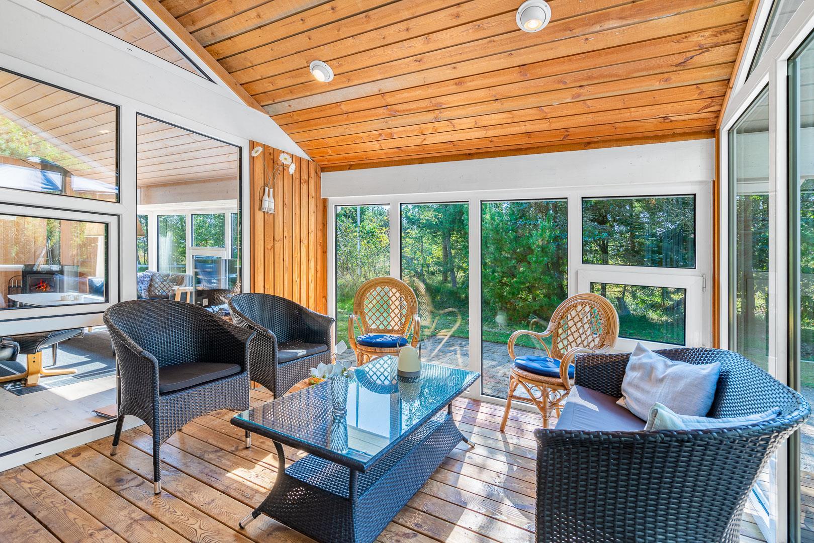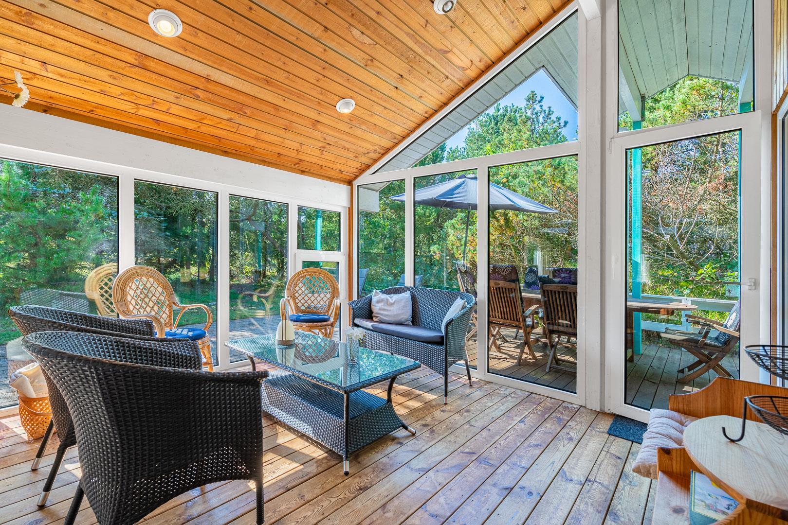 Auf der überdachten Terrasse kannst du bei jedem Wetter draußen sitzen, frühstücken, lesen oder den Tag gemütlich ausklingen lassen. Die ruhige Lage sorgt für echtes Ferienhaus-Feeling, begleitet von frischer Luft und Naturgeräuschen.