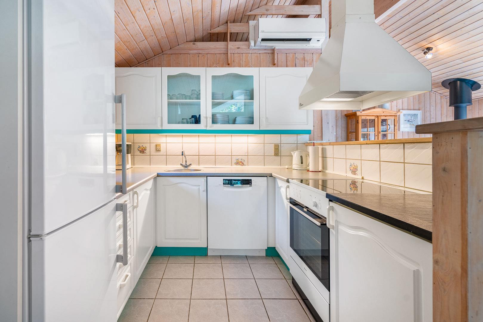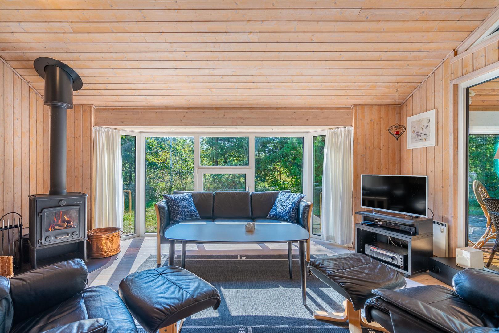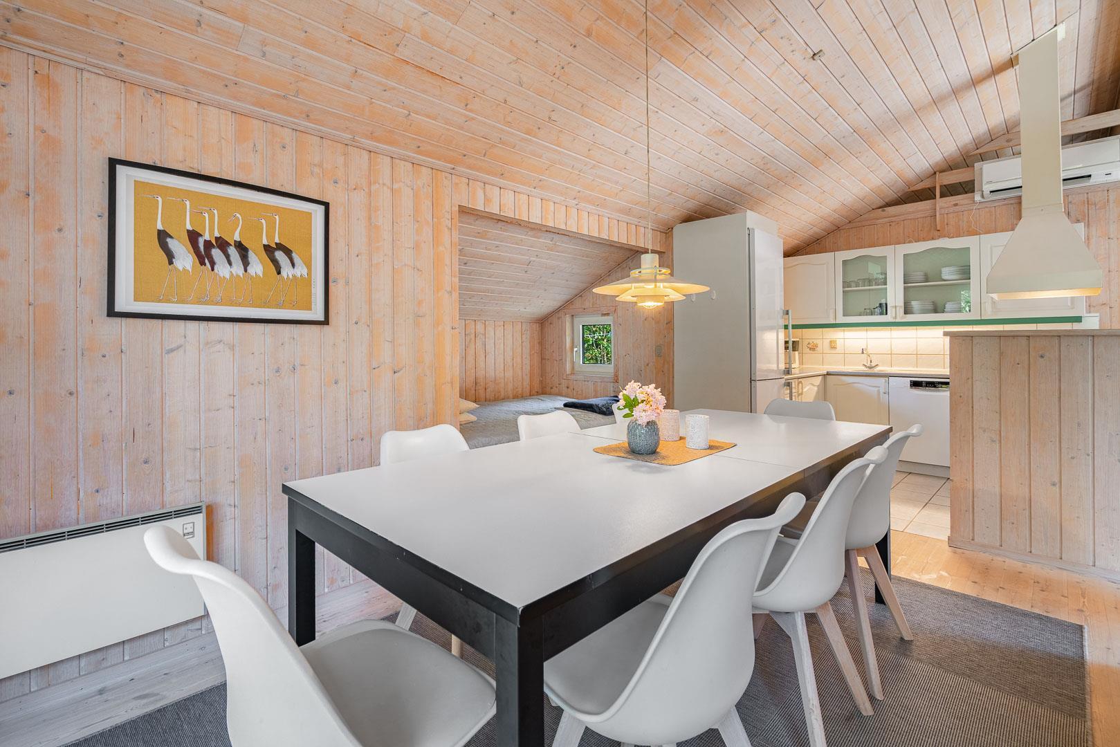 Der offene Wohn- und Essbereich bildet das Herz des Ferienhauses. Ein Kamin sorgt für eine gemütliche Atmosphäre, während die Wärmepumpe ganzjährig für angenehme Temperaturen sorgt. Die offene Küche ist modern ausgestattet und verfügt über eine Spülmaschine, sodass der Abwasch schnell erledigt ist.