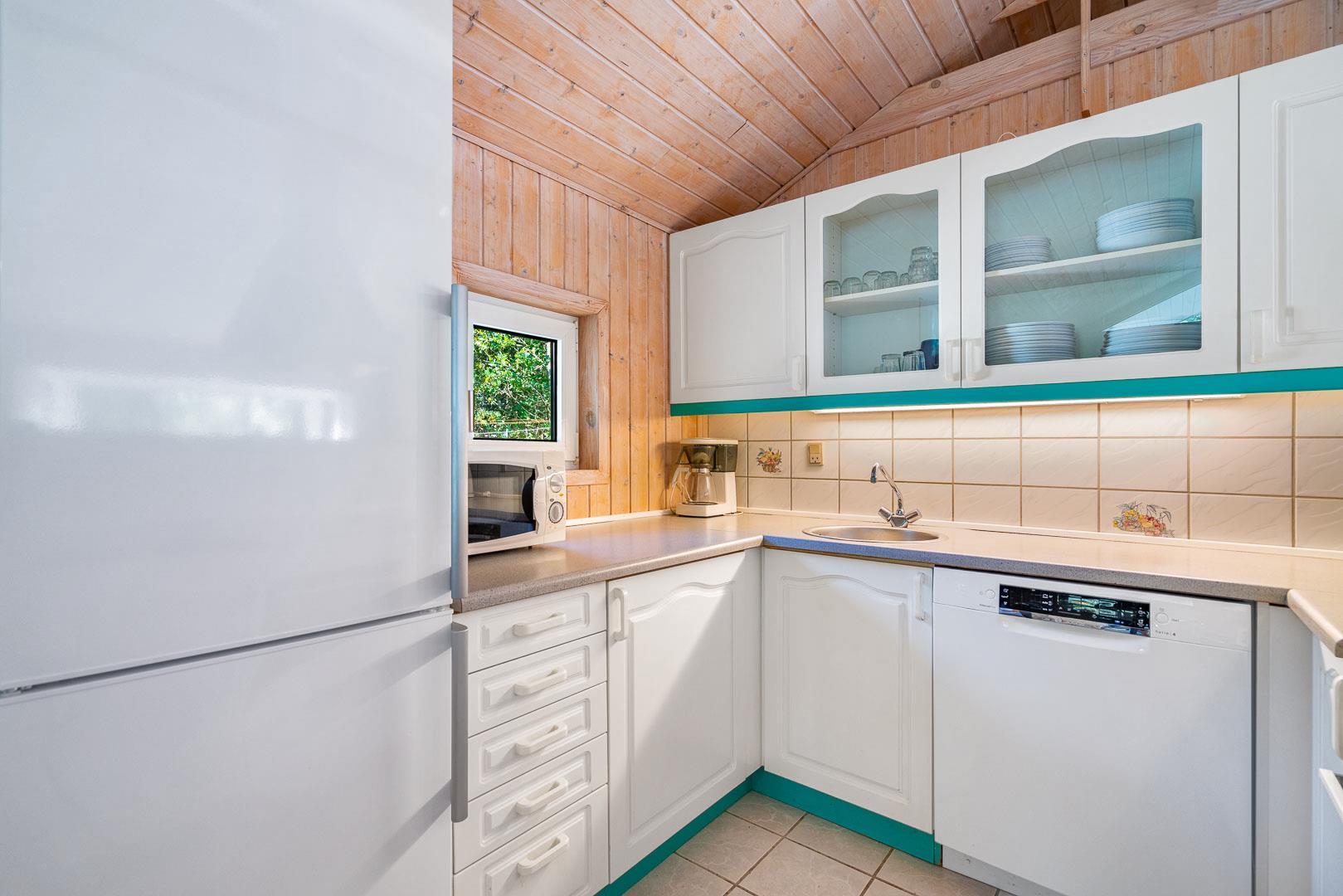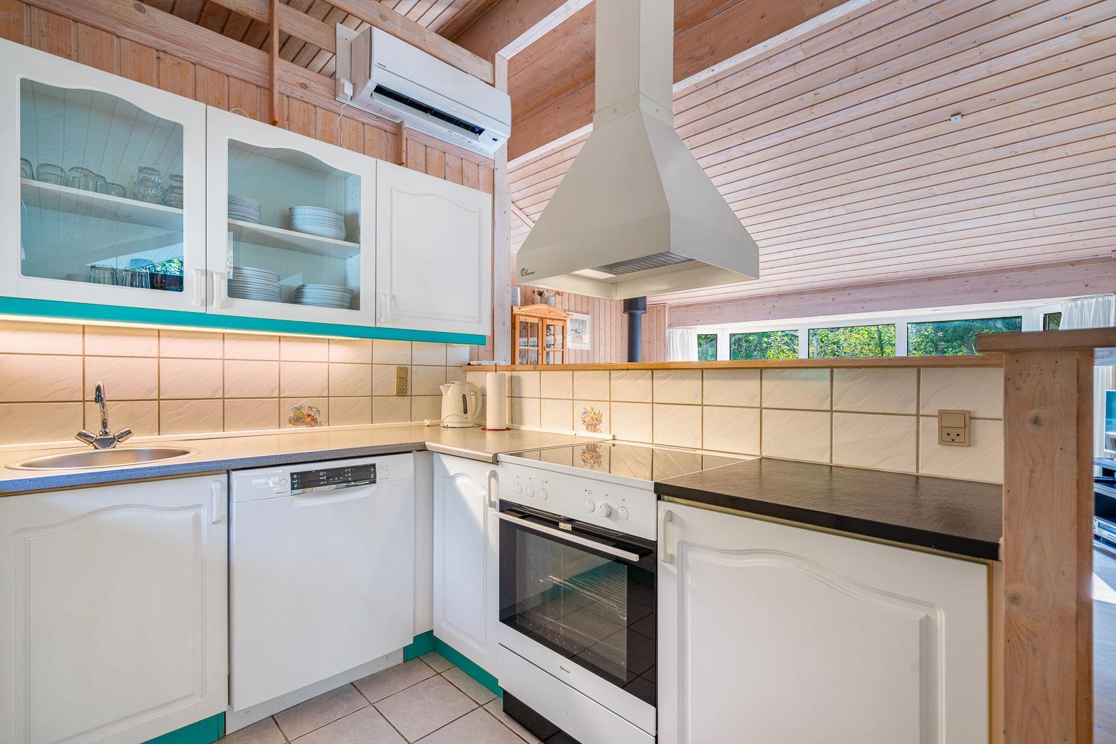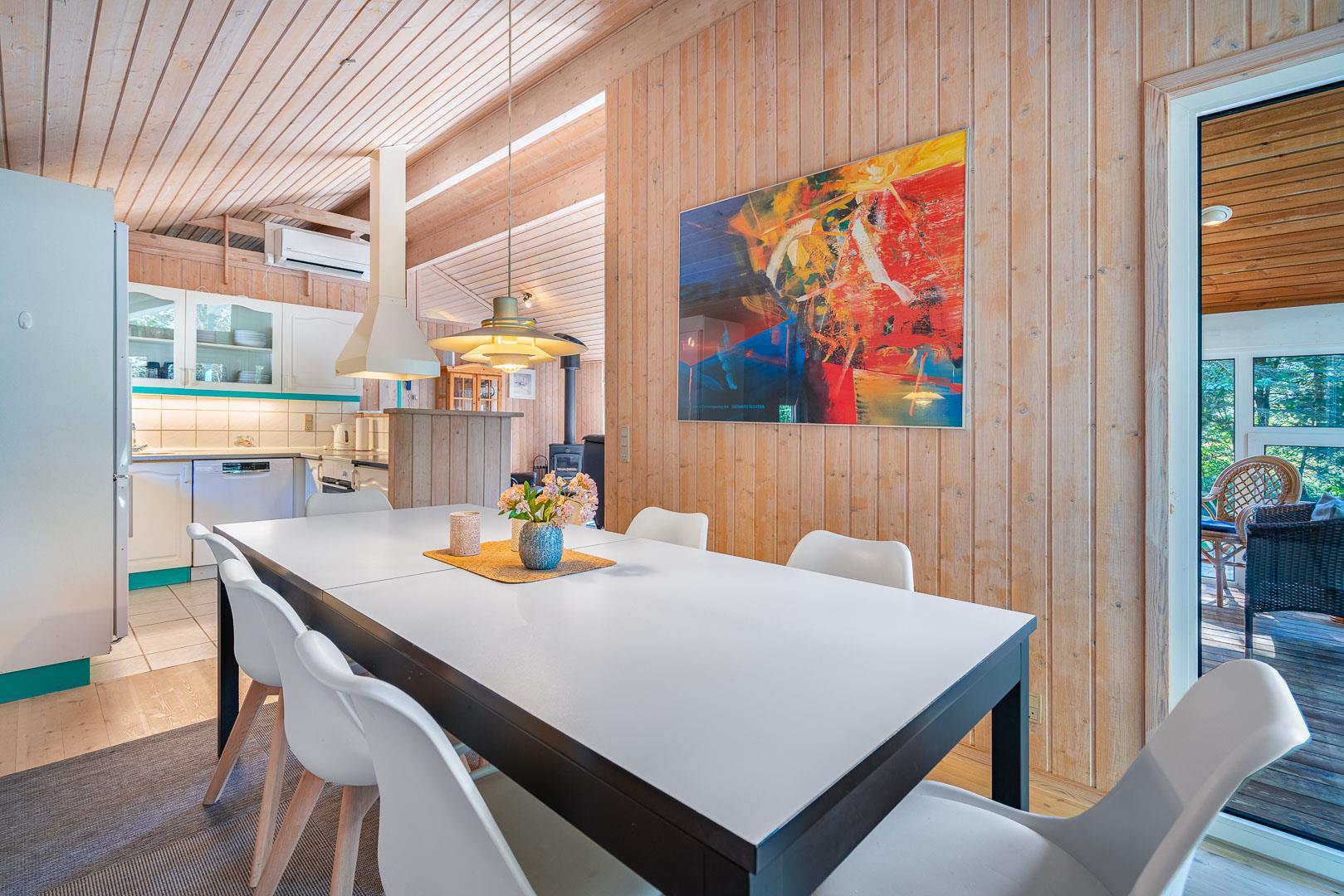 Der offene Wohn- und Essbereich bildet das Herz des Ferienhauses. Ein Kamin sorgt für eine gemütliche Atmosphäre, während die Wärmepumpe ganzjährig für angenehme Temperaturen sorgt. Die offene Küche ist modern ausgestattet und verfügt über eine Spülmaschine, sodass der Abwasch schnell erledigt ist.