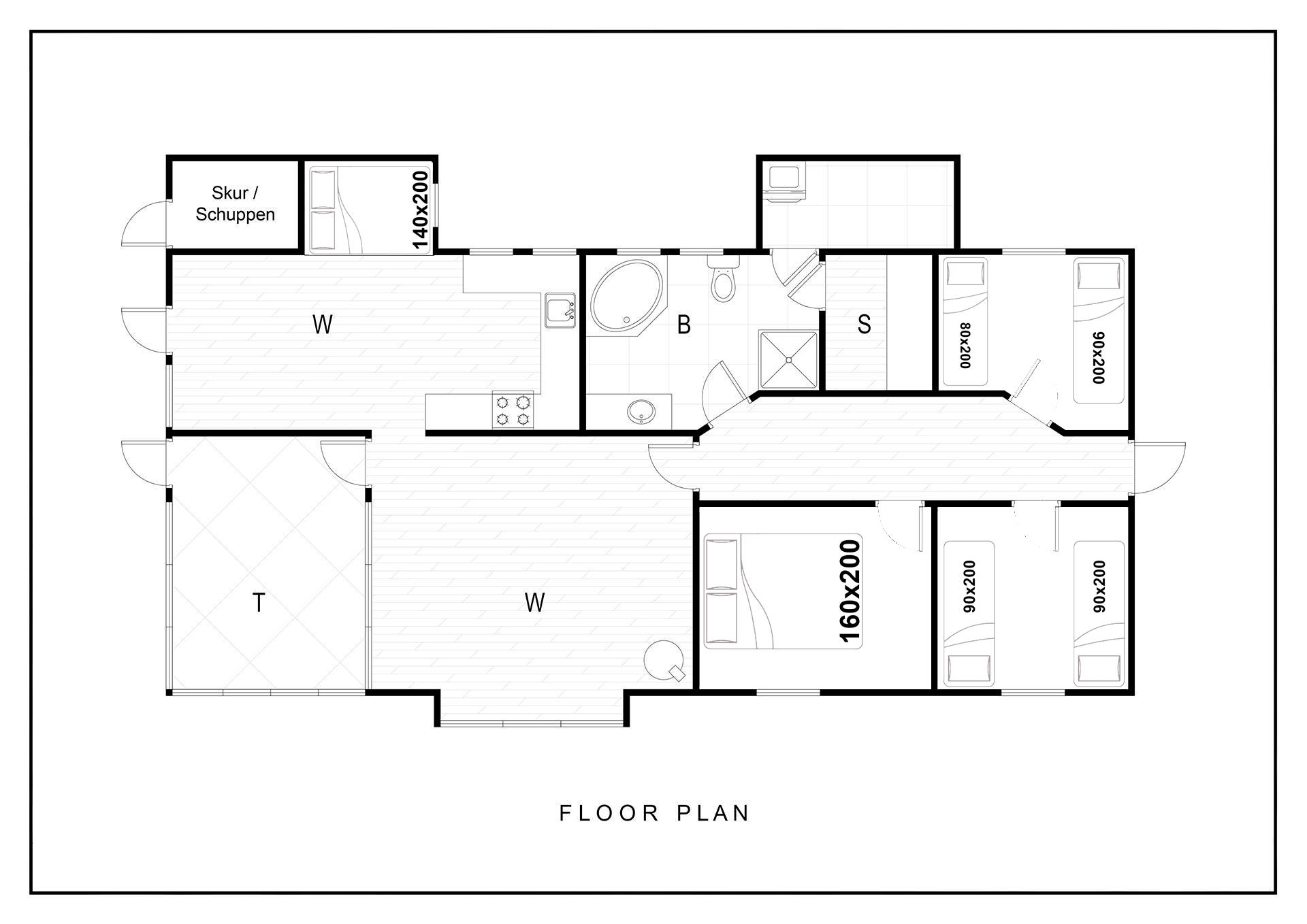 Bettengröße: 1 Doppelbett 160 x 200 cm + 3 Einzelbetten 90 x 200 cm + 1 Einzelbett 80 x 200 cm