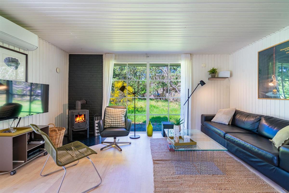 Modernes Wohnzimmer mit bequemen Möbeln und Holzofen, falls die Tage zu kalt werden. Die Küche liegt in Verbindung mit Essbereich.