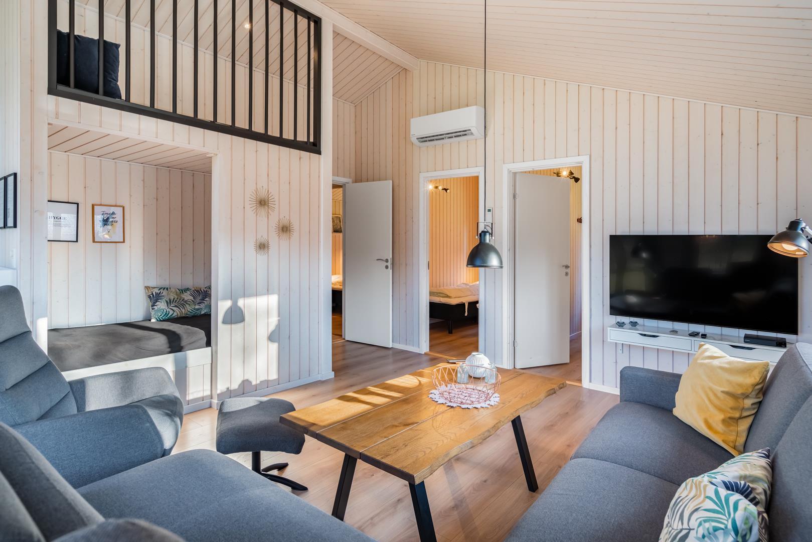 Auf 81m² Wohnfläche erwartet Dich ein helles, freundliches Ambiente mit einer harmonischen Raumaufteilung. Der offene Wohn- und Essbereich ist der perfekte Treffpunkt für gemeinsame Mahlzeiten, Spieleabende oder entspannte Stunden auf dem Sofa. Große Fenster sorgen für viel Tageslicht und schaffen eine angenehme Urlaubsatmosphäre.