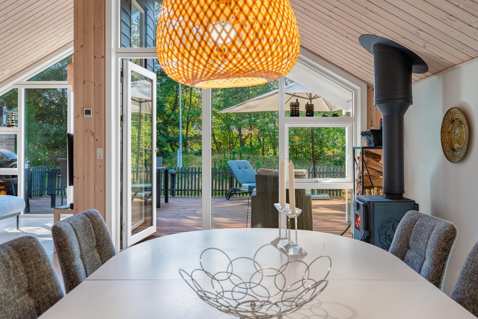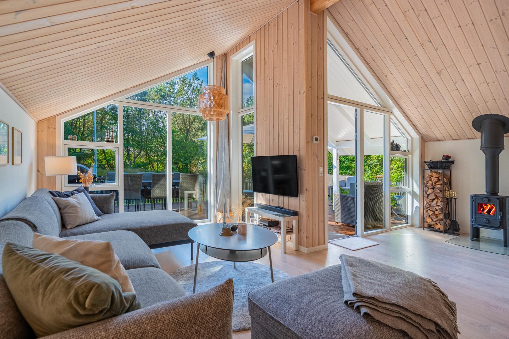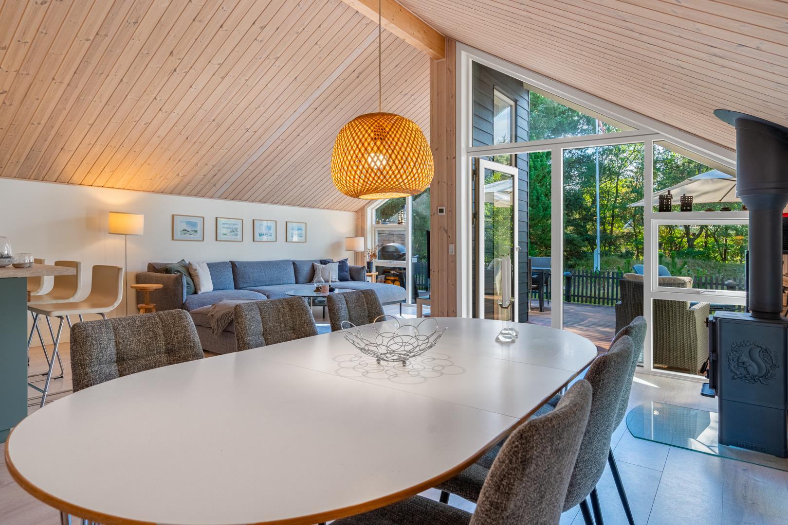 Der offene Wohn- und Essbereich bildet das Herz des Ferienhauses. Große Fenster lassen viel Licht herein und geben den Blick ins Grüne frei, während helle Holzelemente für eine freundliche Atmosphäre sorgen. Der Kaminofen macht den Raum zu einem gemütlichen Treffpunkt an kühlen Tagen, unterstützt von einer energiesparenden Wärmepumpe, die das ganze Jahr über für ein angenehmes Klima sorgt.