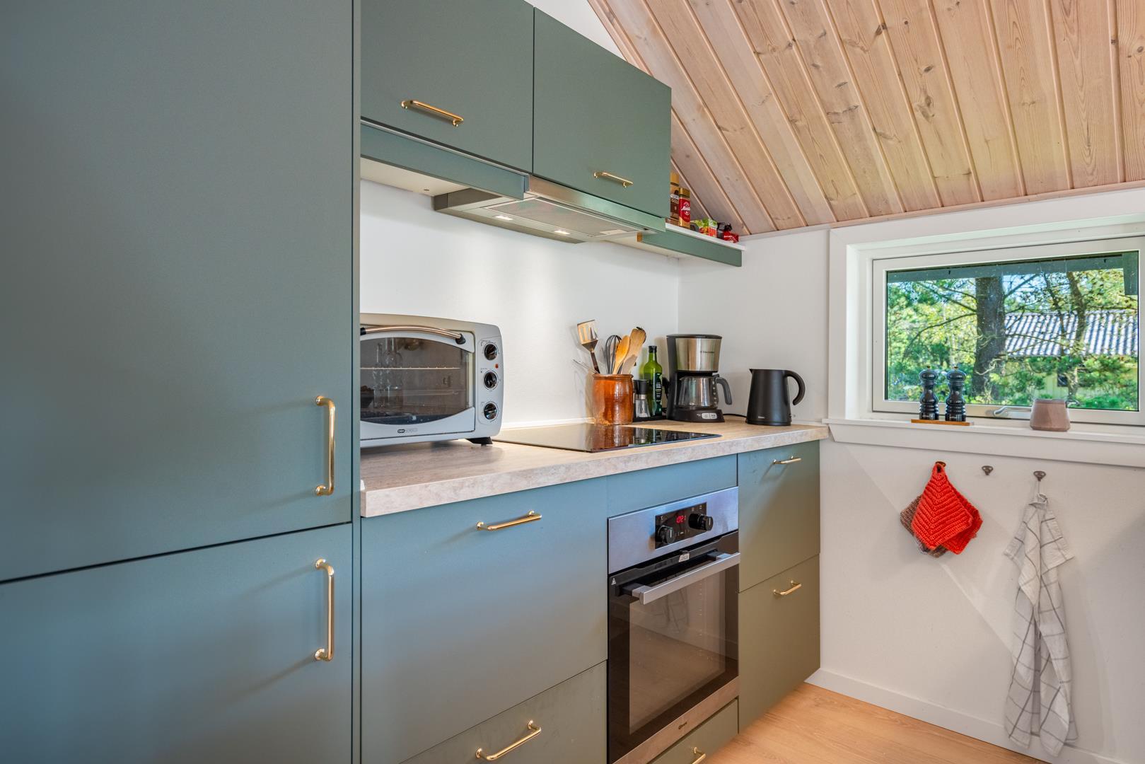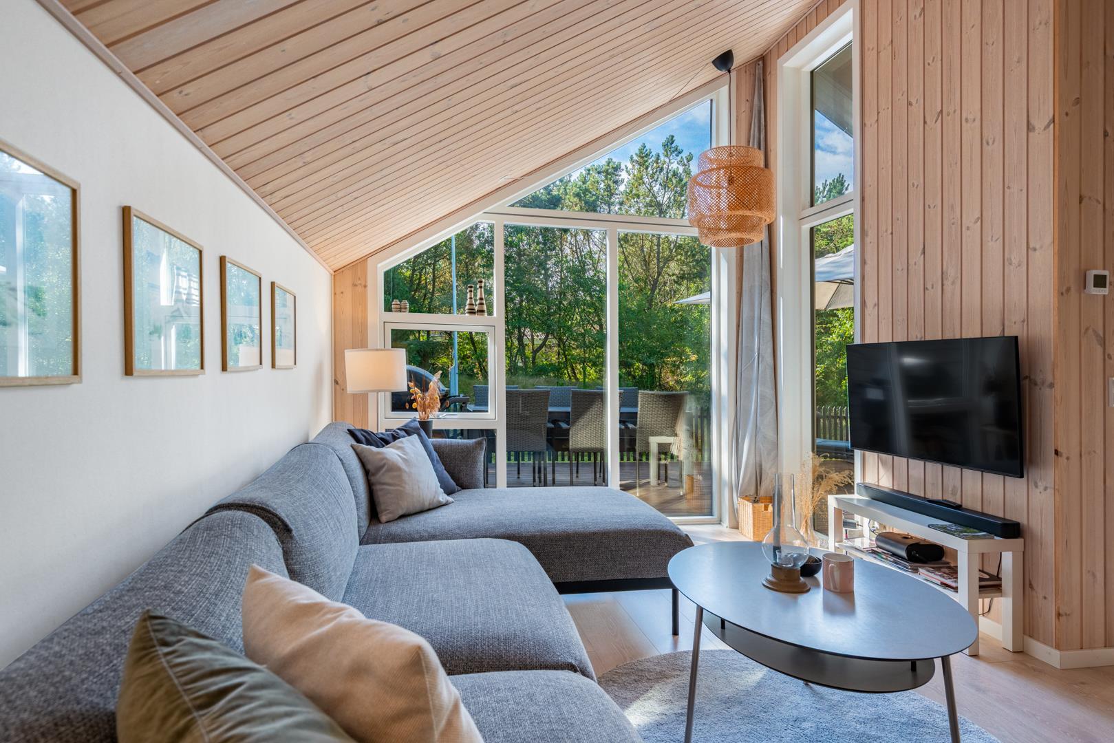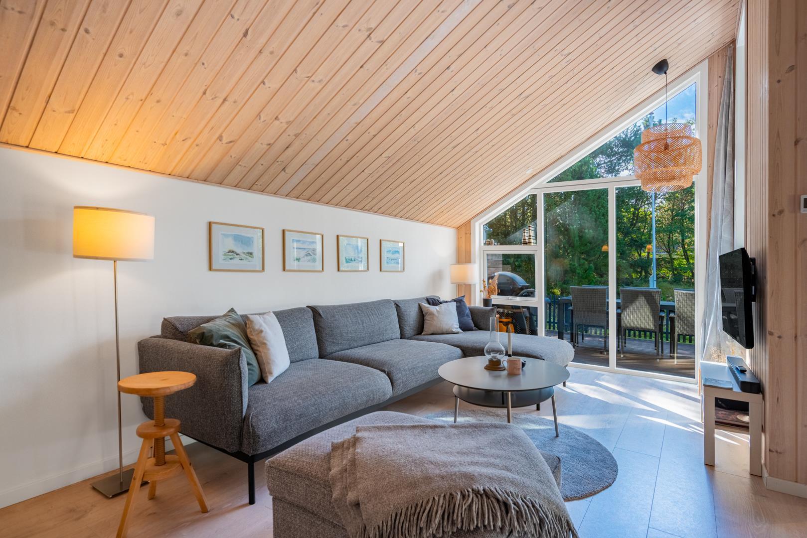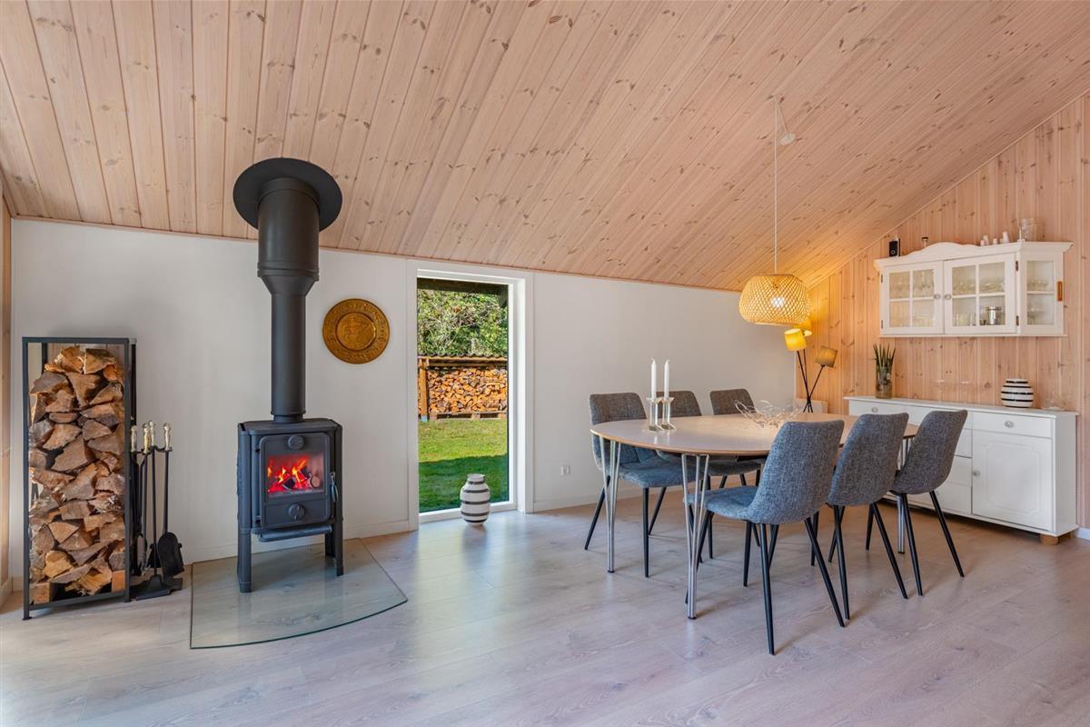 Der offene Wohn- und Essbereich bildet das Herz des Ferienhauses. Große Fenster lassen viel Licht herein und geben den Blick ins Grüne frei, während helle Holzelemente für eine freundliche Atmosphäre sorgen. Der Kaminofen macht den Raum zu einem gemütlichen Treffpunkt an kühlen Tagen, unterstützt von einer energiesparenden Wärmepumpe, die das ganze Jahr über für ein angenehmes Klima sorgt.