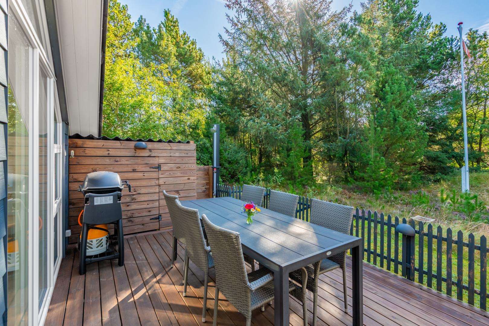 Das Ferienhaus liegt auf einem großzügigen, grünen Grundstück, das vollständig eingezäunt ist und damit Sicherheit und Ruhe zugleich bietet. Auf der überdachten Terrasse könnt ihr den Tag entspannt beginnen oder am Abend bei einem Glas Wein ausklingen lassen. Kinder haben im Garten viel Platz zum Spielen und freuen sich über die Schaukel, während sich euer Hund frei bewegen kann. Ein besonderes Extra ist die Außendusche, die nach einem Bad in der Nordsee oder einem langen Strandtag für Erfrischung sorgt.
