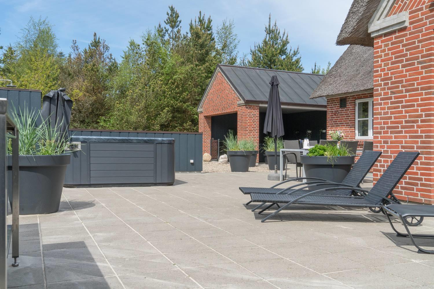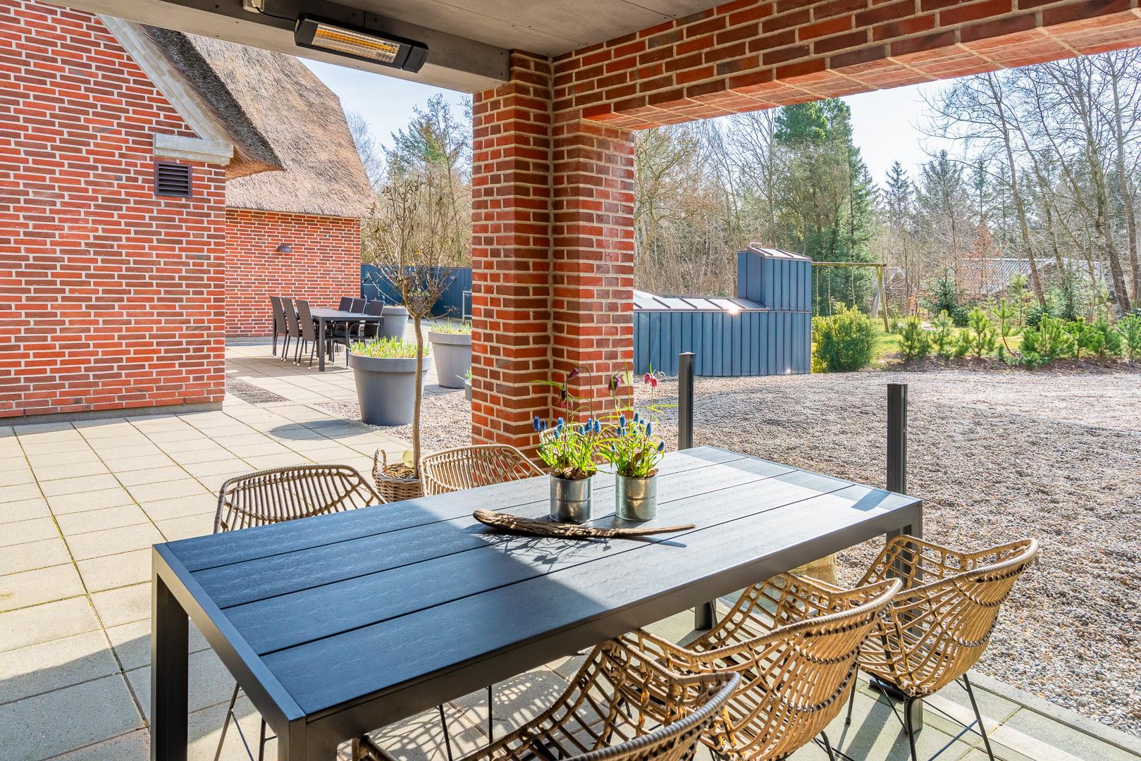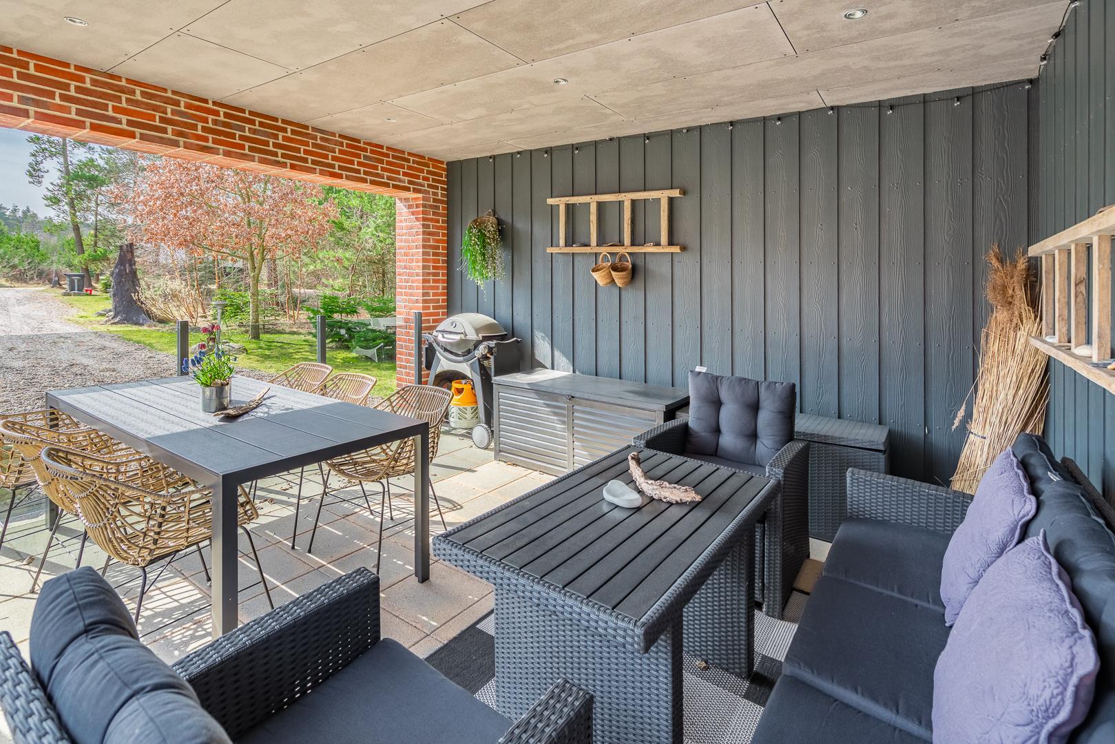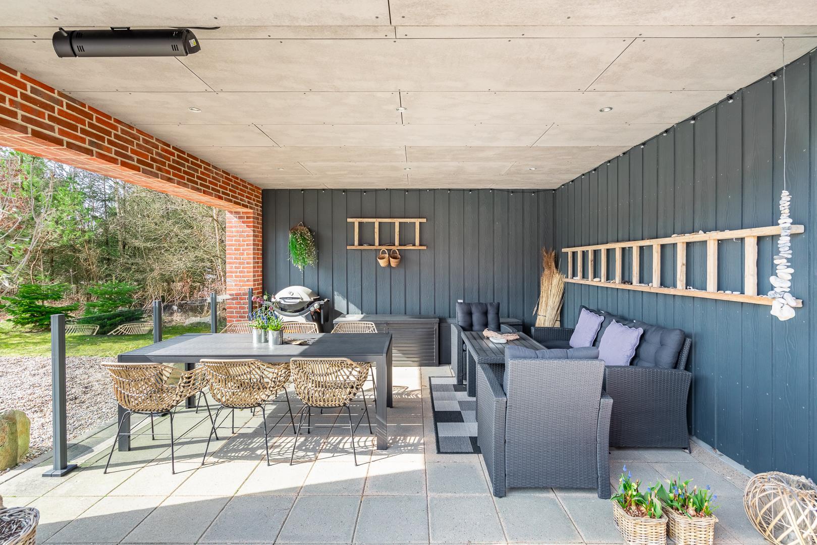 Große, gemütliche und gut ausgestattete Terrasse mit Sonnenliegen, Sonnenschirm, Gartenmöbeln und der damit verbundenen Gemütlichkeit. An einem kühlen Abend oder um Schatten zu suchen, gibt es eine große und überdachte Terrasse mit Lounge-Set und Infrarot Wärme