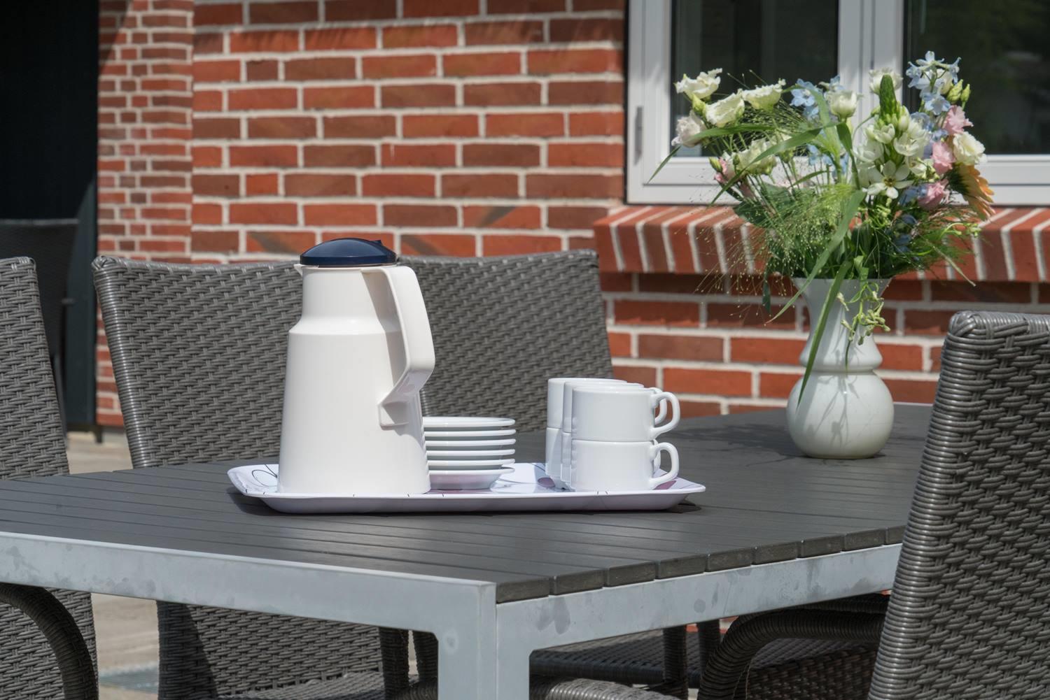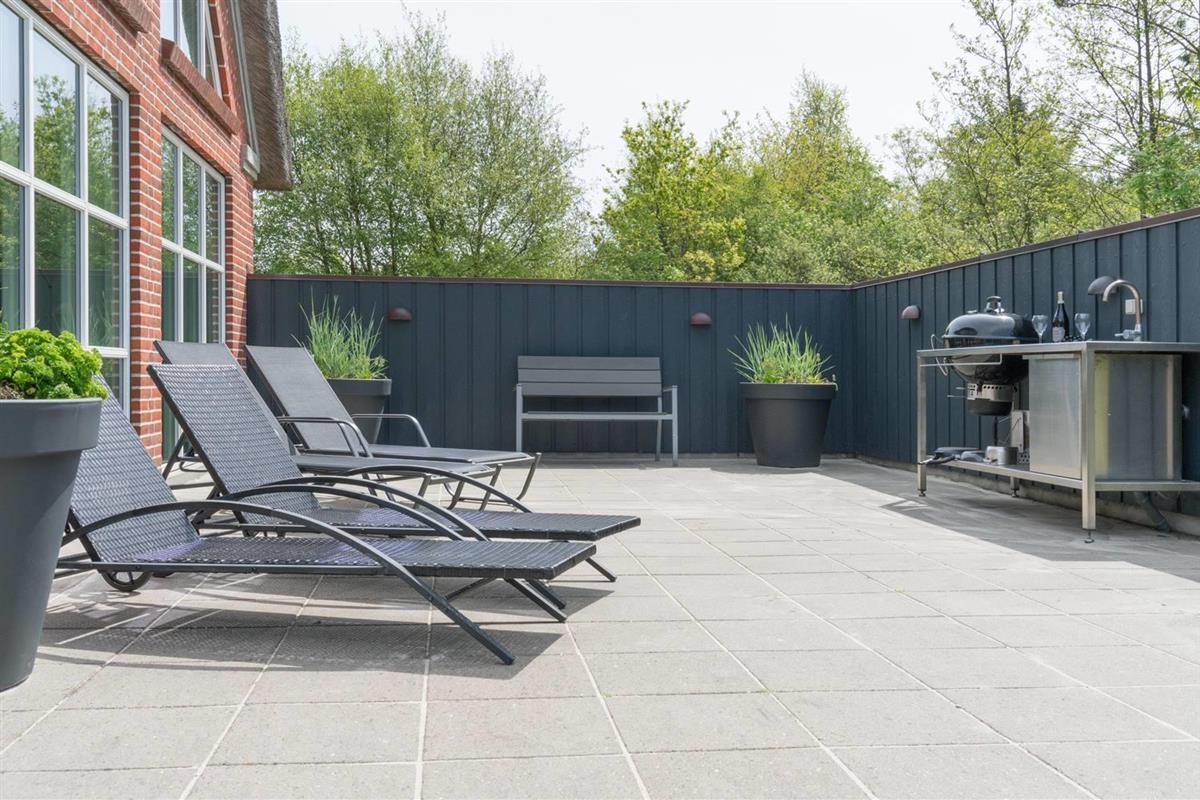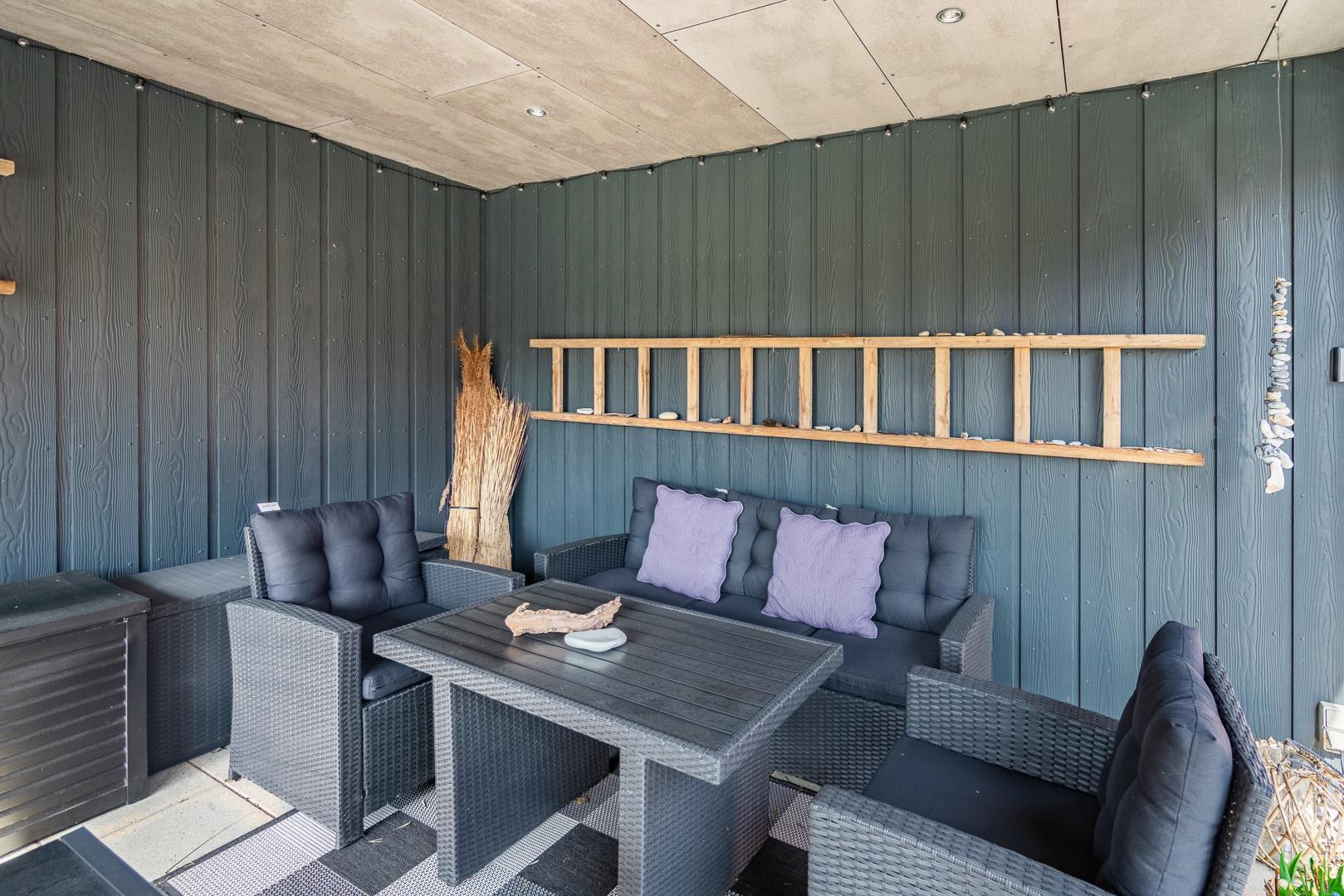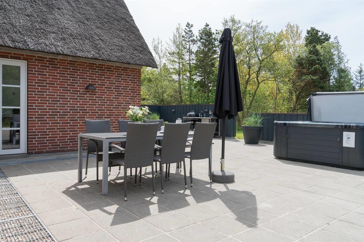 Große, gemütliche und gut ausgestattete Terrasse mit Sonnenliegen, Sonnenschirm, Gartenmöbeln und der damit verbundenen Gemütlichkeit. An einem kühlen Abend oder um Schatten zu suchen, gibt es eine große und überdachte Terrasse mit Lounge-Set und Infrarot Wärme