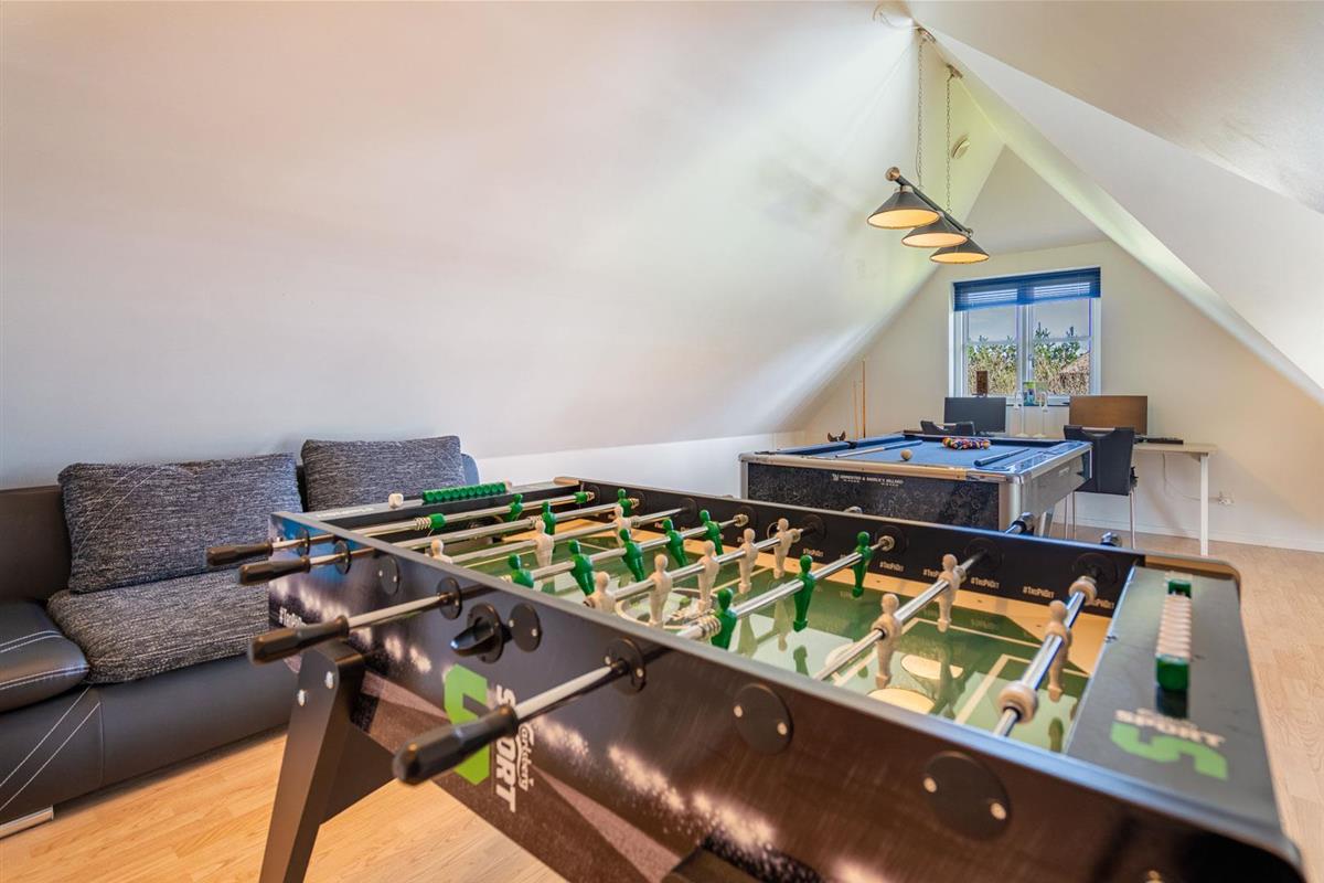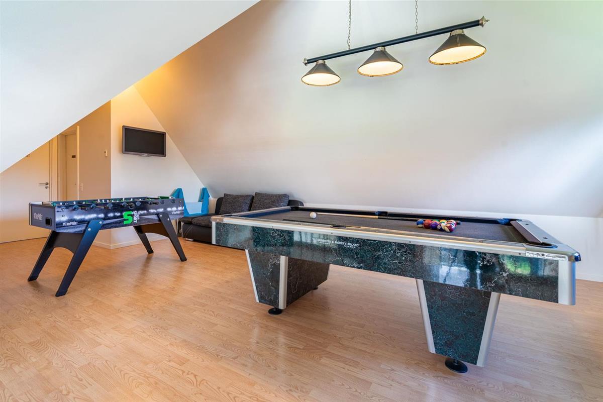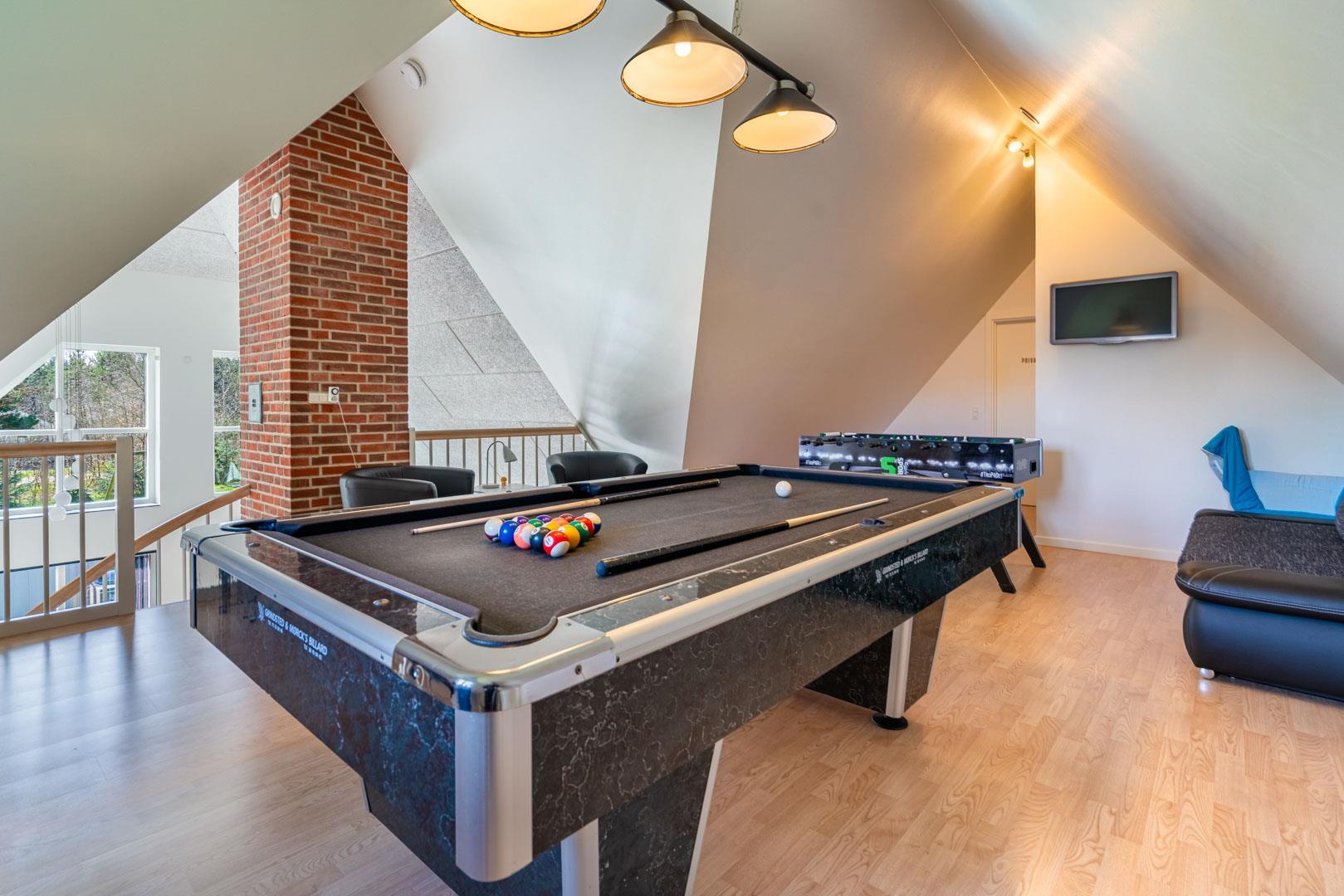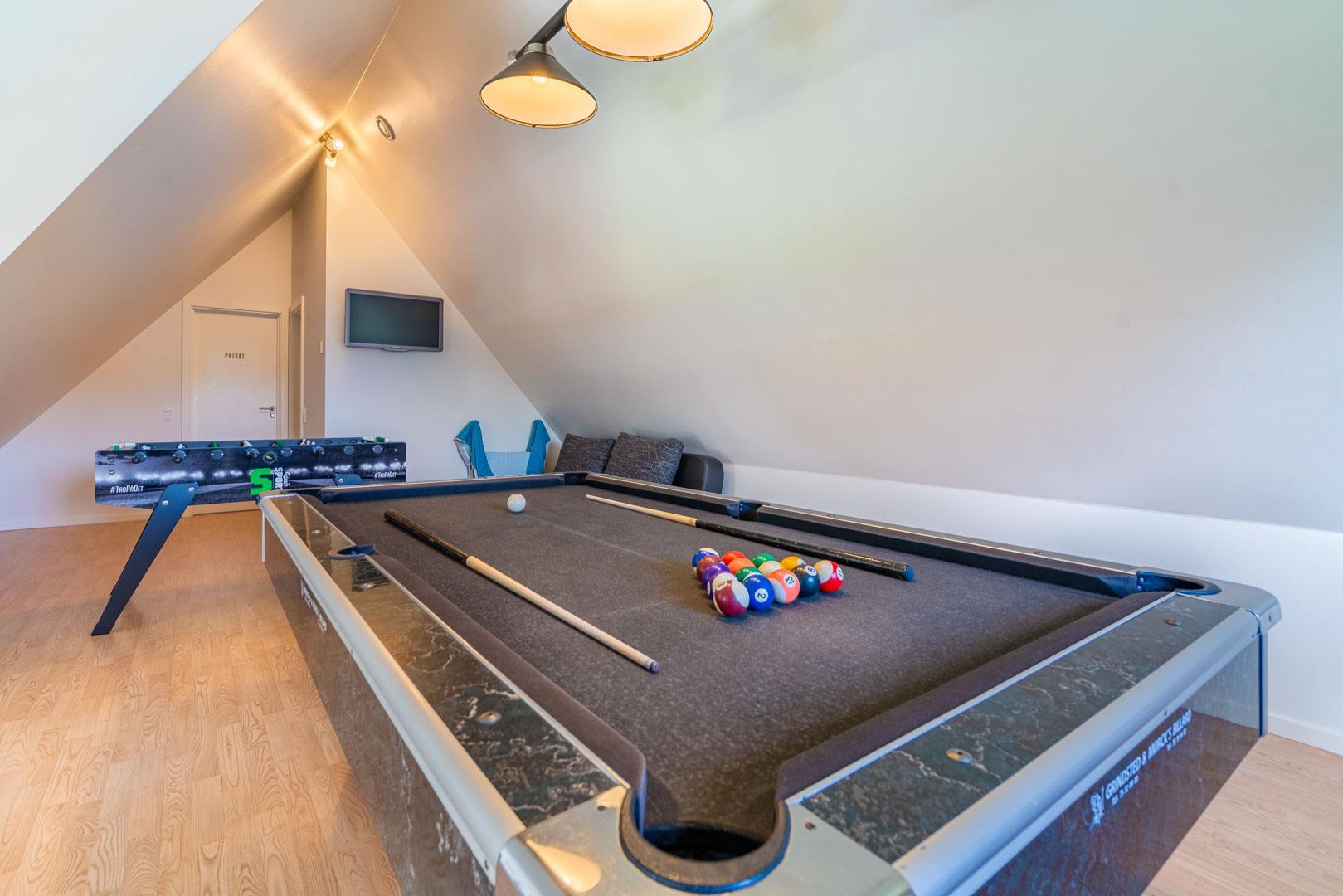 Sie erhalten einen Aktivitätsraum mit Billard, Tischfußball und TV sowie eine Aussendusche und einen Aussenwhirlpool, in dem Sie sich zu jeder Jahreszeit vergnügen können.