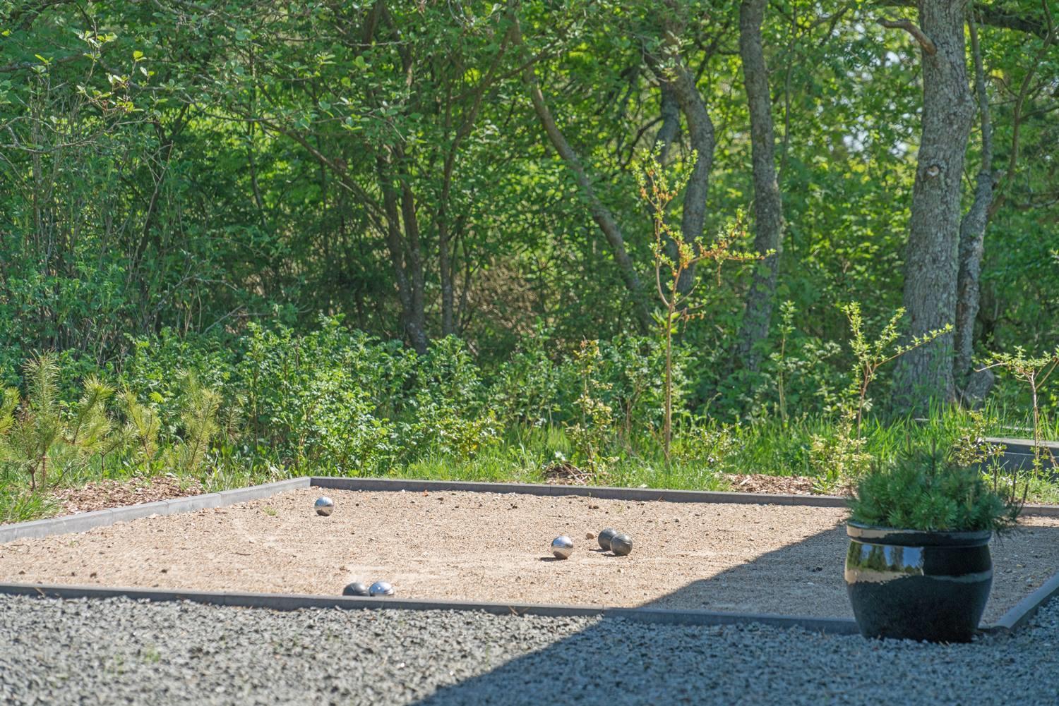 Auch für Bewegung ist gesorgt: Eine eigene Petanquebahn lädt zu entspannten Spielen ein, während die Kinder sich an der Schaukel erfreuen. Das Auto parkt ihr ganz bequem und trocken im Carport – so bleibt ihr auch bei Nordseewetter flexibel.