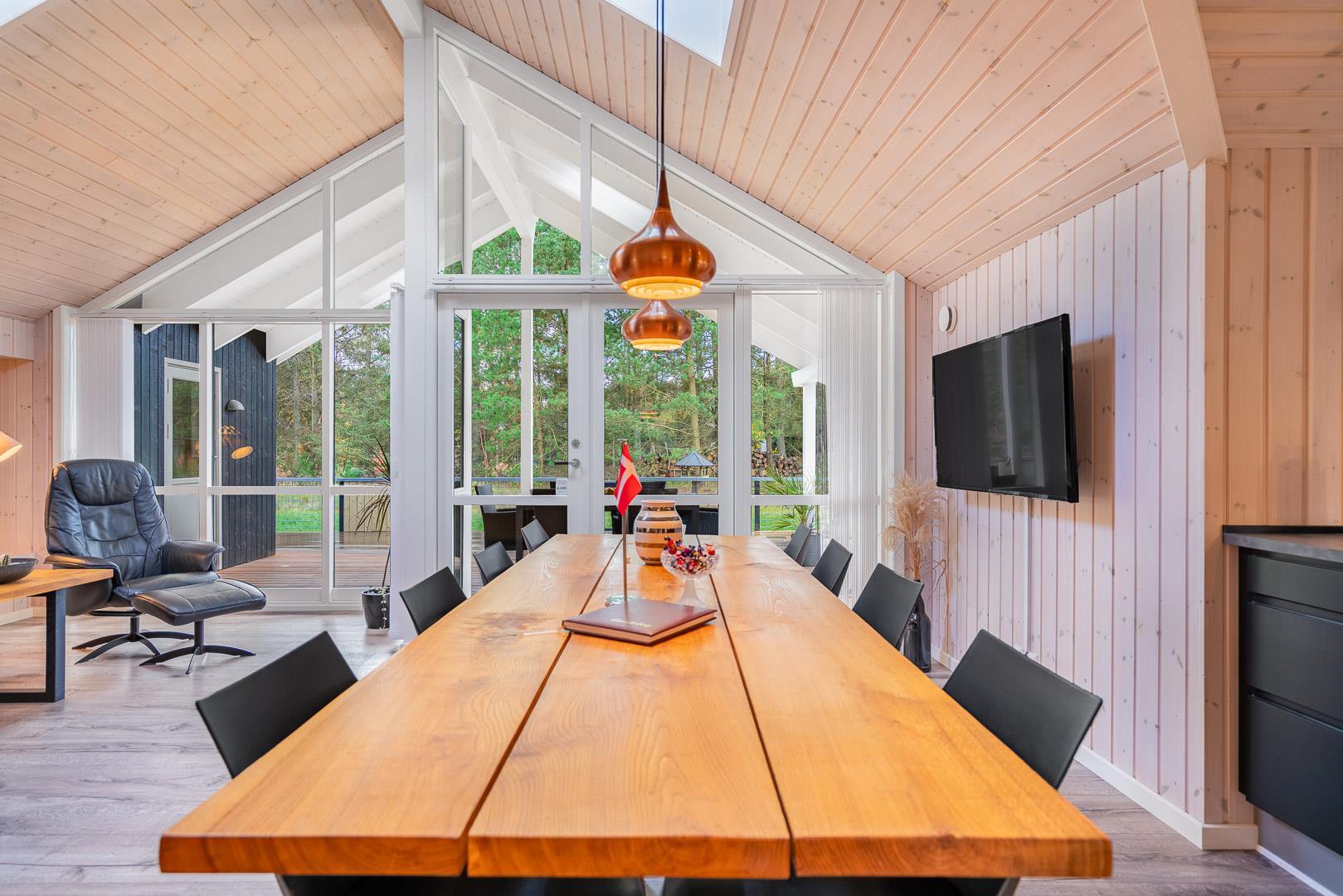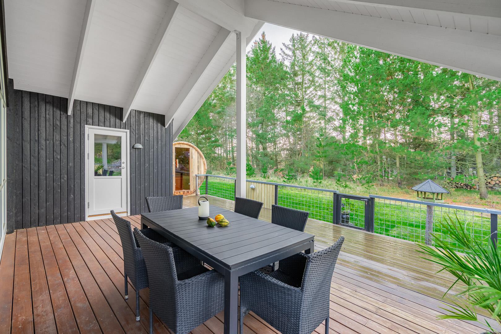 Sobald ihr die Terrassentür öffnet, beginnt euer Urlaub im Freien: Die überdachte, geschlossene Terrasse bietet euch einen geschützten Platz – ganz gleich, ob die Sonne scheint oder eine frische Brise weht. Hier könnt ihr frühstücken, lesen oder einfach den Tag auf euch wirken lassen – mitten in der Natur, ganz in Ruhe.