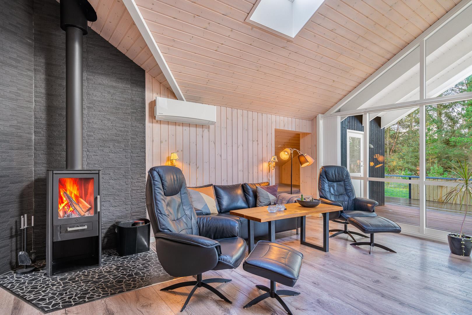 Im Mittelpunkt steht der offene Wohnbereich mit den großen Fenstern, die viel Tageslicht hineinlassen und den Blick ins Grüne freigeben. Macht es euch auf dem Sofa gemütlich, während der Kamin an kühleren Tagen für wohlige Wärme sorgt. Eine moderne Wärmepumpe reguliert das Raumklima effizient – damit ihr euch zu jeder Jahreszeit rundum wohlfühlt.