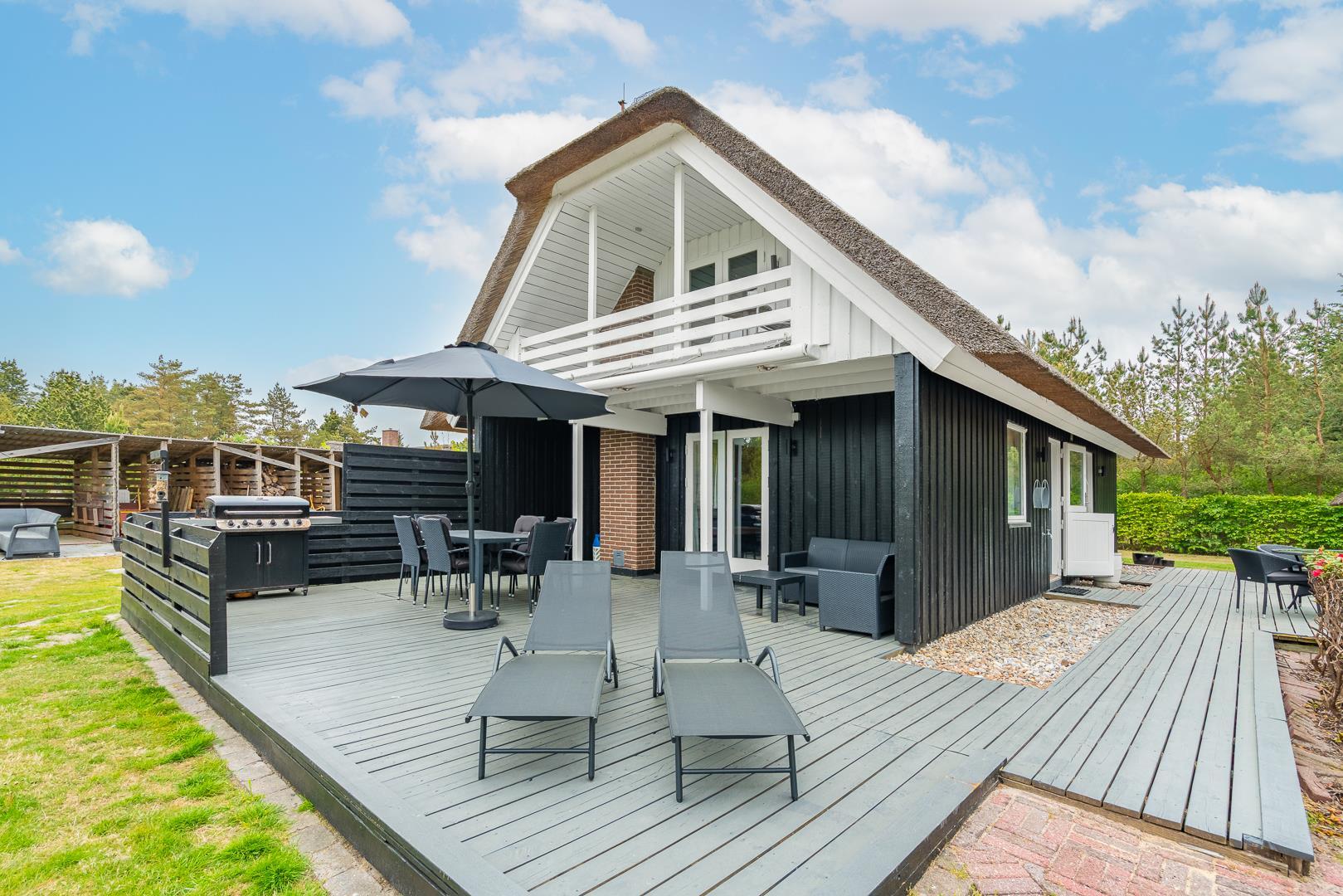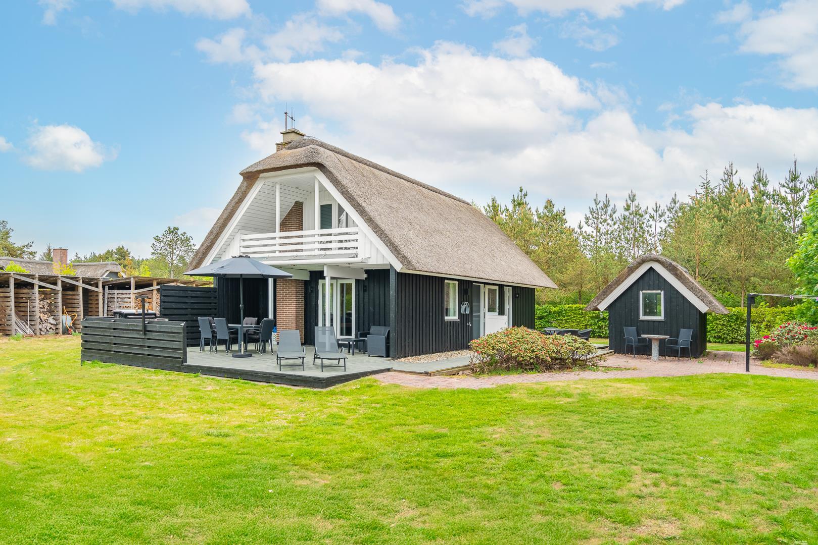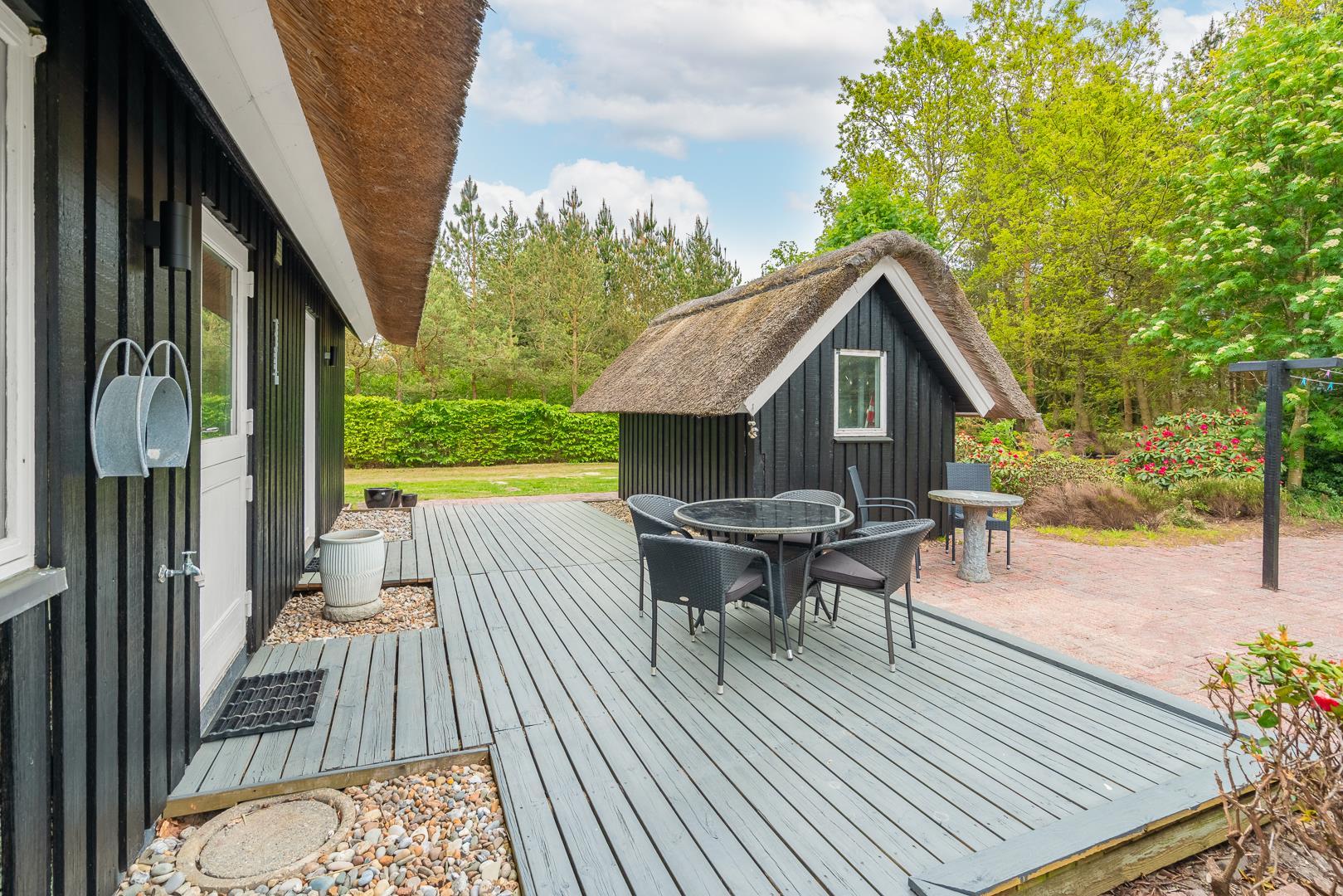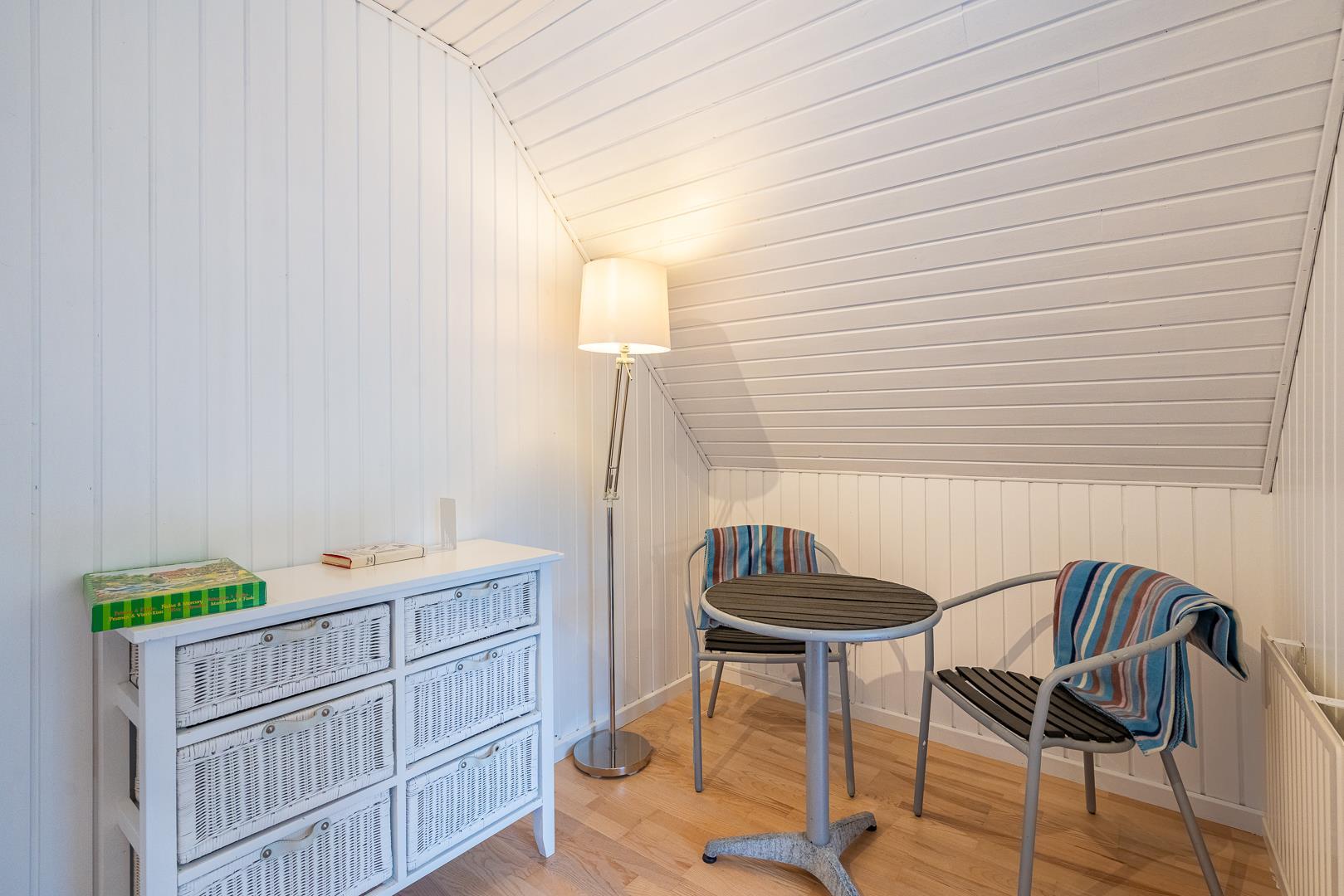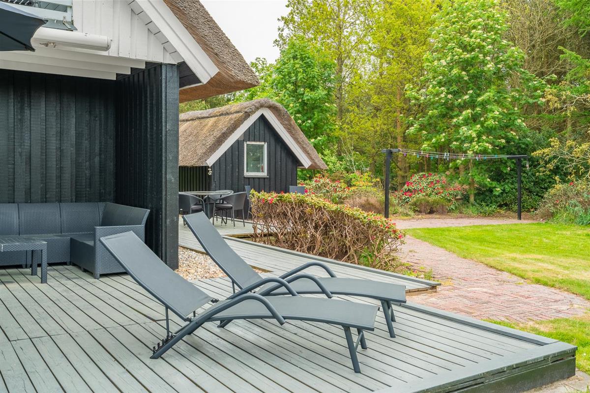 Im Obergeschoss lädt eine kleine Leseecke auf der Galerie zu ruhigen Momenten ein. Mehrere Terrassen – teils überdacht – mit Garten- und Loungemöbeln sowie Liegestühlen bieten vielfältige Möglichkeiten zur Erholung im Freien. Für mitgebrachte Fahrräder steht ein abschließbarer Abstellraum zur Verfügung.