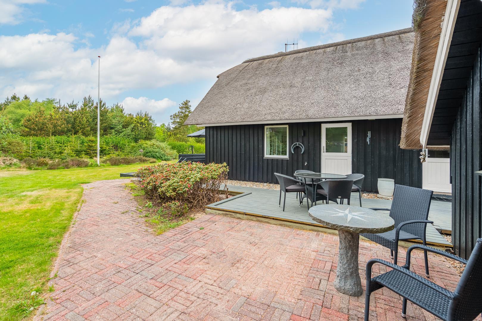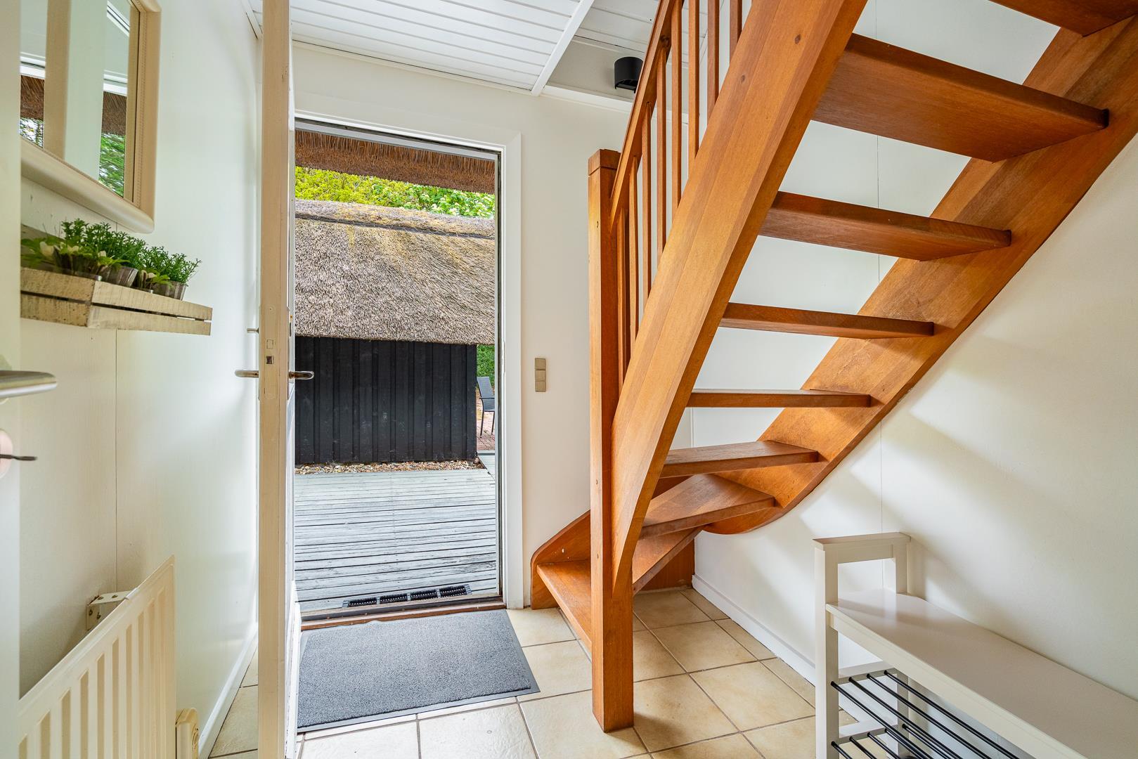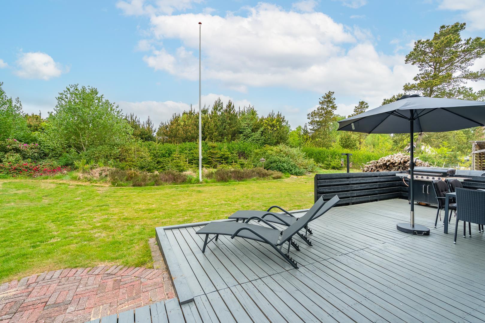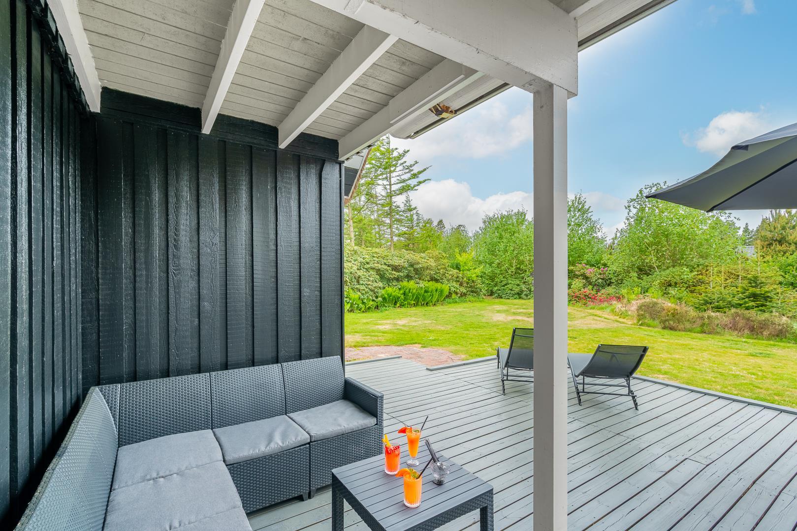 Im Obergeschoss lädt eine kleine Leseecke auf der Galerie zu ruhigen Momenten ein. Mehrere Terrassen – teils überdacht – mit Garten- und Loungemöbeln sowie Liegestühlen bieten vielfältige Möglichkeiten zur Erholung im Freien. Für mitgebrachte Fahrräder steht ein abschließbarer Abstellraum zur Verfügung.