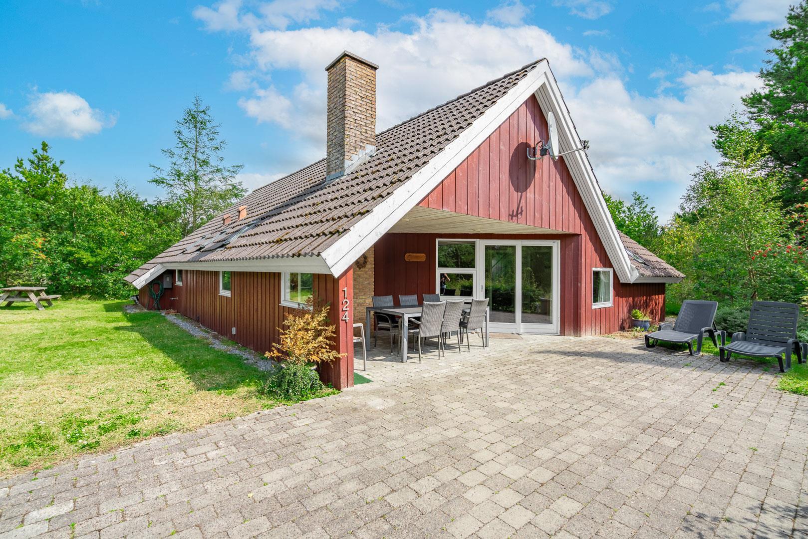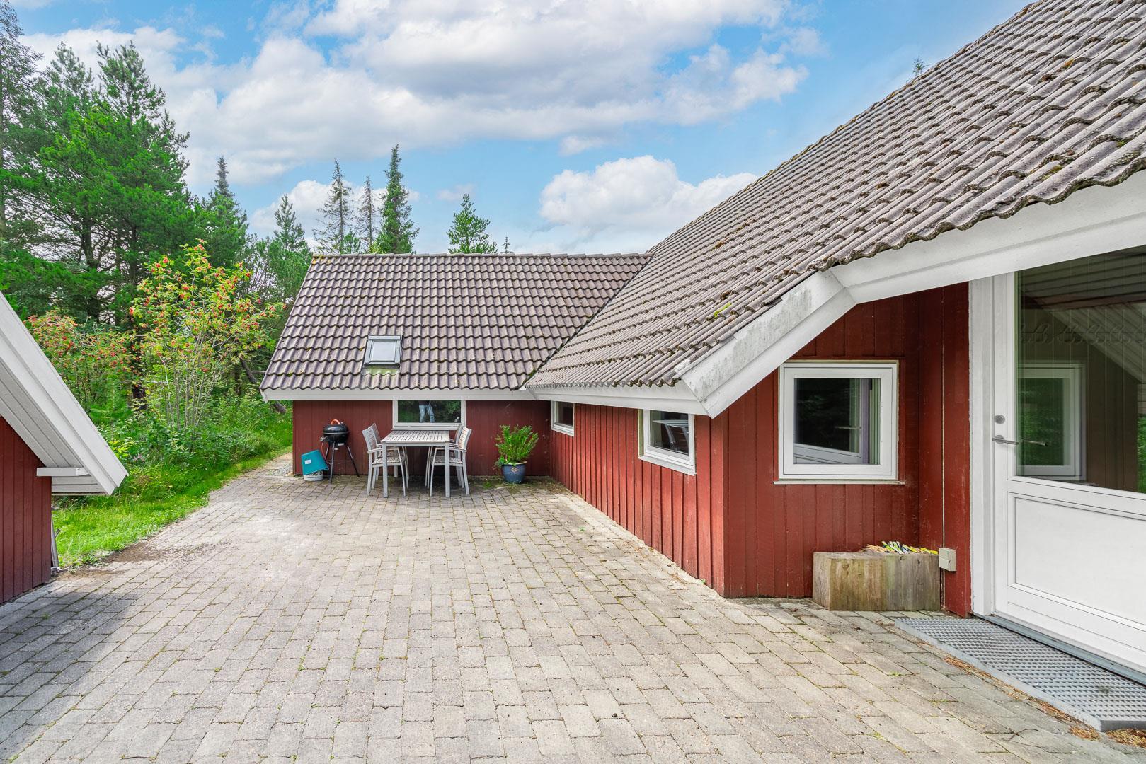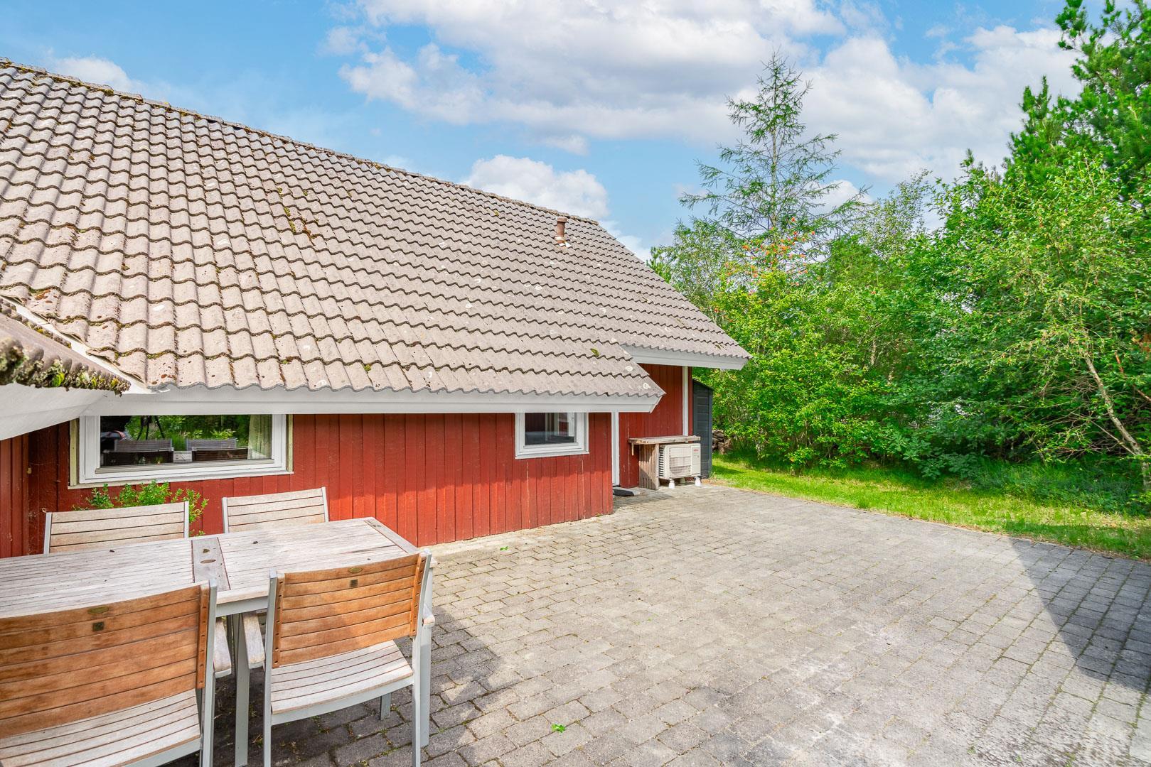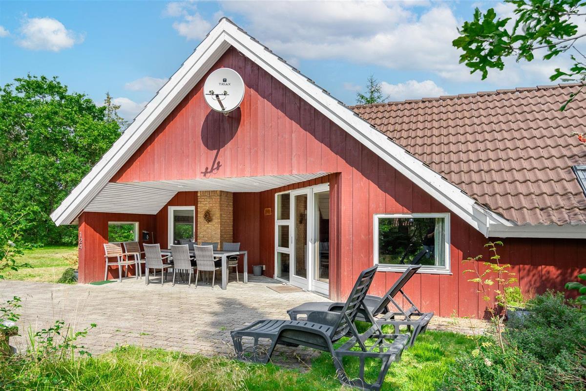 Das Grundstück liegt komplett im Grünen, von Bäumen und Heide umgeben. 2 schöne Terrassen (gegen Süd und Ost) rund ums Haus sowie eine Sonnenwiese samt Sonnenliegen und Gartenmöbeln laden zum relaxen ein. Eine kleine Wohlfühloase mitten in Houstrup.