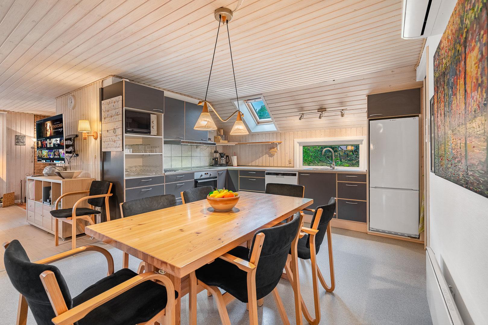Das große interessant geschnittene Wohnzimmer, komplett mit einer Holzdecke und hellem Boden ausgestattet, ist der Mittelpunkt und Treffpunkt des Hauses. Die Wohnstube, mit Kaminofen und großem TV (über 50 verschiedene deutsche TV-Programmen), laden zum verweilen ein. Von hier gelangt man zum einen in die große, gut ausgestattete Küche, sowie zum anderen in die 4 verschiedenen Schlafzimmer - davon 3 mit Doppelbetten und 1 mit 2 Einzelbetten. Deshalb ist das Haus für 2 Familien geeignet. 2 moderne Badezimmer mit Fussbodenheizung erwarten sie, eines mit Badewanne mit Whirlpoolfunktionen, eines mit Dusche ausgestattet. Vom Flur gibt es Zutritt zu einer neue infrarote Sauna .Quasi aus jedem Fenster des Hauses wandert der Blick ins Grüne.
