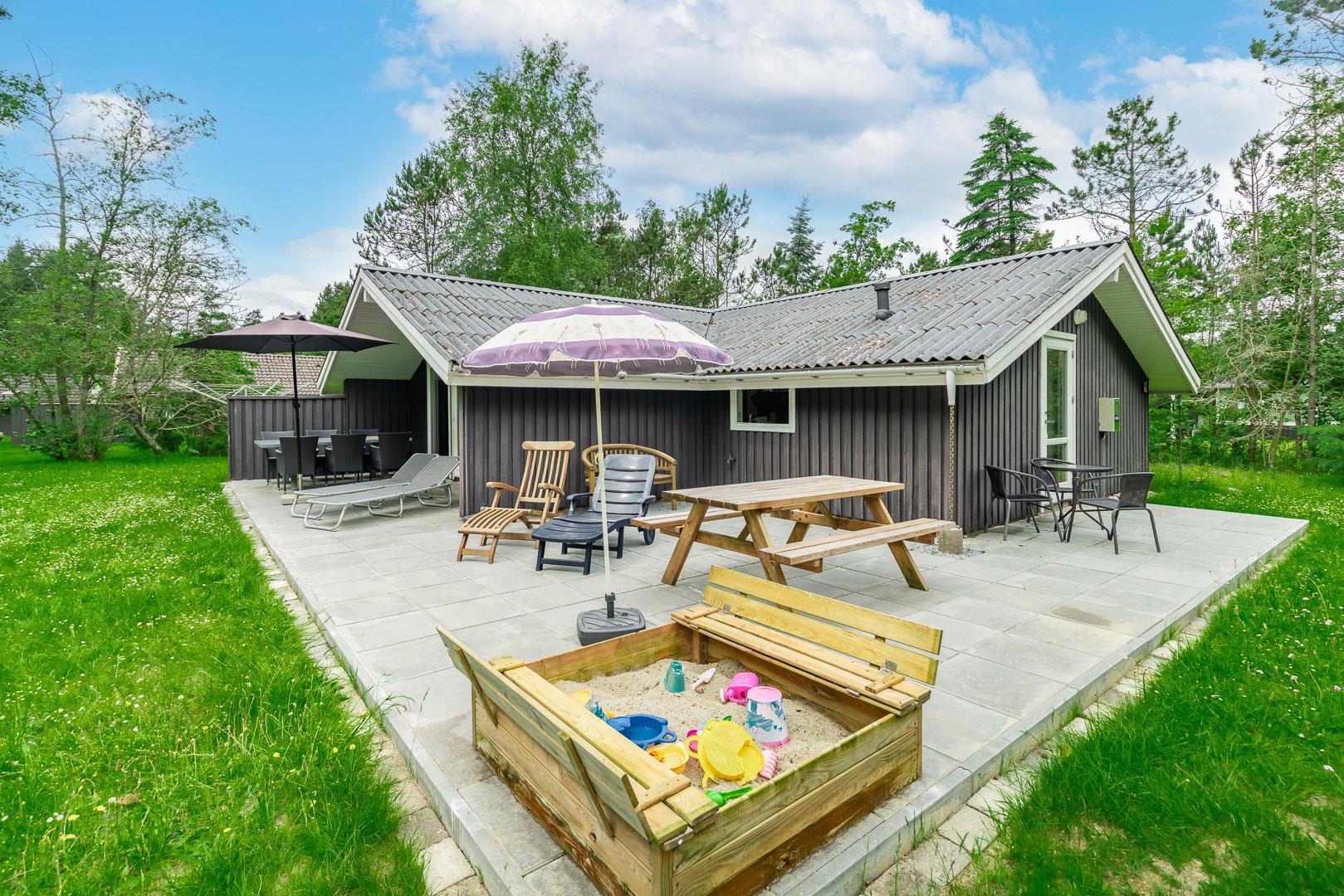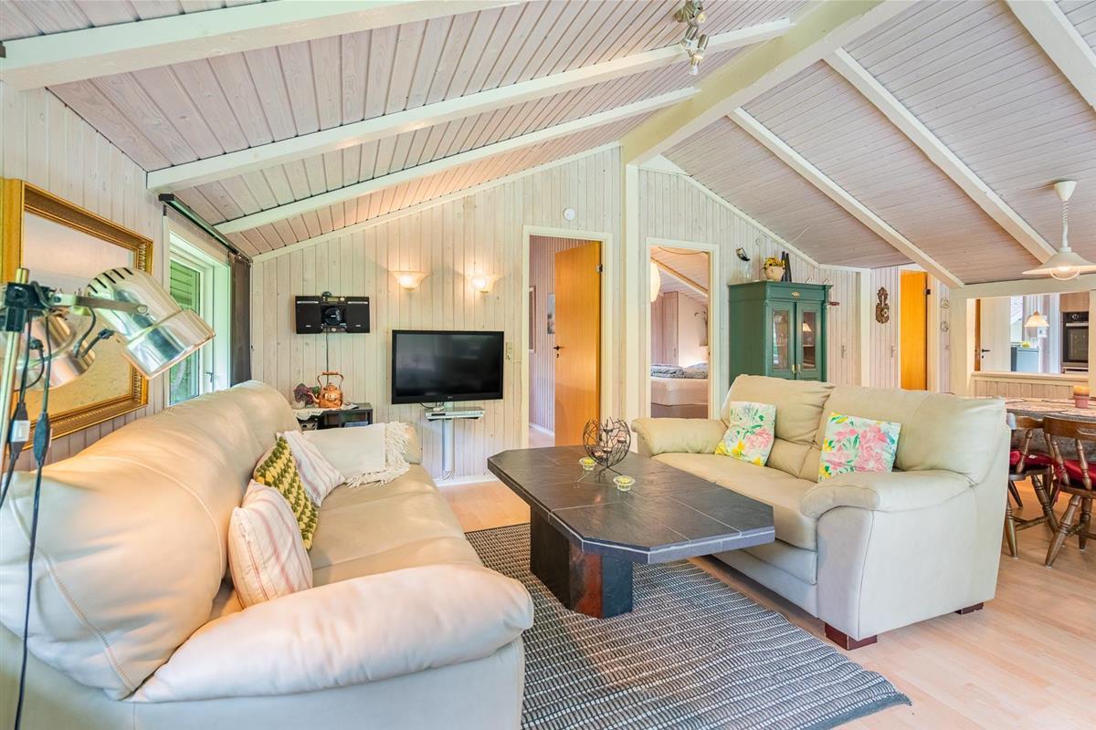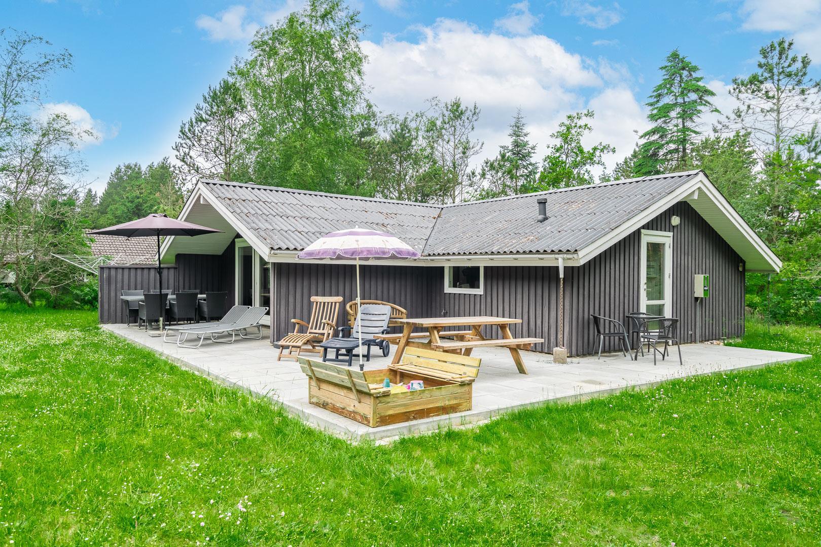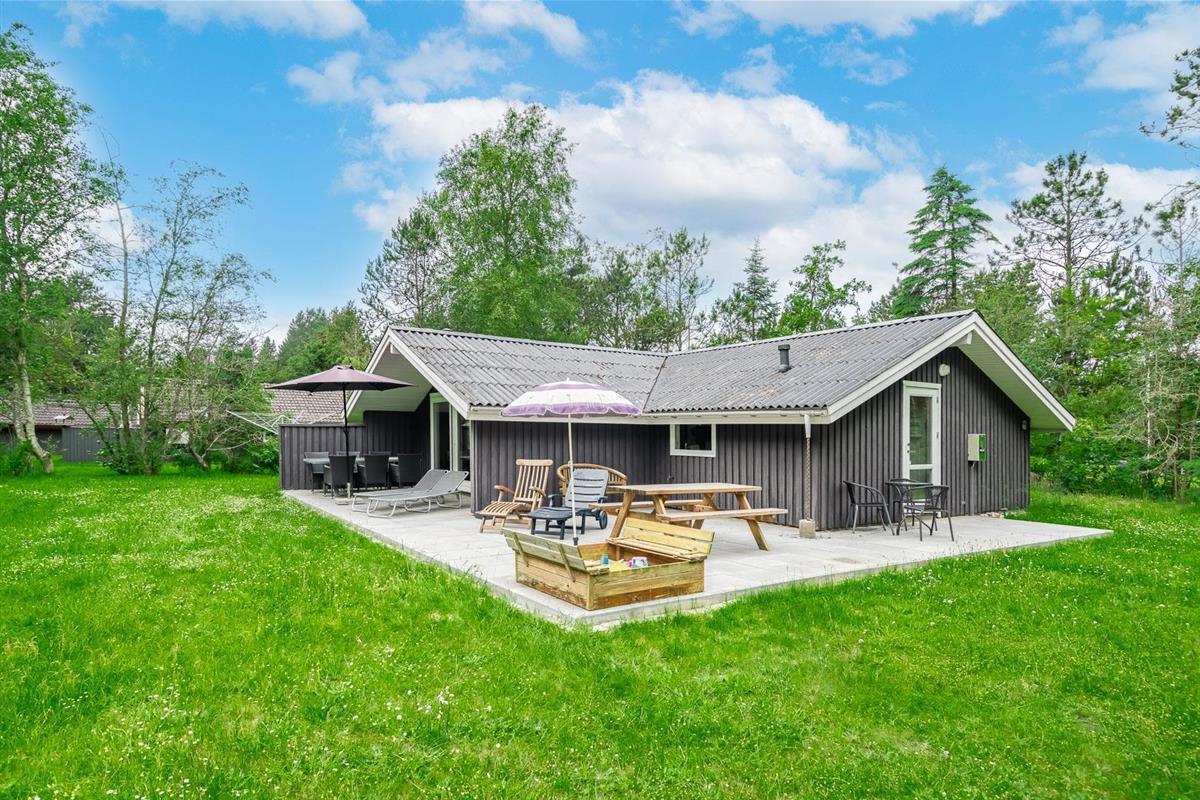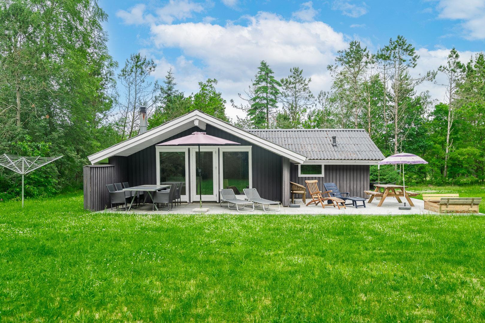Auf einem tollen geschlossenen und ungestörten Grundstück am Ende einer Sackgasse liegt dieses gemütliche Ferienhaus mit dazugehörigem Carport. Das Haus ist eingerichtet mit: Eingang, funktionaler Winkelküche, Doppelstockbettzimmer mit 2 Schlafplätzen, 2 gute Schlafzimmer mit Doppelbetten. Die Stube ist gut möbliert mit Ledersofa, sowie einer Korbecke für Gemütlichkeit und Spiel. Außerdem gibt es eine Essecke. Von der Stube gibt es Zugang zur teilweise überdachten Holzterrasse, die natürlich mit Gartenmöbeln und Sonnenliegen ausgestattet ist.