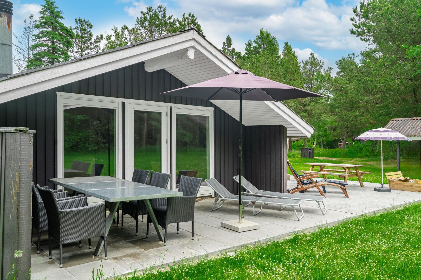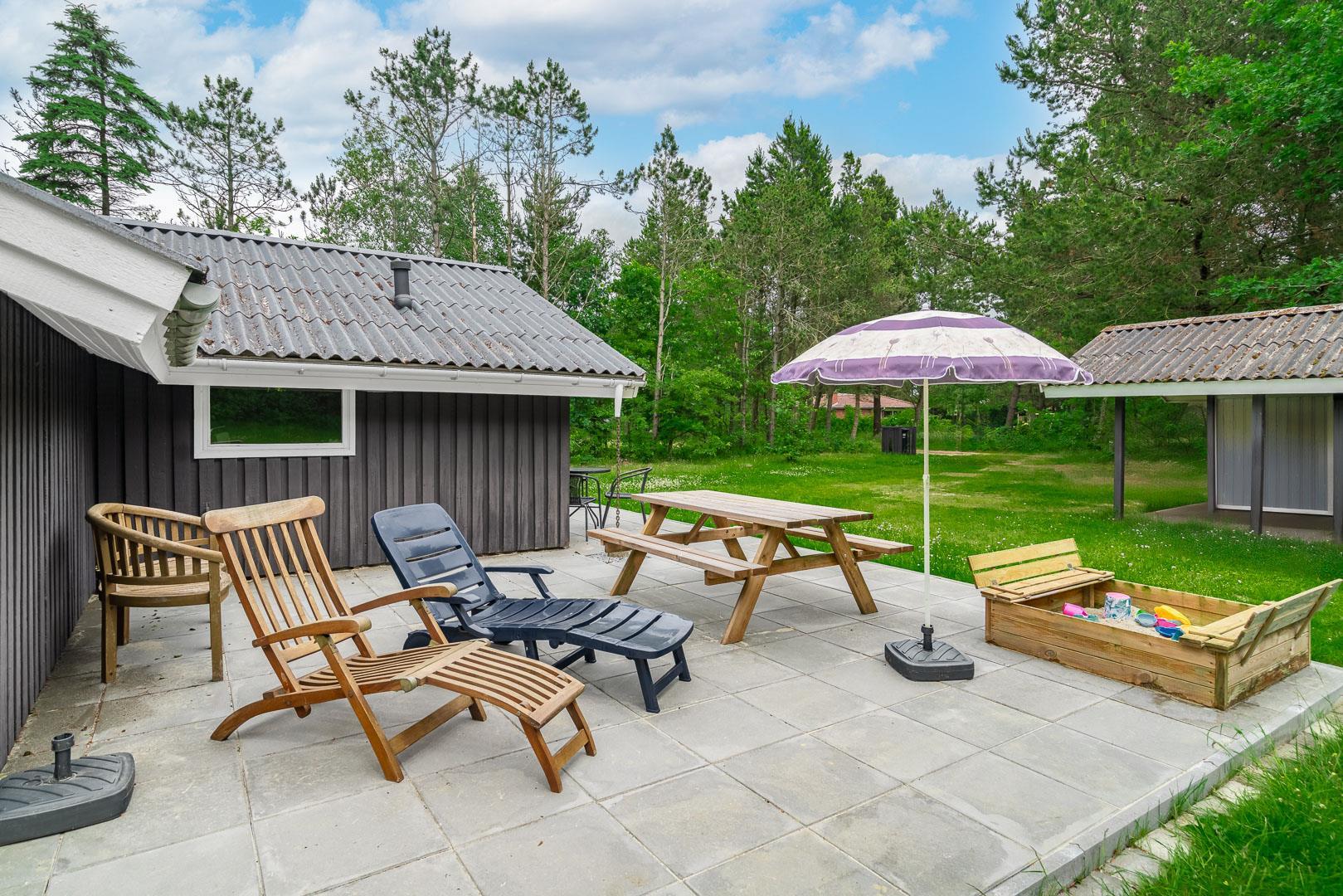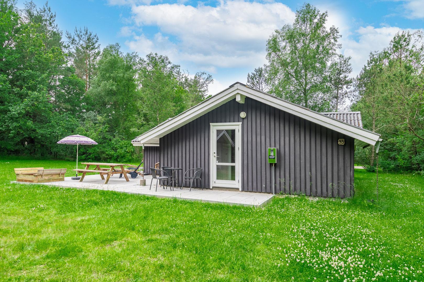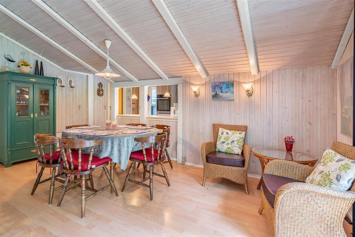 Auf einem tollen geschlossenen und ungestörten Grundstück am Ende einer Sackgasse liegt dieses gemütliche Ferienhaus mit dazugehörigem Carport. Das Haus ist eingerichtet mit: Eingang, funktionaler Winkelküche, Doppelstockbettzimmer mit 2 Schlafplätzen, 2 gute Schlafzimmer mit Doppelbetten. Die Stube ist gut möbliert mit Ledersofa, sowie einer Korbecke für Gemütlichkeit und Spiel. Außerdem gibt es eine Essecke. Von der Stube gibt es Zugang zur teilweise überdachten Holzterrasse, die natürlich mit Gartenmöbeln und Sonnenliegen ausgestattet ist.