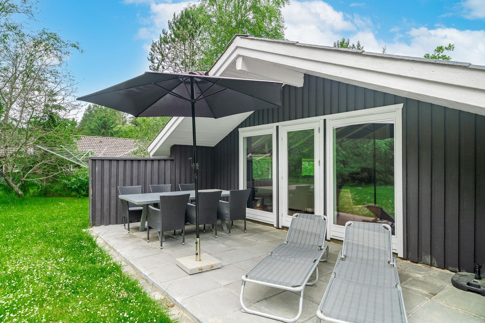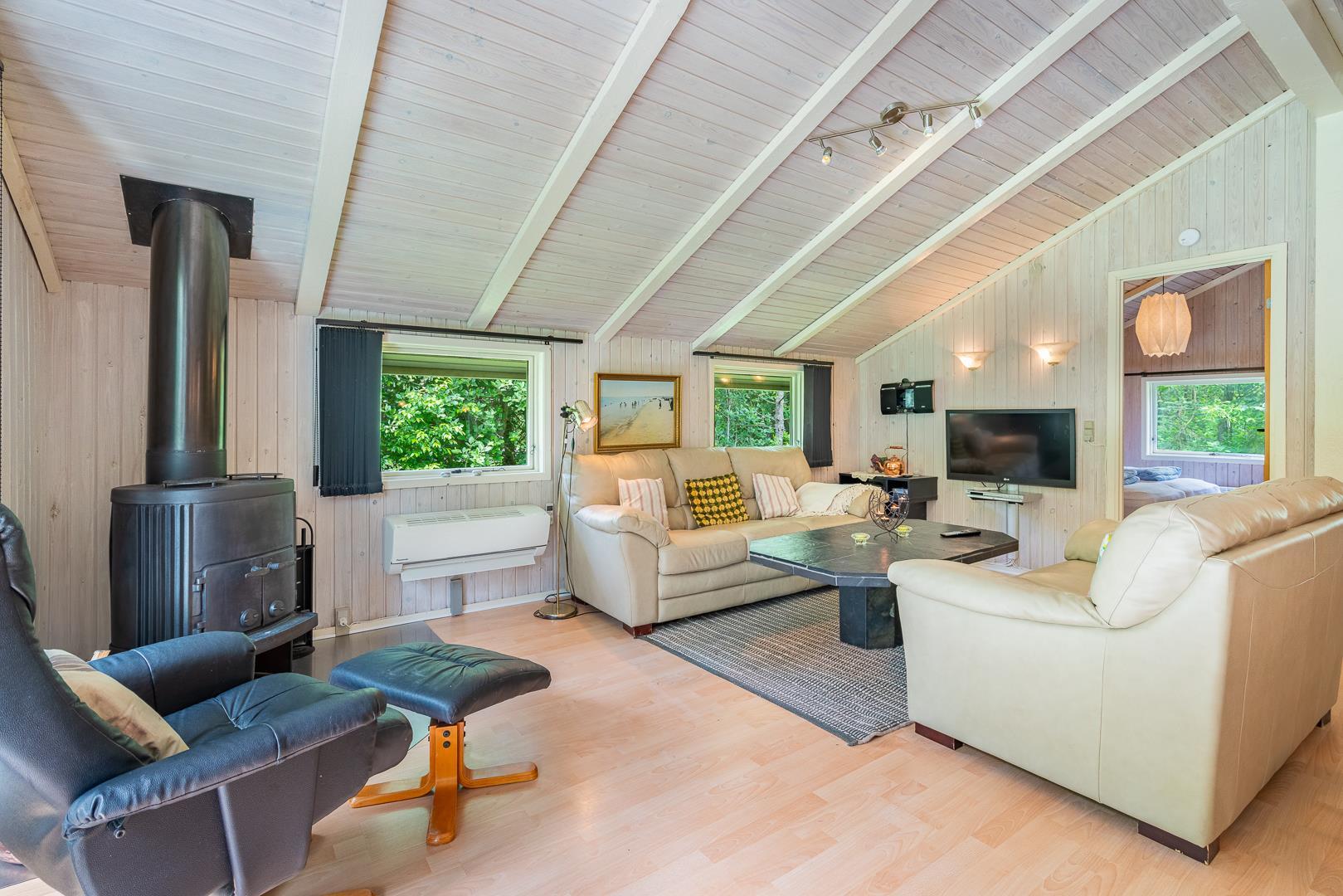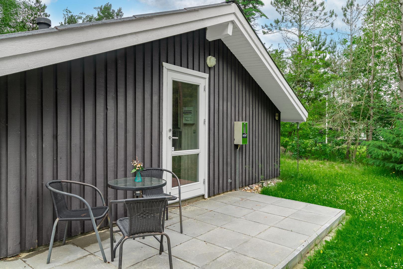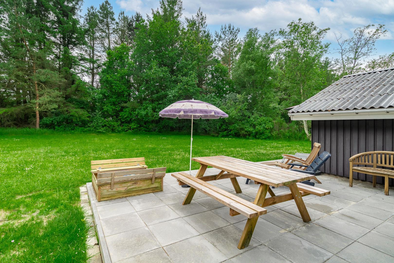 Auf einem tollen geschlossenen und ungestörten Grundstück am Ende einer Sackgasse liegt dieses gemütliche Ferienhaus mit dazugehörigem Carport. Das Haus ist eingerichtet mit: Eingang, funktionaler Winkelküche, Doppelstockbettzimmer mit 2 Schlafplätzen, 2 gute Schlafzimmer mit Doppelbetten. Die Stube ist gut möbliert mit Ledersofa, sowie einer Korbecke für Gemütlichkeit und Spiel. Außerdem gibt es eine Essecke. Von der Stube gibt es Zugang zur teilweise überdachten Holzterrasse, die natürlich mit Gartenmöbeln und Sonnenliegen ausgestattet ist.