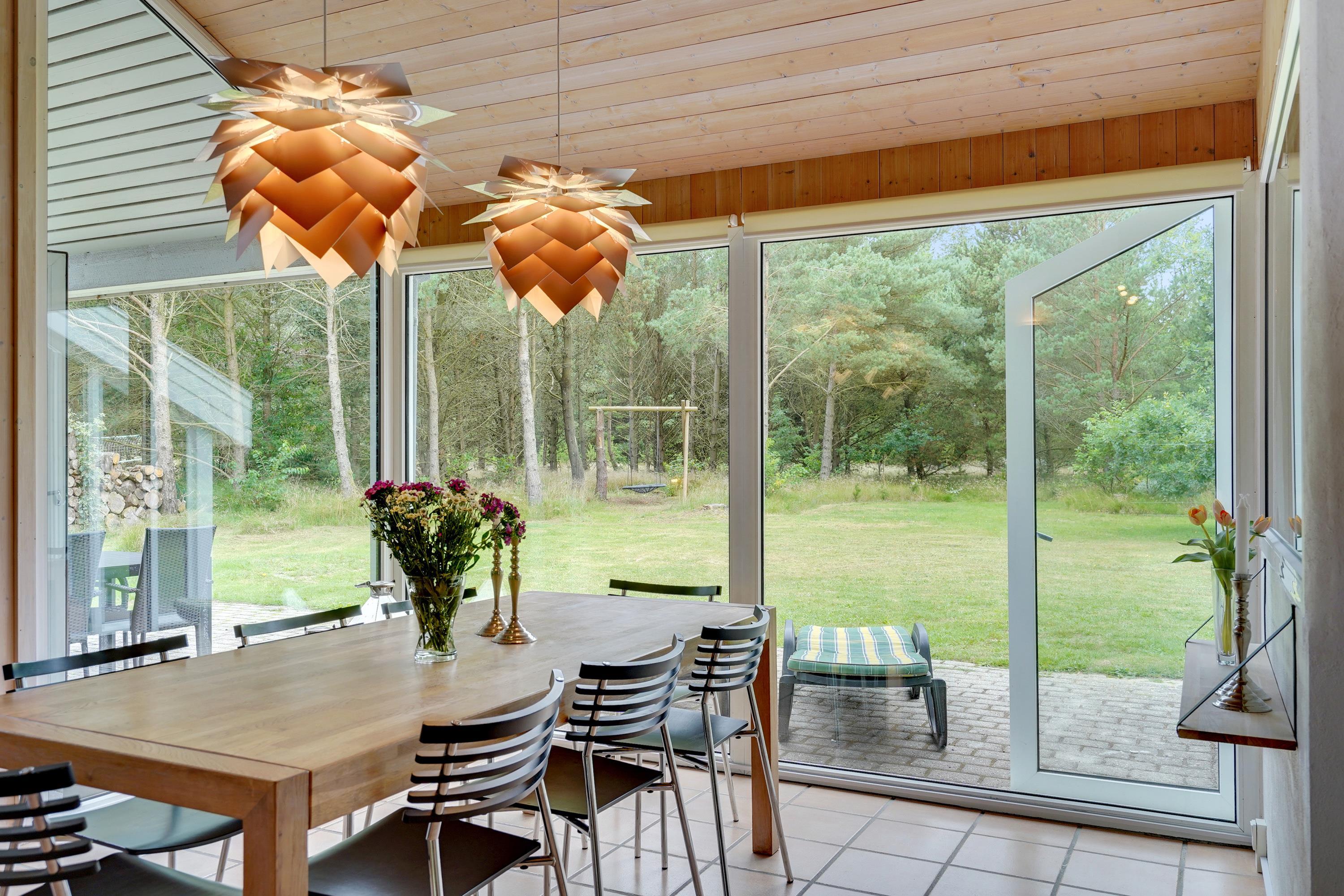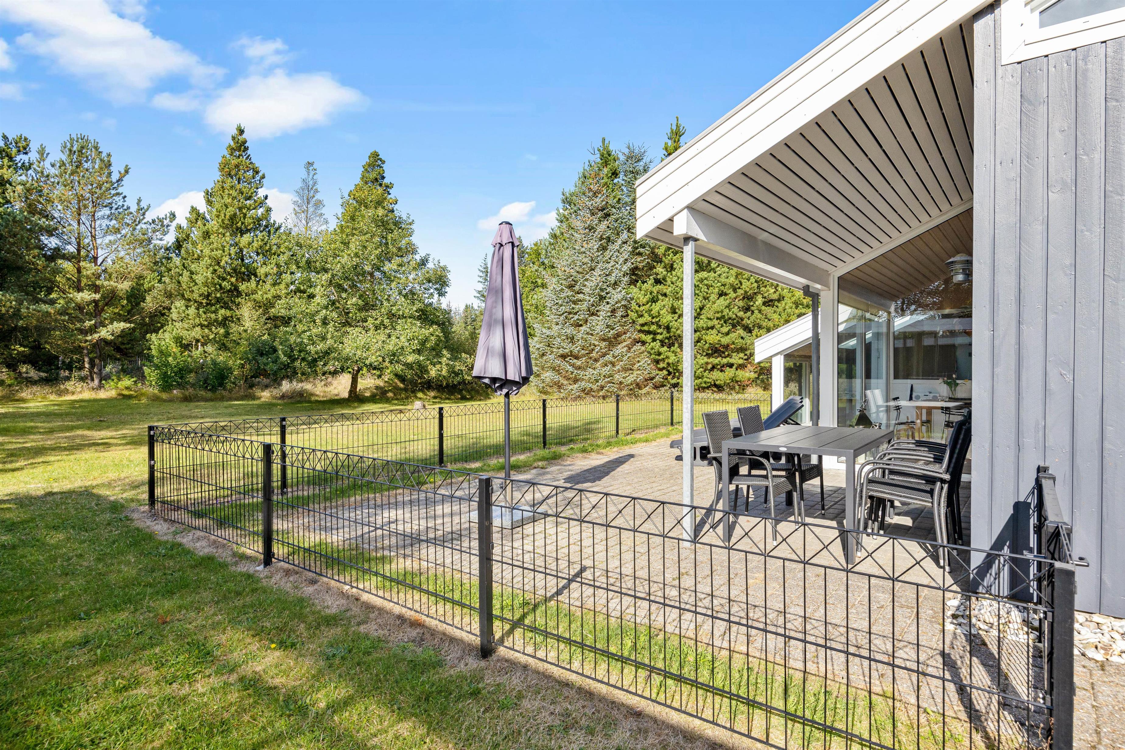 The holiday home sits on beautiful, generous natural grounds surrounded by green landscape, offering plenty of space for play and relaxation. From the living area, you have direct access to the spacious terrace, furnished with comfortable garden furniture. The terrace is both covered and fenced, particularly practical for families with small children or dogs, allowing you to relax outdoors while children and pets play safely.