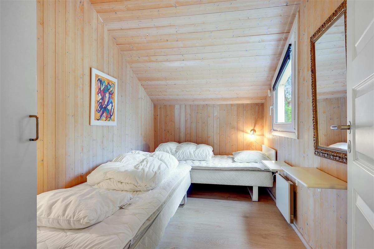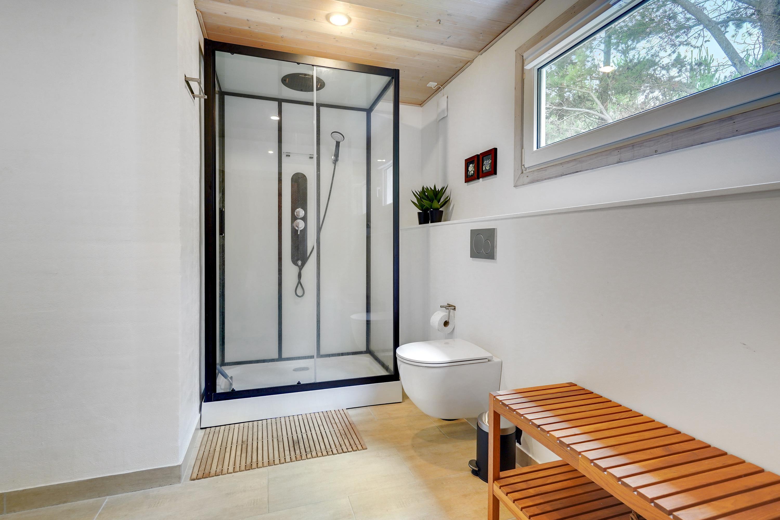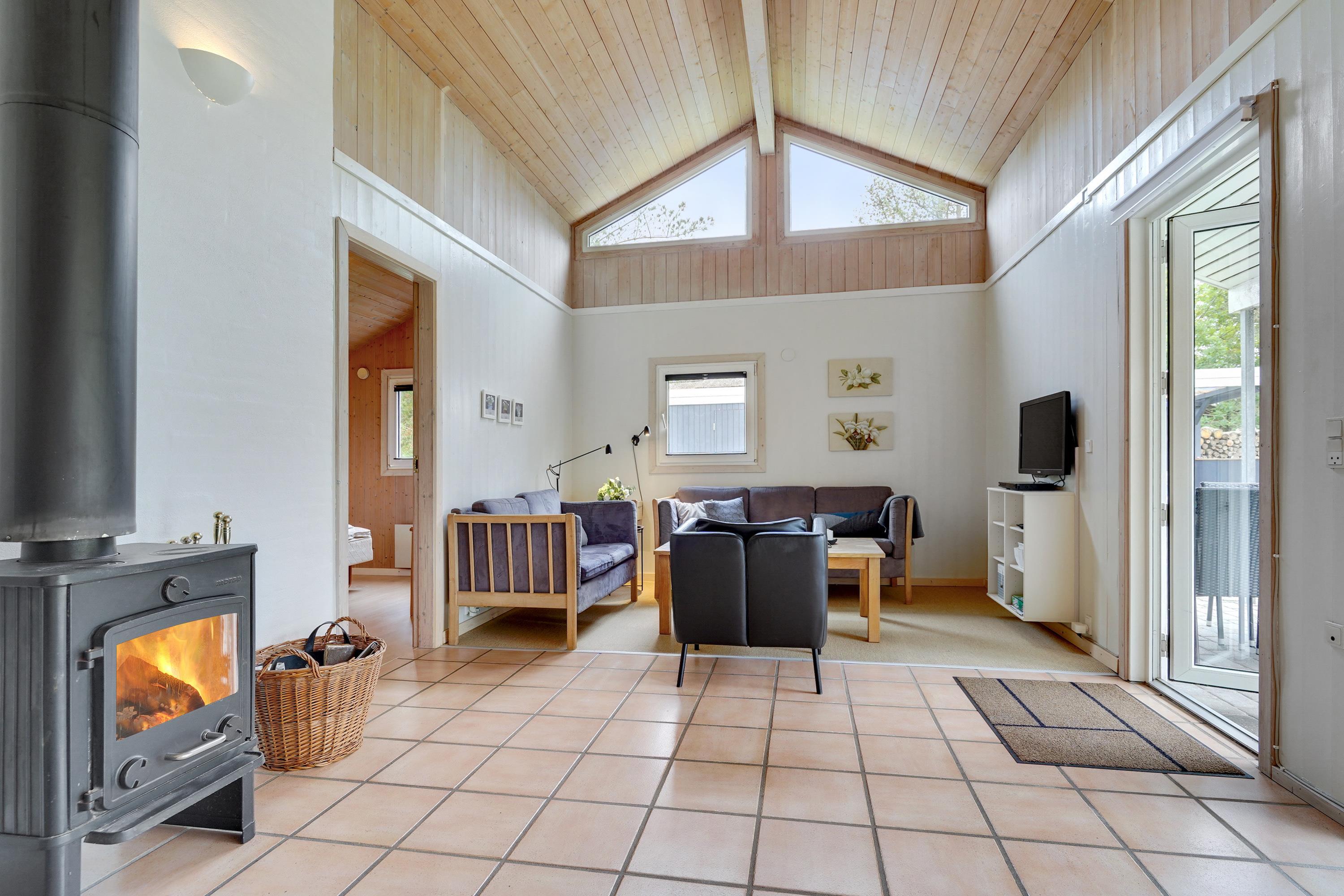 Both bathrooms feature underfloor heating, as does the living area, ensuring a pleasant temperature on cooler days. The wood-burning stove adds extra comfort on cold evenings. Whether you're reading a book, enjoying a relaxed afternoon of games, or simply unwinding by the crackling fire – this room invites you to relax and experience that special Scandinavian cosiness.